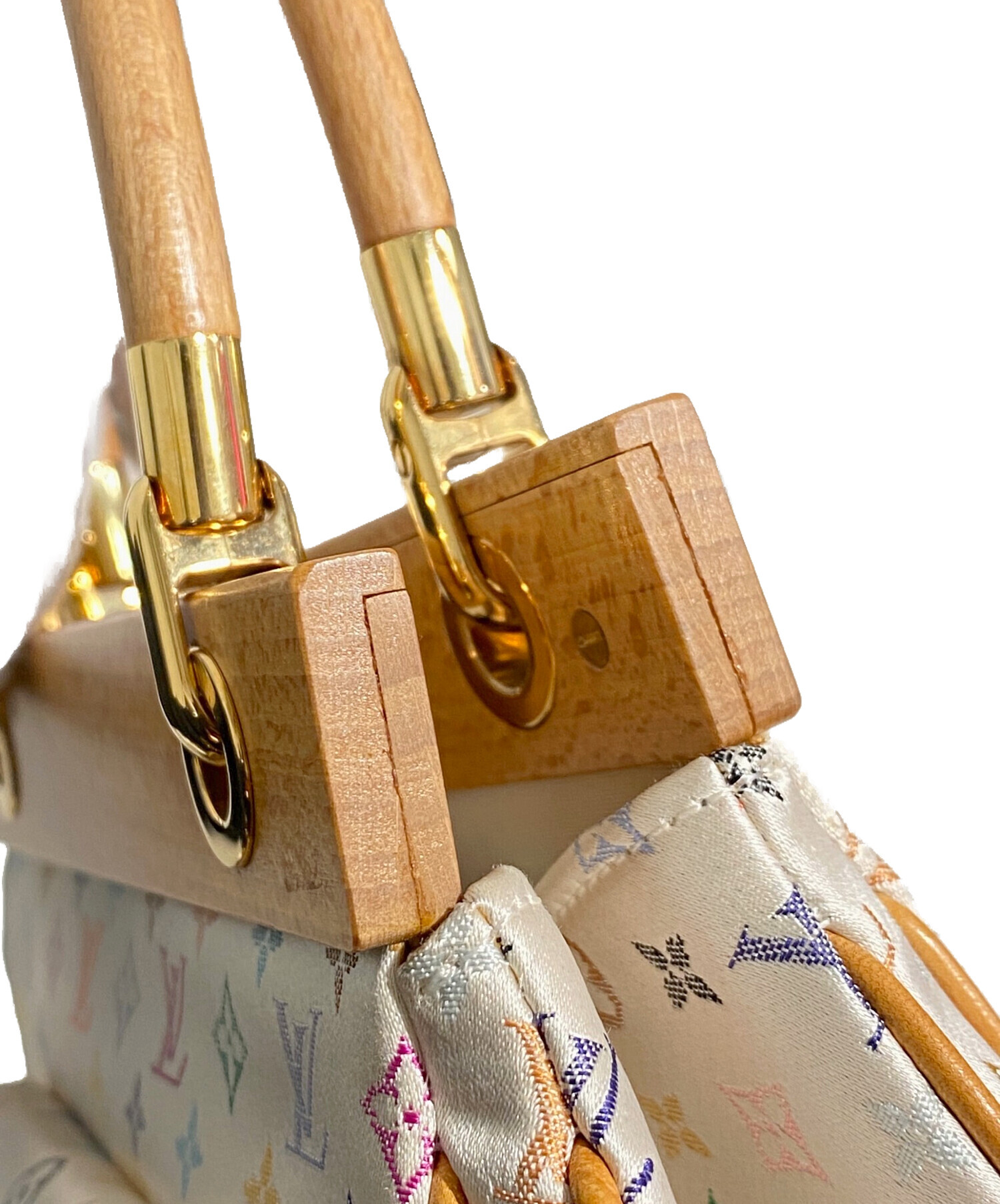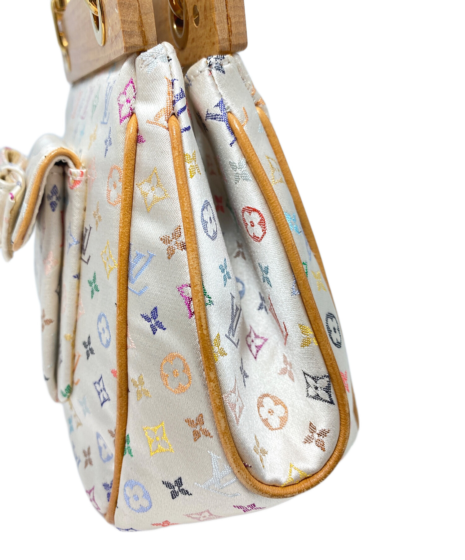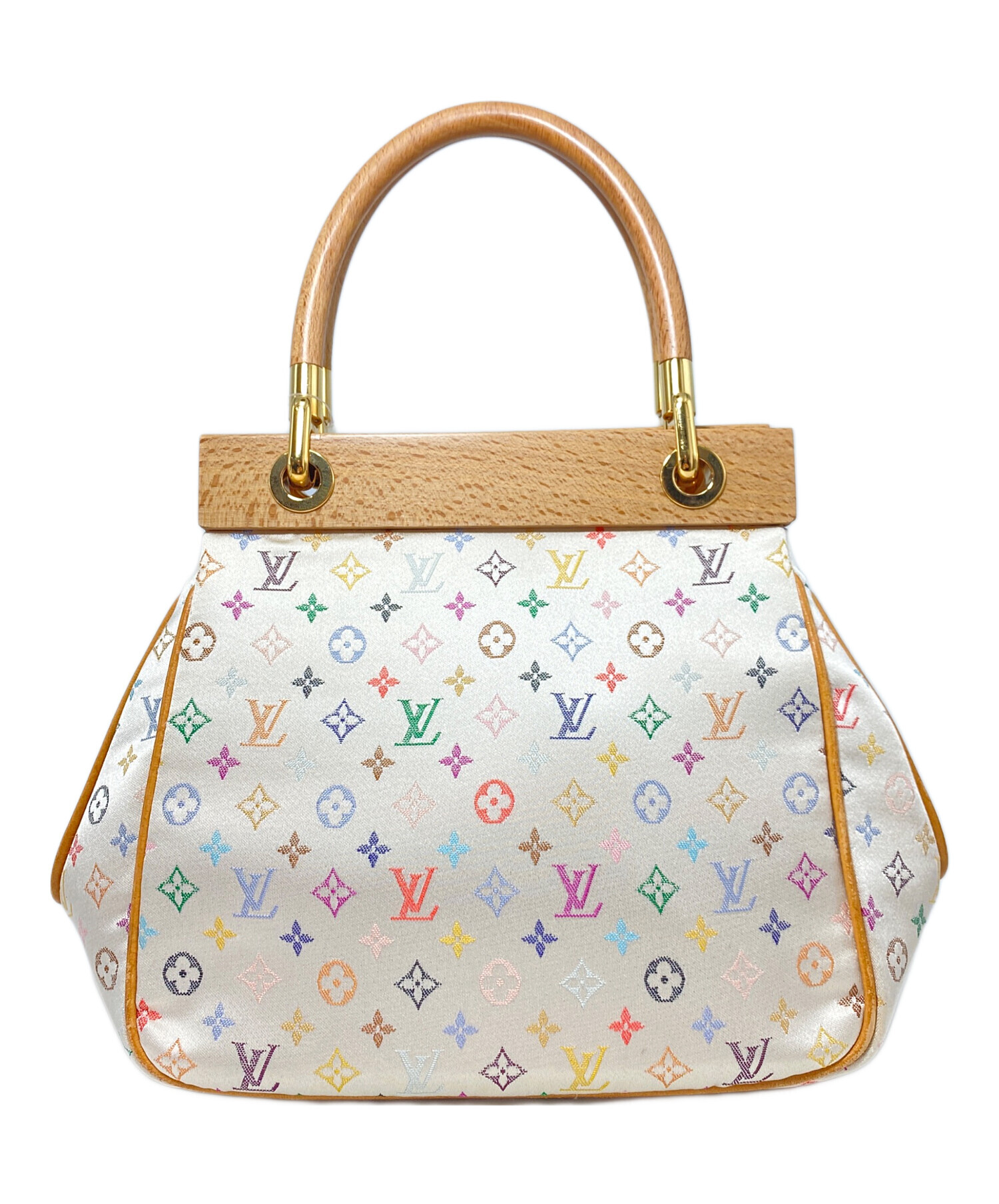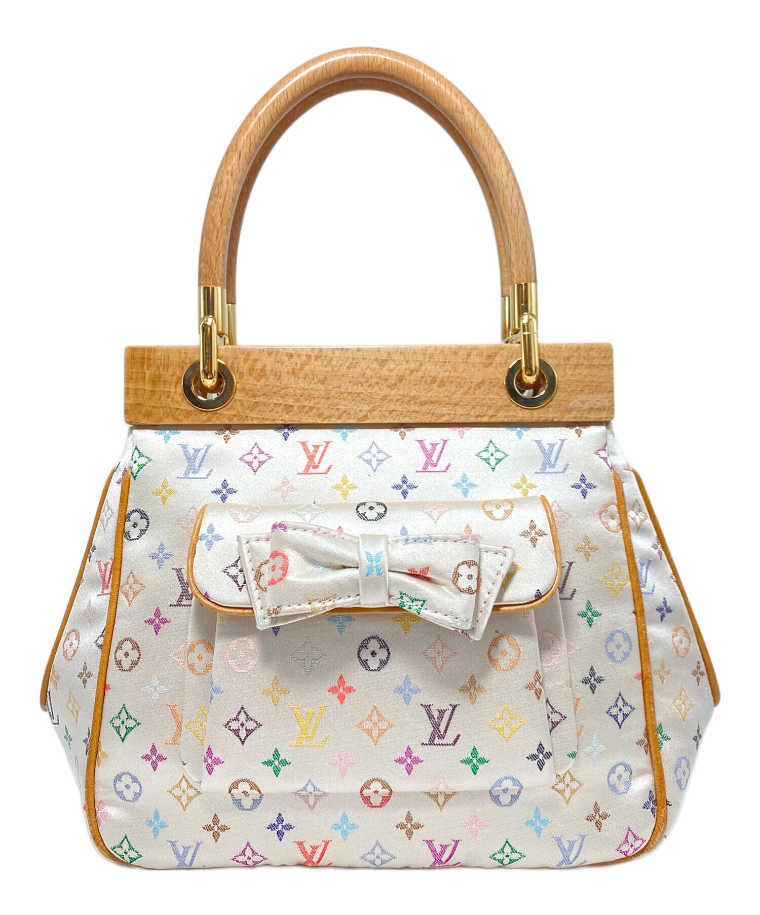 | スタッフコメント | 2004年ルイヴィトン創立150周年のコレクションに登場したモノグラムサテン・マルチカラーラインのハンドバッグです。光沢のある生地感にウッド生地の切り替えなどが豪華なディテールとなっています。小型のハンドバッグで持ち歩きやすく、コーディネートに高級感を与えてくれます。 |