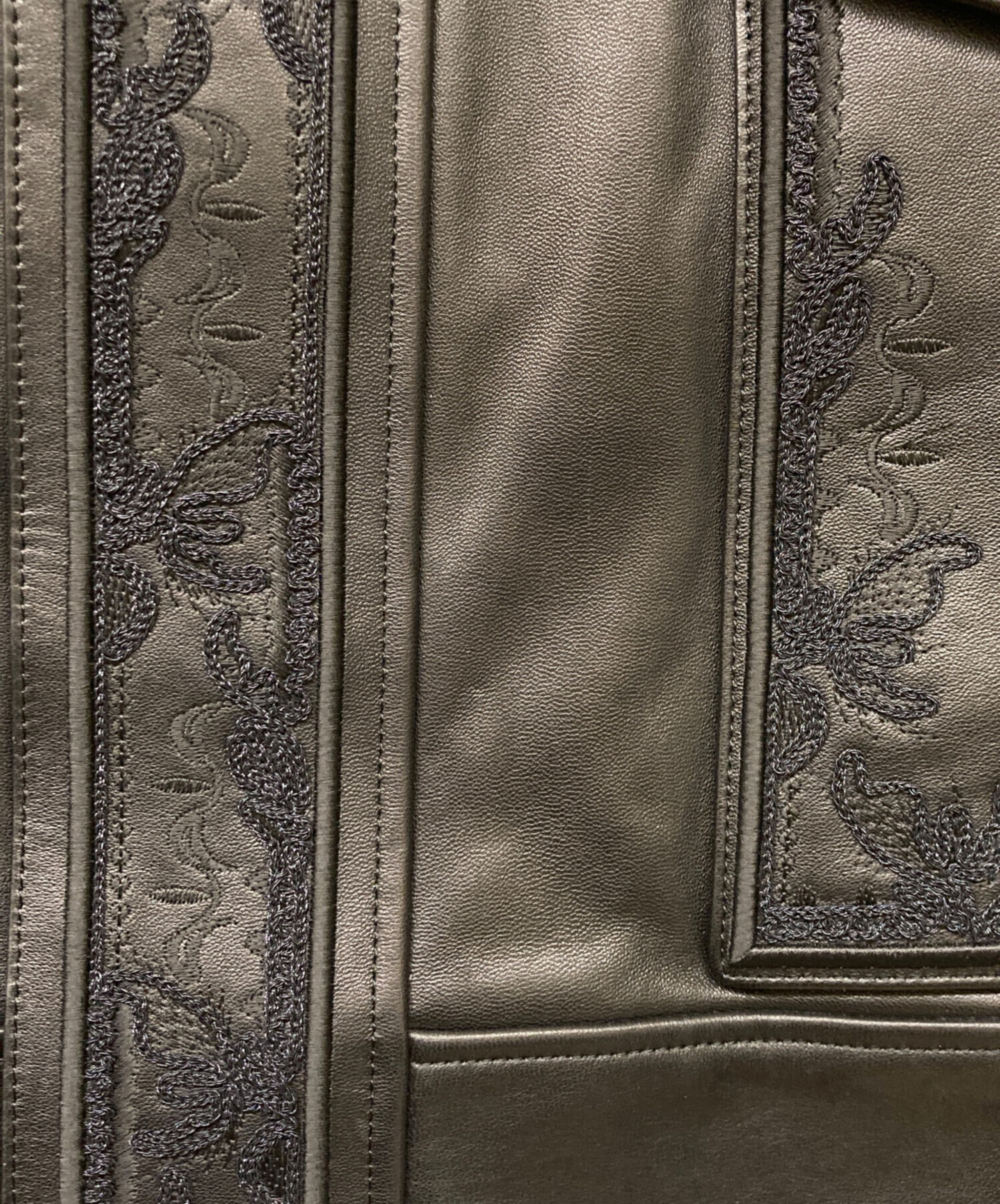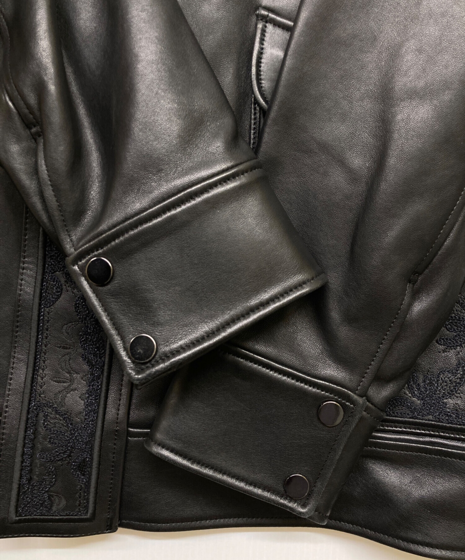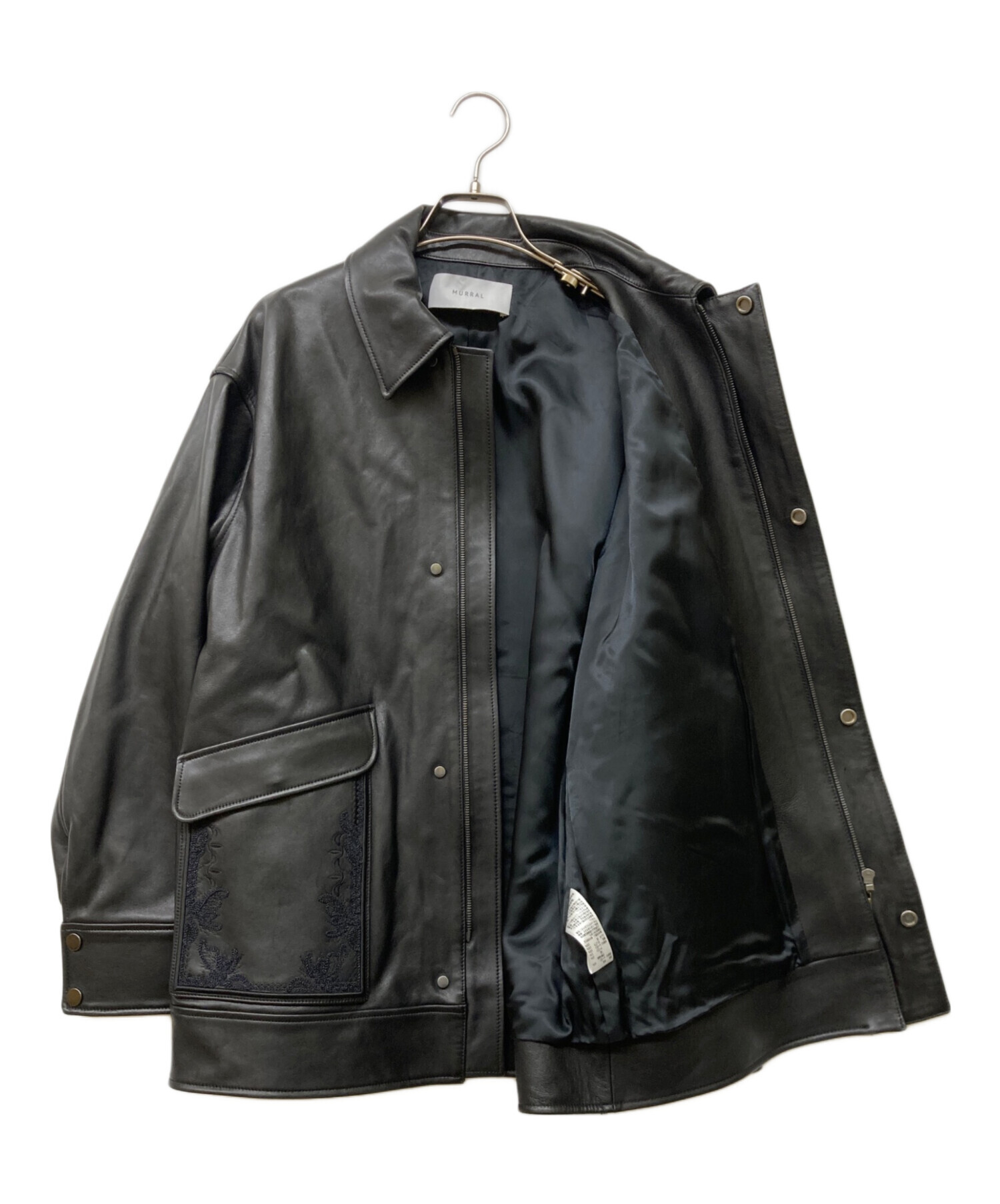 | スタッフコメント | オーバーサイズのレザージャケットです。柔らかでしっとりとした質感のレザーを使用しており、所々にあしらわれた上品な刺繍デザインがポイントです。 襟部分はチンストラップで立ち襟にする事も可能です。 |