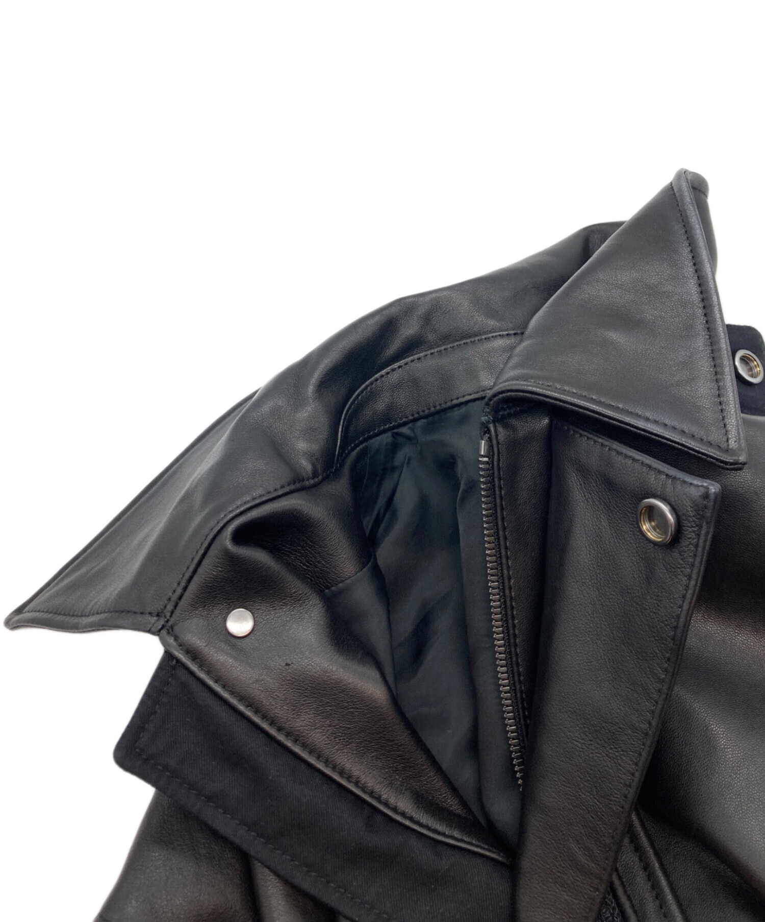 | アイテム名 | Framed embroidery leather jacket(フレームエンブロイダリーレザージャケット)/シープスキン/シープレザー/羊革/チンストラップ/2WAY/刺繍/デザイナーズ/ドメスティック/モード/カジュアル/黒 |