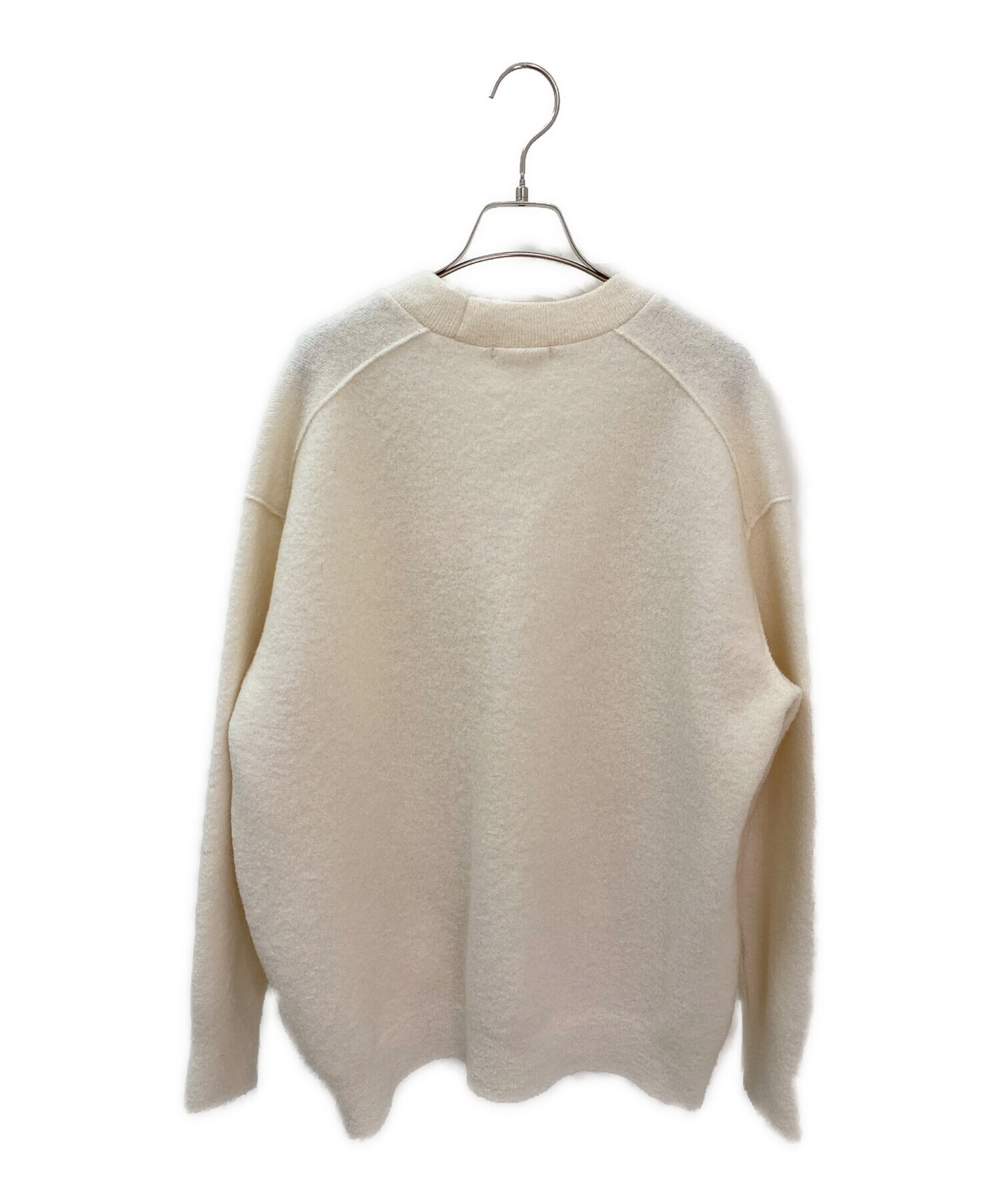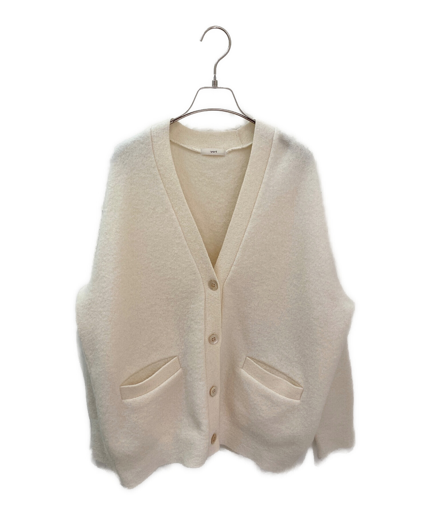 スタッフコメント ヨリのニットカーディガンでございます。ぎゅっと詰まったウールと柔らかいアイボリーの色味が暖かく包み込んでくれます。あらゆるフォルムのトップスとも相性が良い大きめのシルエットで、1枚でアウターとしても活躍します。