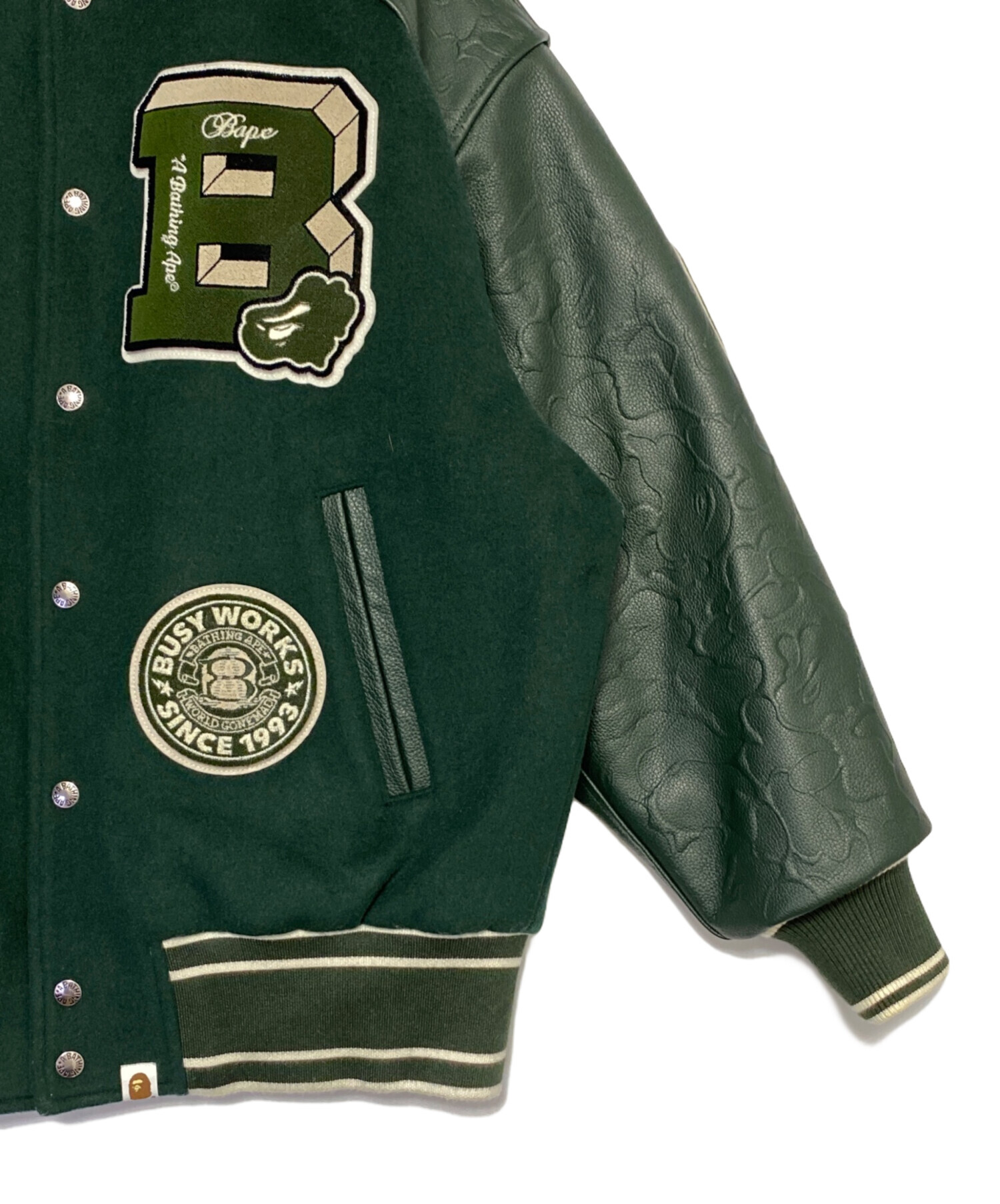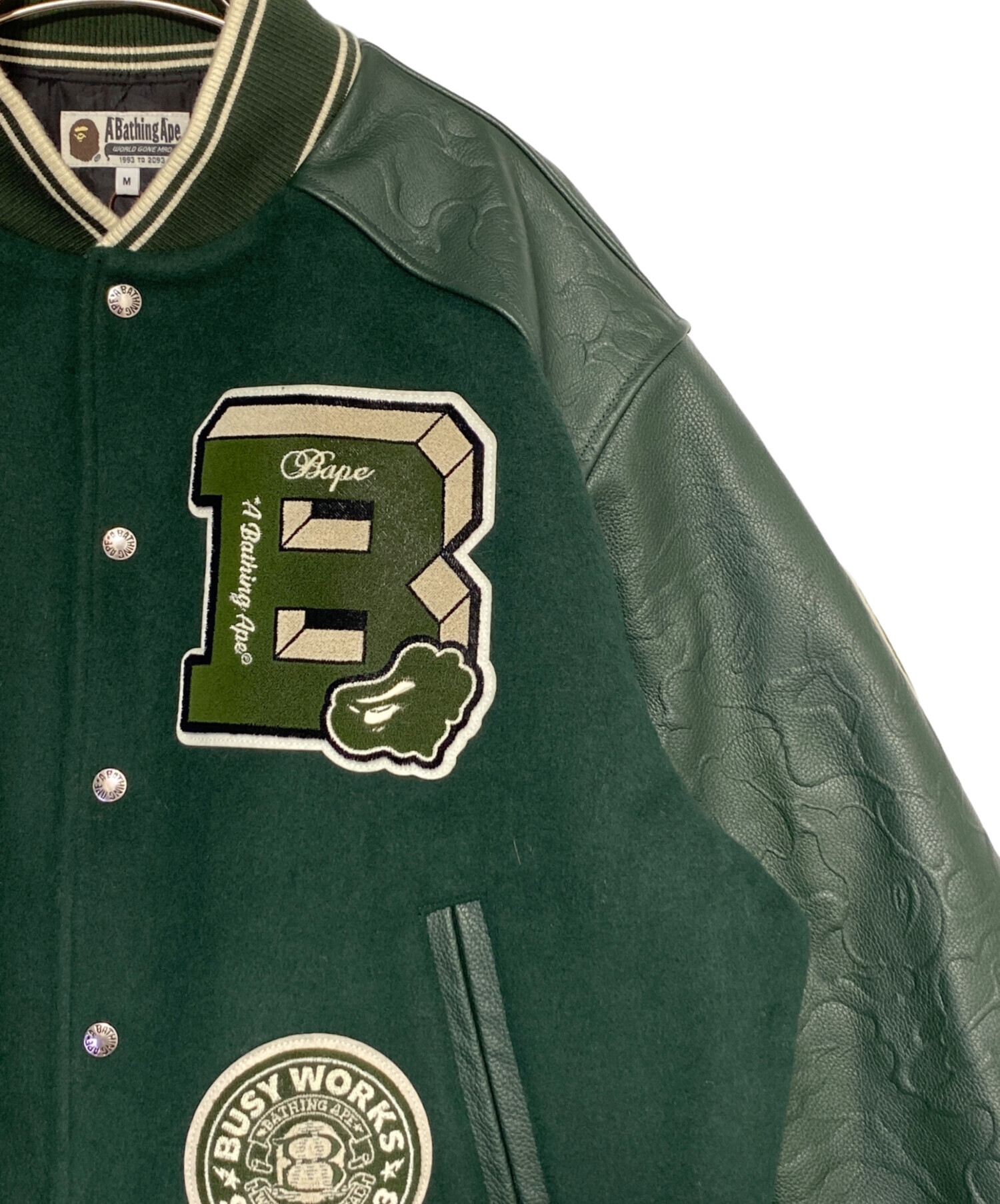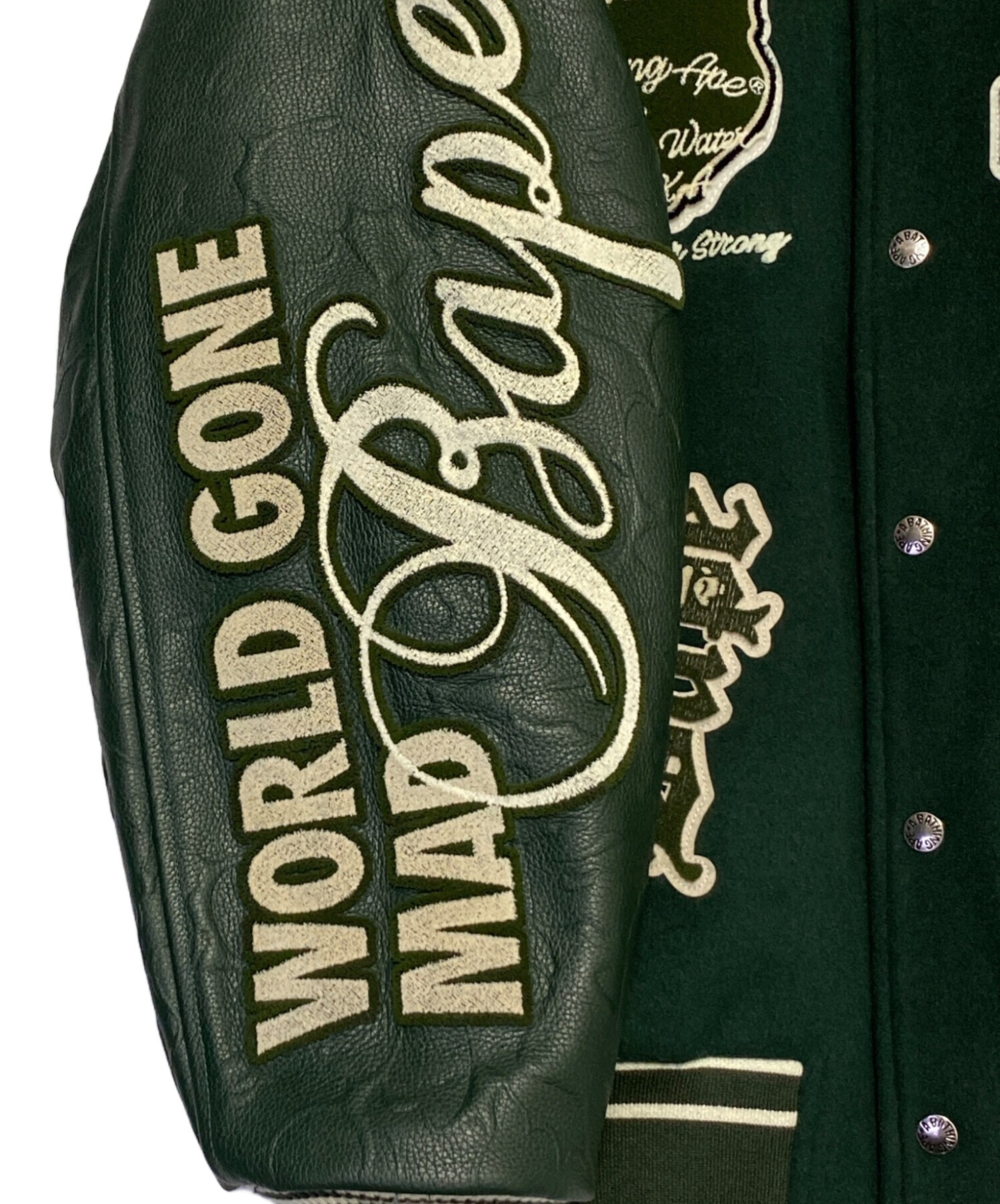 スタッフコメント 深みのあるグリーンが印象的なスタジアムジャケットです。フロントや袖に施された大胆なワッペンや刺繍がブランドらしい存在感を放ち、遊び心と迫力を兼ね備えたデザインに。しっかりとした素材感で防寒性にも優れ、ストリートスタイルを格上げするアイテムです。