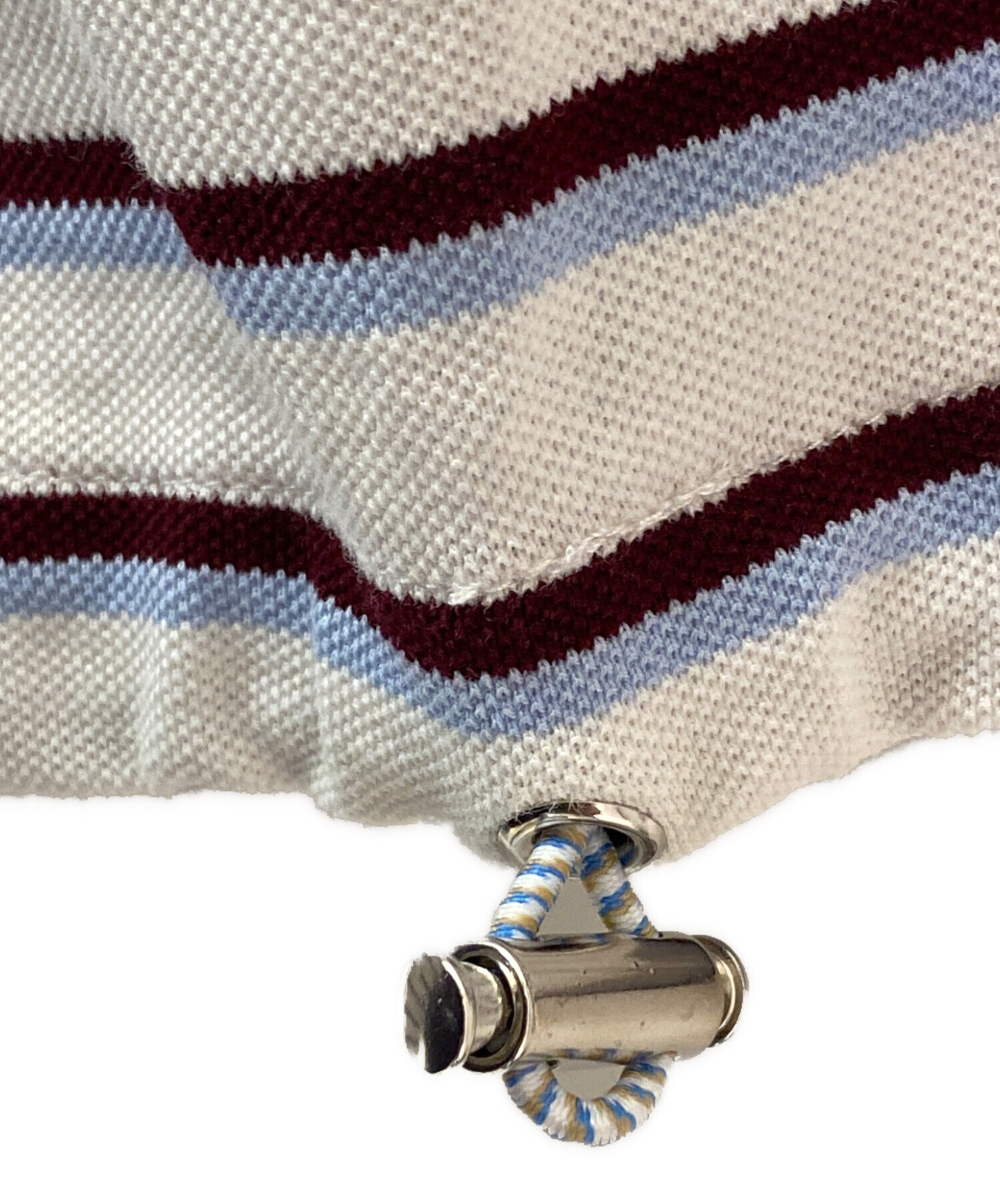 | スタッフコメント | 爽やかなボーダーデザインが目を惹くPRADAのポロシャツです。カジュアルなボーダー柄に、ブランドならではの洗練されたシルエットが合わさり、上品さのある一着に仕上がっています。裾にはドローコードが施されており、絞ることでシルエットの変化を楽しめるのも魅力です。 |