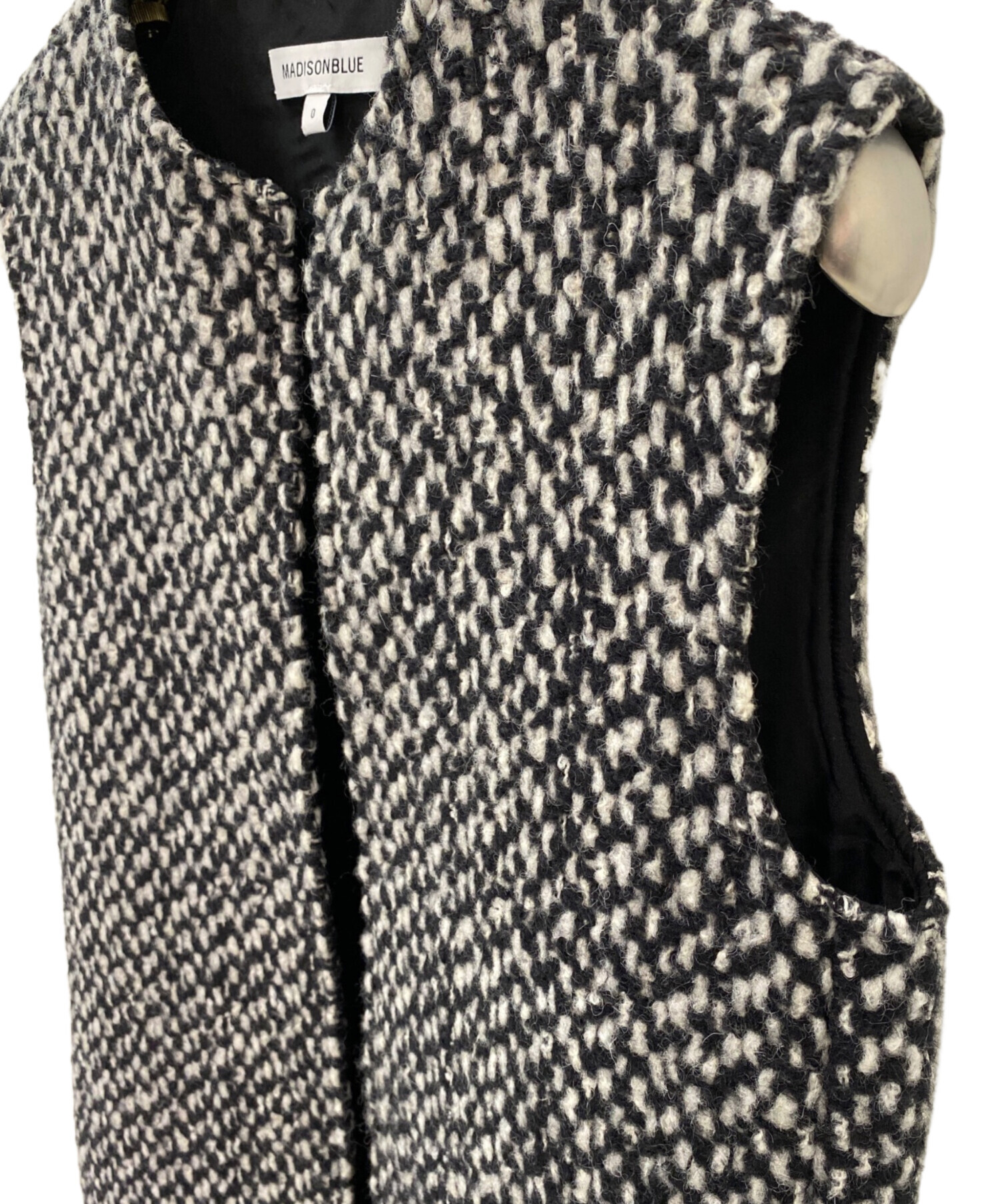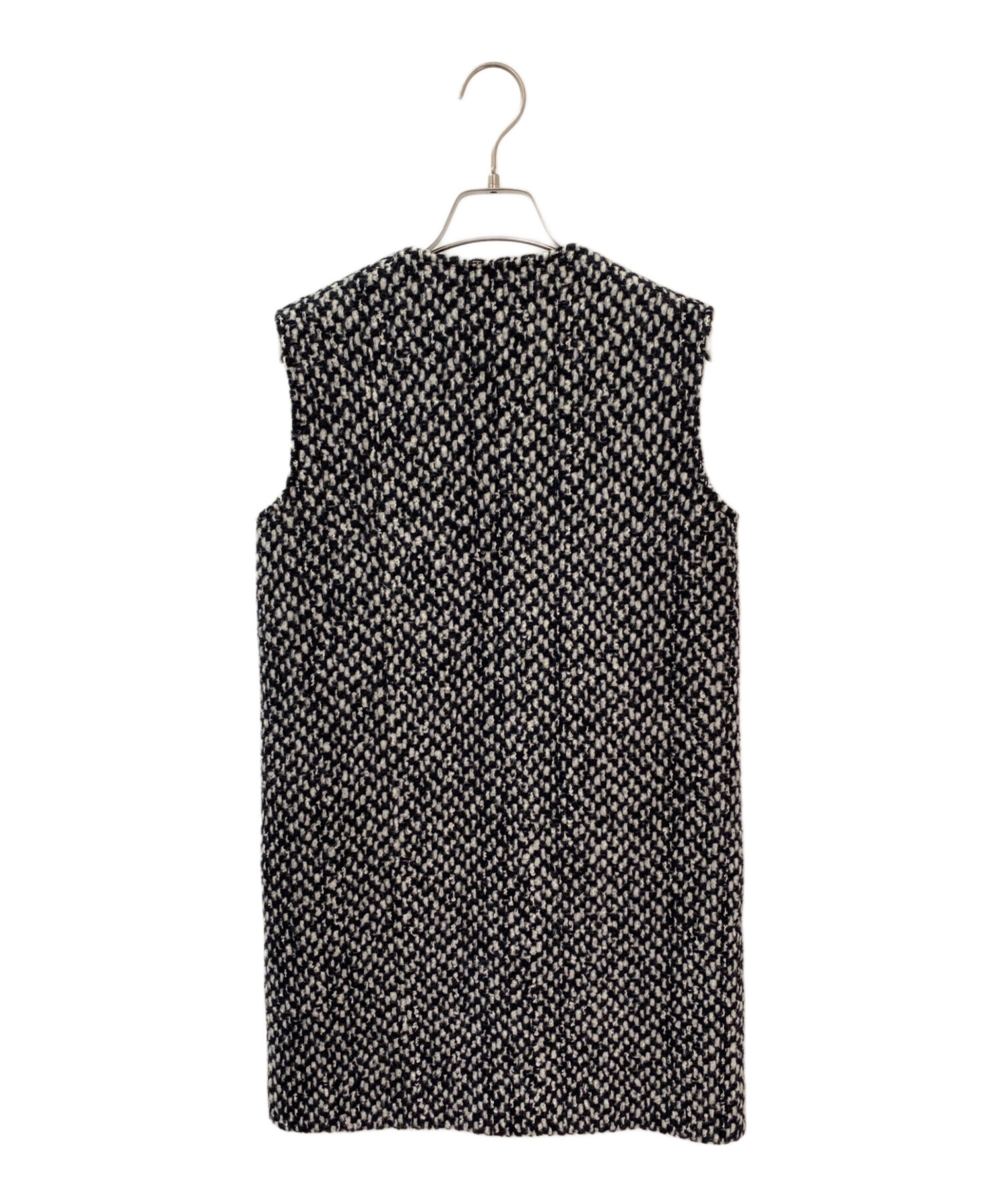 スタッフコメント 表情豊かなツイード素材を使用したジレ。ブラックとホワイトの糸が織りなすミックスカラーが、装いに奥行きを与えます。コンパクトなショルダーラインと計算された丈感が、どんなトップスともバランスよくマッチ。着こなし次第で印象を自在に変えられる一着です。デニムやシャツと合わせるだけで、さりげなく洗練されたスタイリングを演出します。