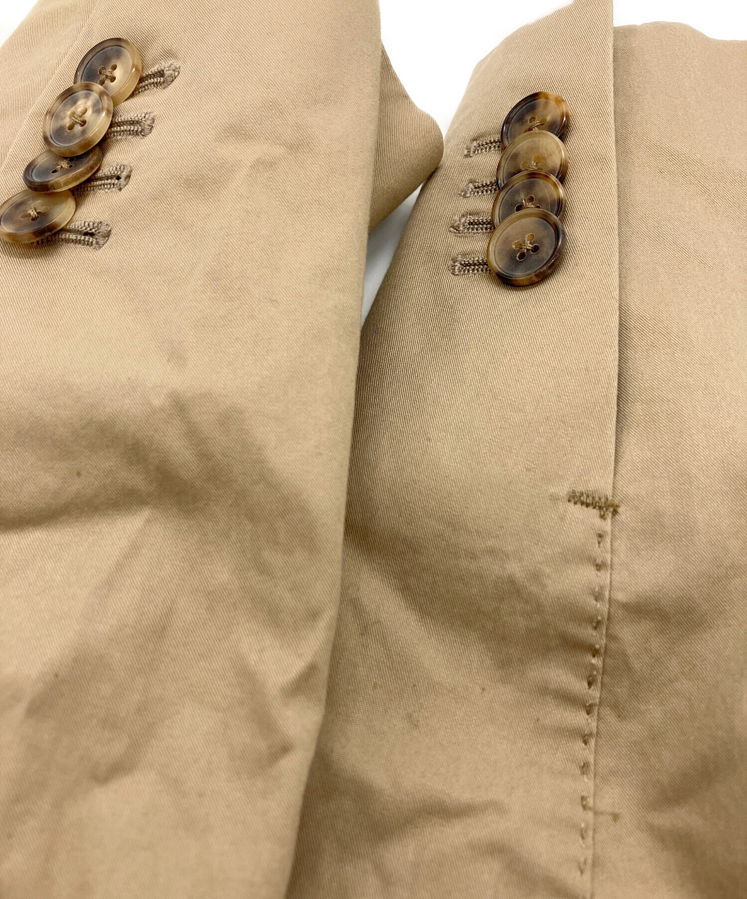 目立つシミや汚れ、におい等がある場合は商品画像や説明文にて極力表記させていただいておりますが、中古品という商品の特性上、全ての瑕疵や不備、洋服直し箇所を撮影・記載をすることは難しくなっております。また、ほとんどのアイテムは店頭と併売しておりますため、出品掲載時からコンディションが変動している場合もございます。あらかじめご了承くださいませ。