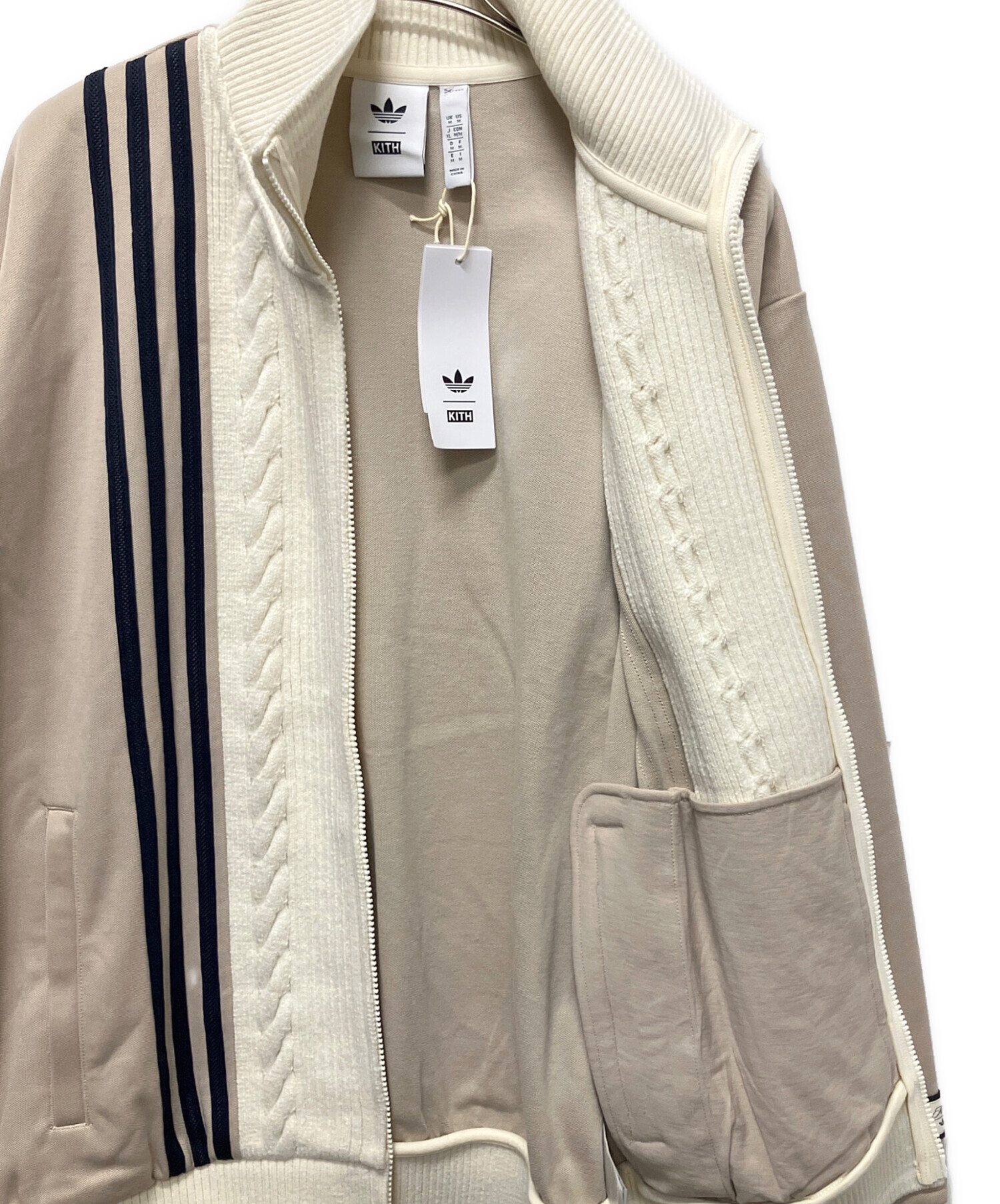 | スタッフコメント | スポーティーさと上品さを兼ね備えたデザインが魅力です。フロントのケーブルニット切り替えが立体感と温かみを演出し、両サイドのスリーストライプが程よいアクセントに。柔らかなカラーリングで主張しすぎず、カジュアルからきれいめまで幅広いスタイリングに対応します。ジップ仕様で着脱もしやすく、軽い羽織としても活躍する一着です。 |