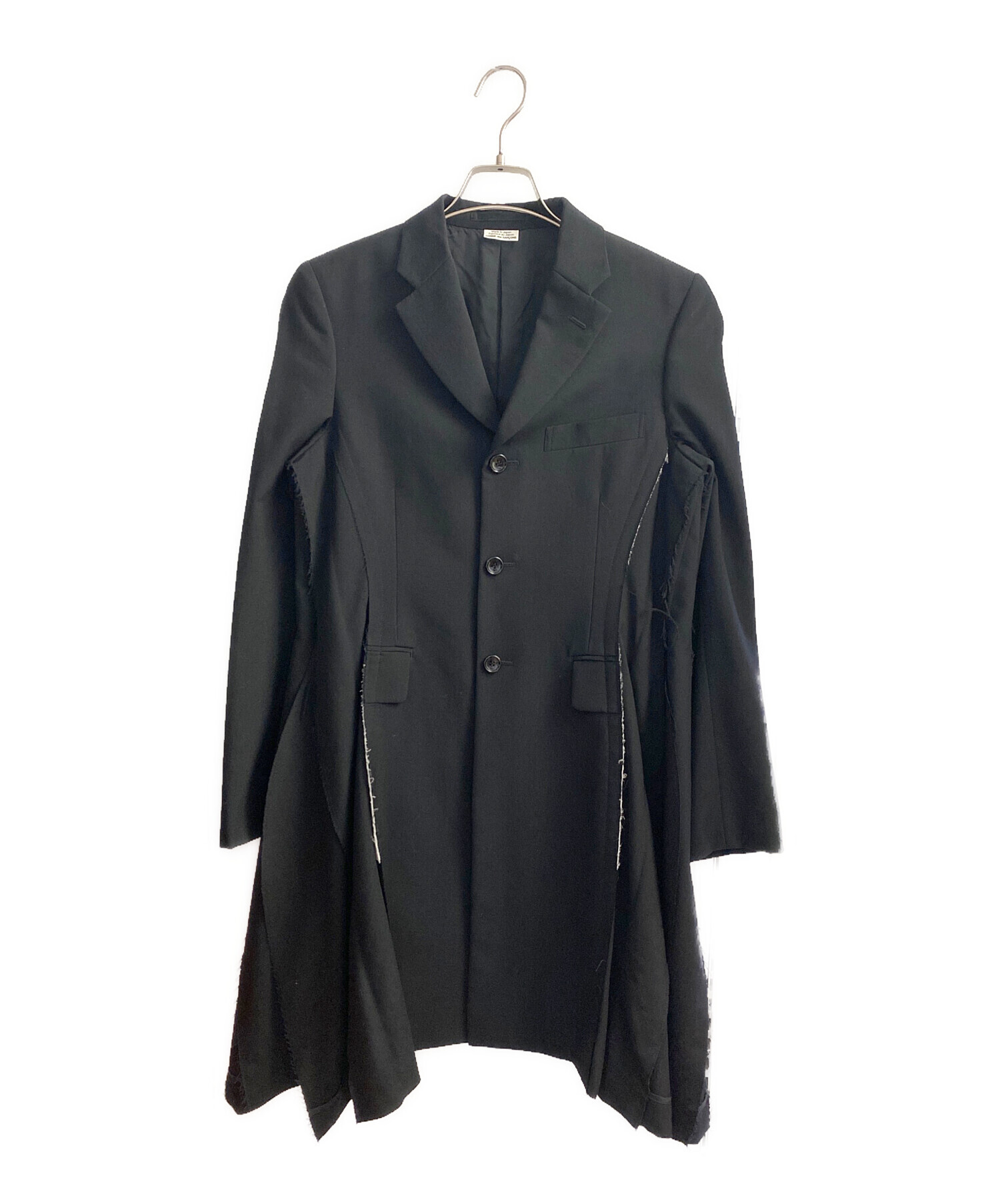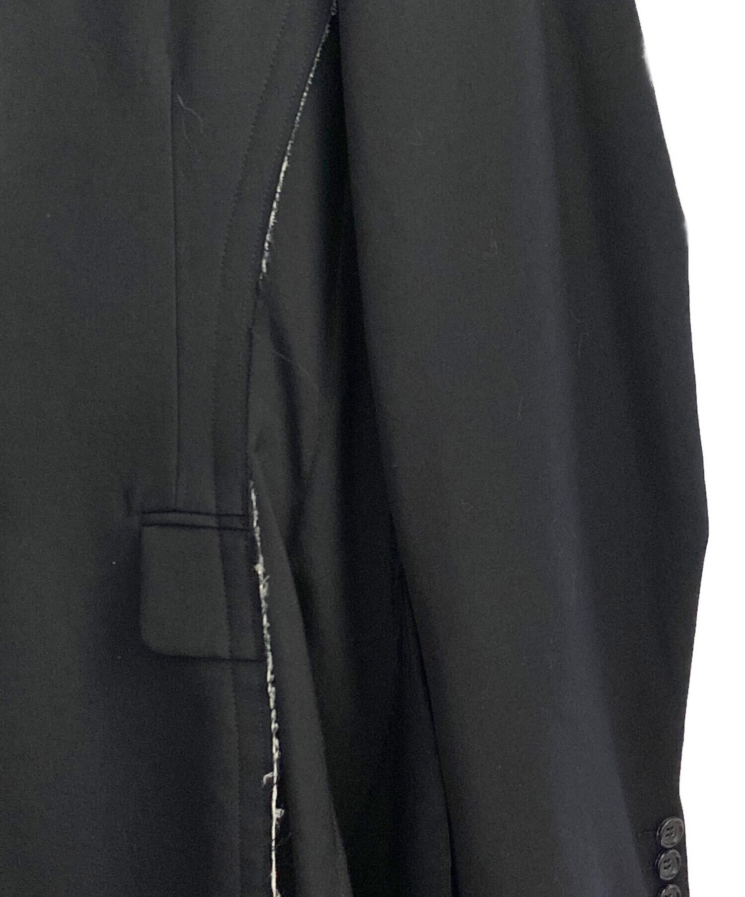 | スタッフコメント | 裁断や縫製を再構築したカットオフ仕様が特徴的なジャケットで、ブラックカラーによりデザインのエッジが際立つ一着。断ち切りによるラフさと計算されたフォルムが共存しており、シンプルなインナーと合わせるだけでもスタイリングに緊張感を与えてくれます。羽織としても主役としても成立し、コーディネート全体の印象を引き締める存在感のある一着です。 |