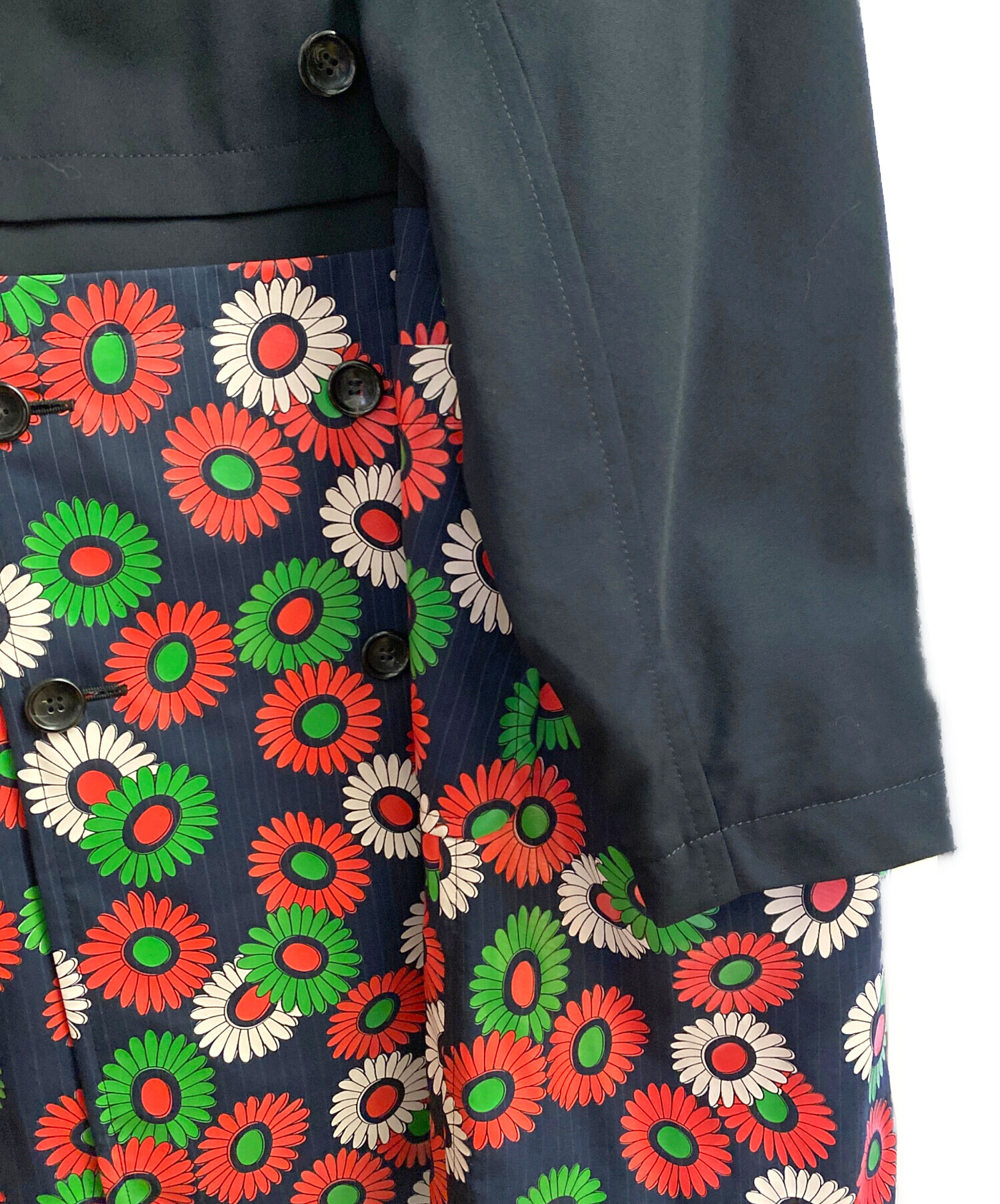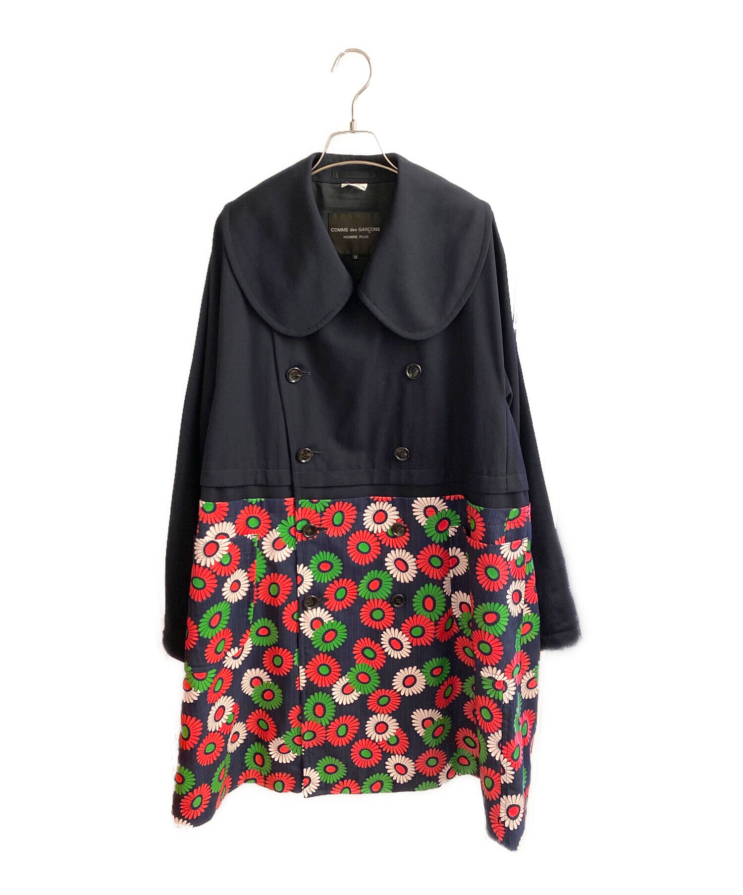 | スタッフコメント | 花柄をドッキングした大胆なデザインが目を引く丸襟コートで、ネイビー×レッドのコントラストがスタイリングに強い印象を与えます。丸襟の柔らかなディテールにより主張のあるグラフィックもバランス良くまとまり、羽織るだけでコーディネートの主役になる一着。シンプルなインナーと合わせることでデザインがより際立つ一着になります。 |