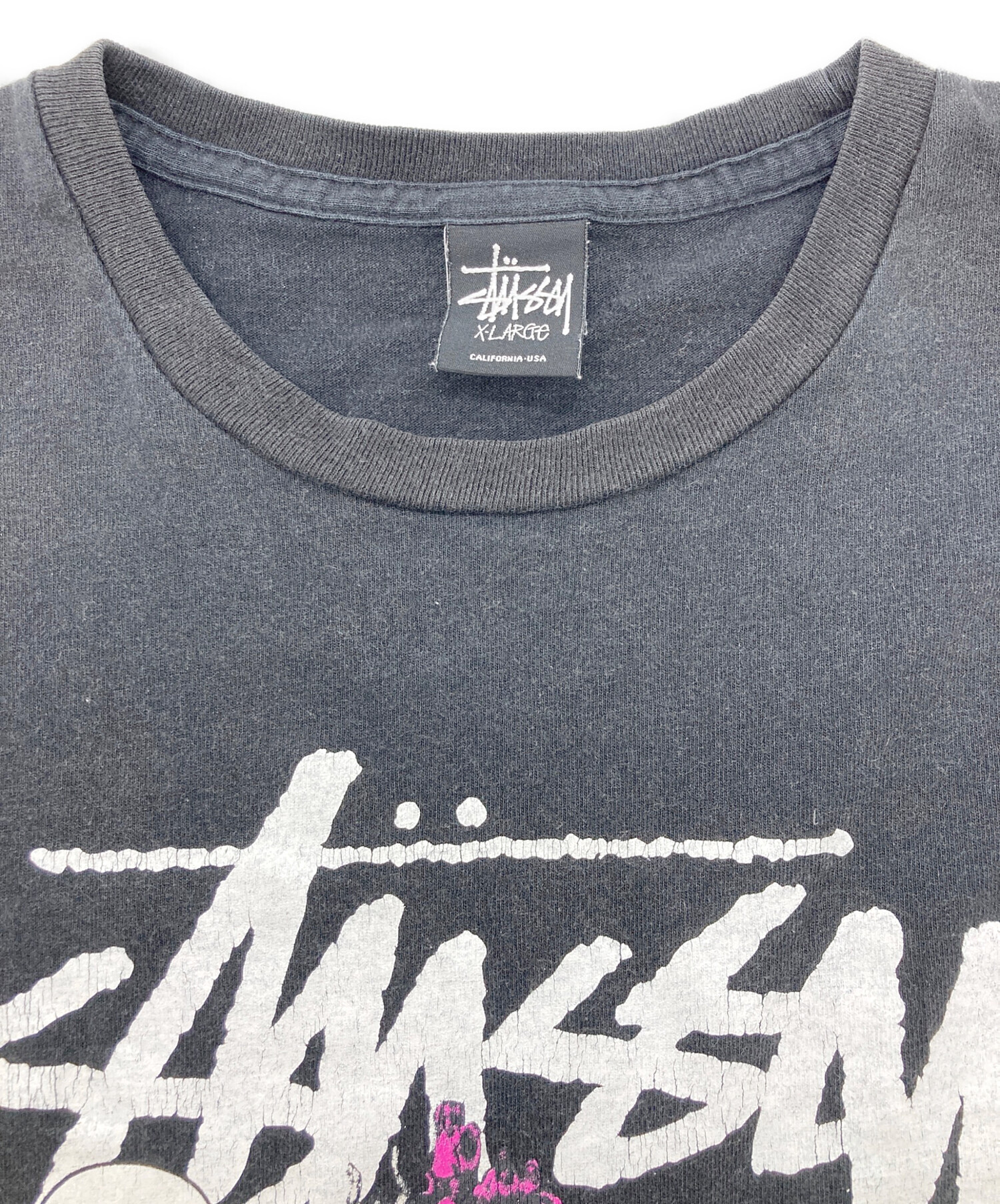 • stussy(ステューシー)stussy (ステューシー) プリントTシャツ ブラック サイズ:XLの古着・服飾アイテム ヨゴレ有
