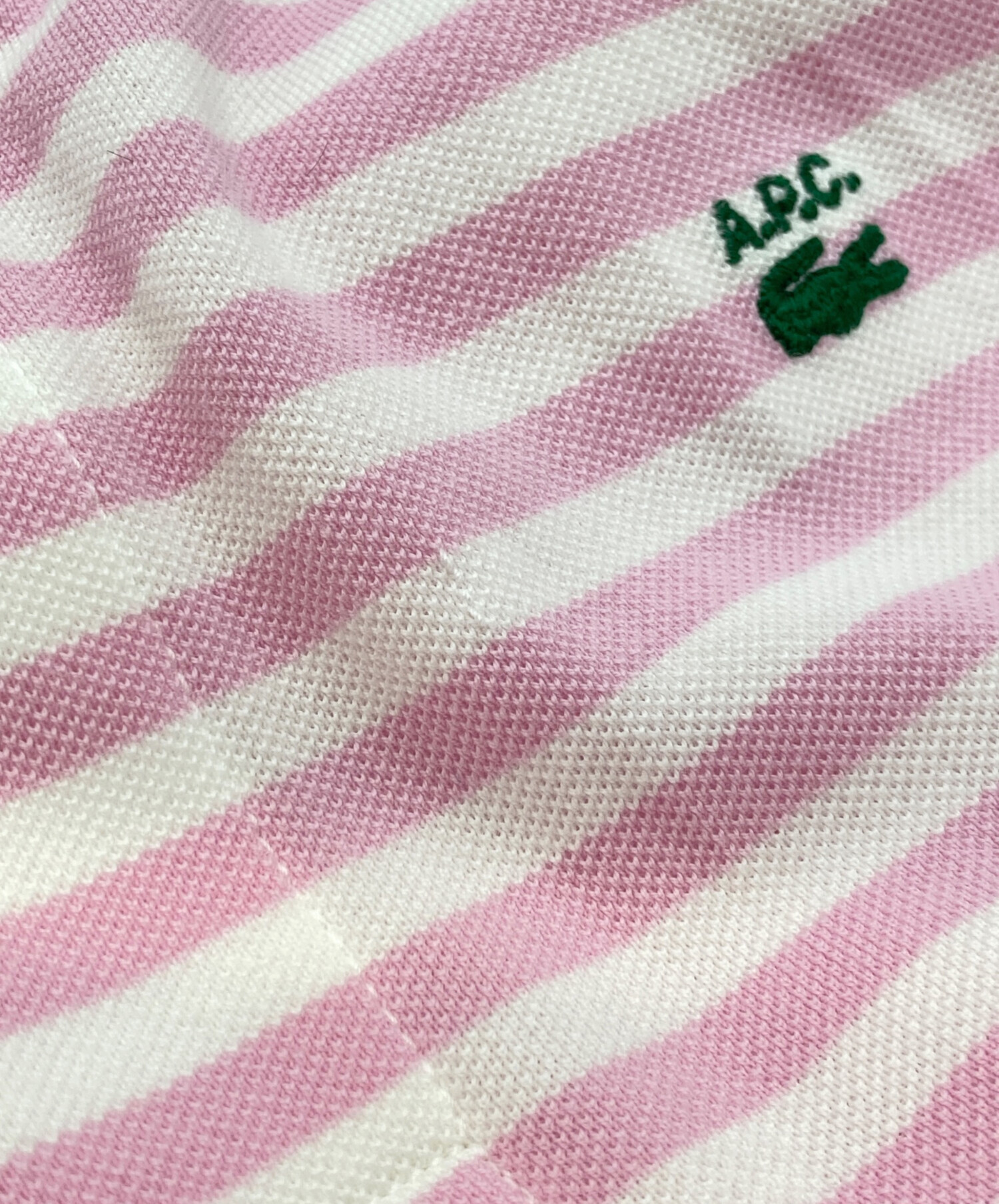 • LACOSTE(ラコステ)LACOSTE (ラコステ) A.P.C. (アーペーセー) 22SS 別注 POLO HOMME 鹿の子ポロシャツ ホワイト×ピンク サイズ:Sの古着・服飾アイテム フロントツレ有