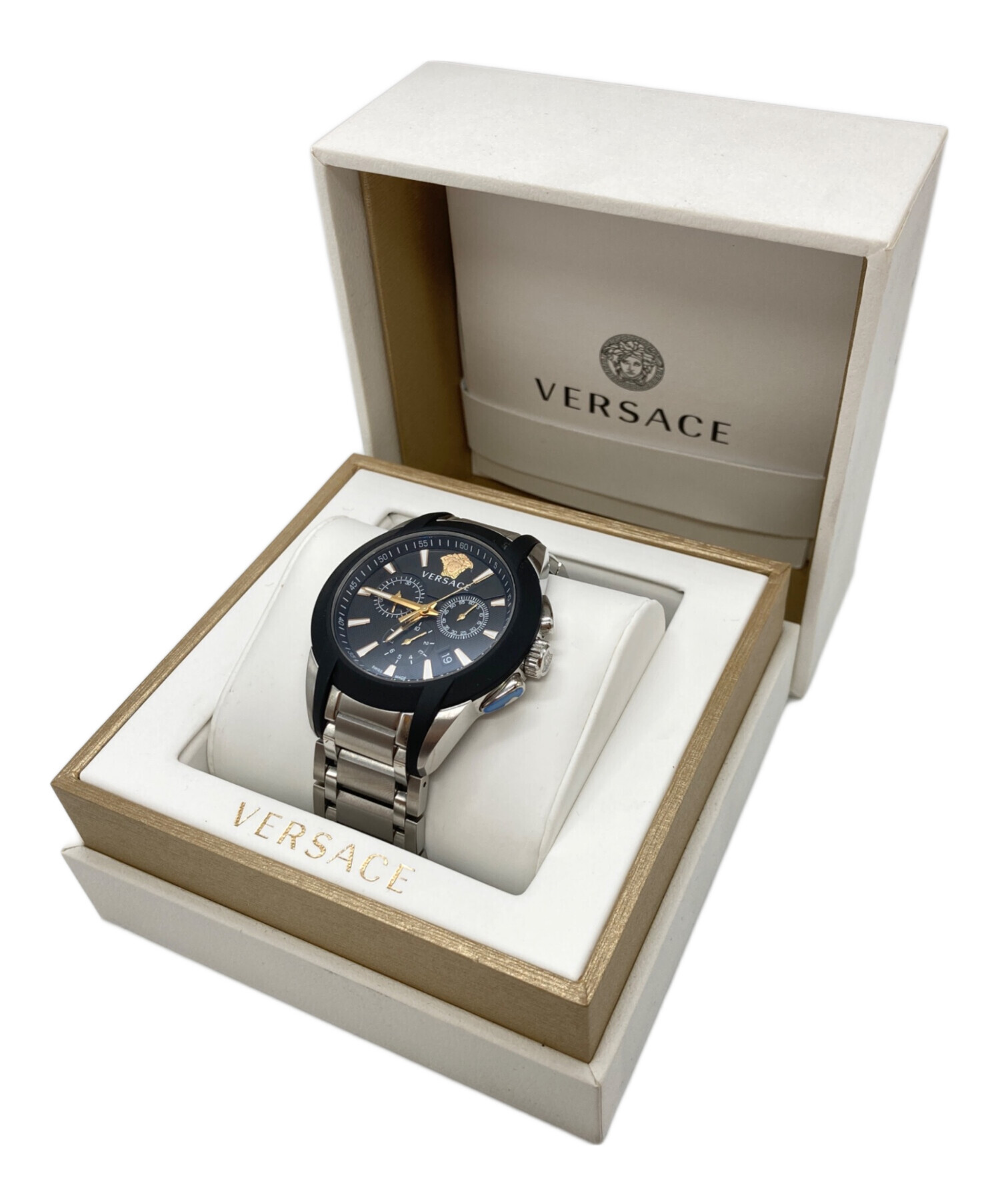 | スタッフコメント | ブラックの文字盤にゴールドと白のインデックスとメデューサをモチーフにしたデザインが、力強さとエレガンスさを併せ持ち、存在感のあるクロノグラフ腕時計。ステンレススチールブレスレットで、ビジネスシーンでもカジュアルシーンでも大胆なアクセントとして活躍します。 |