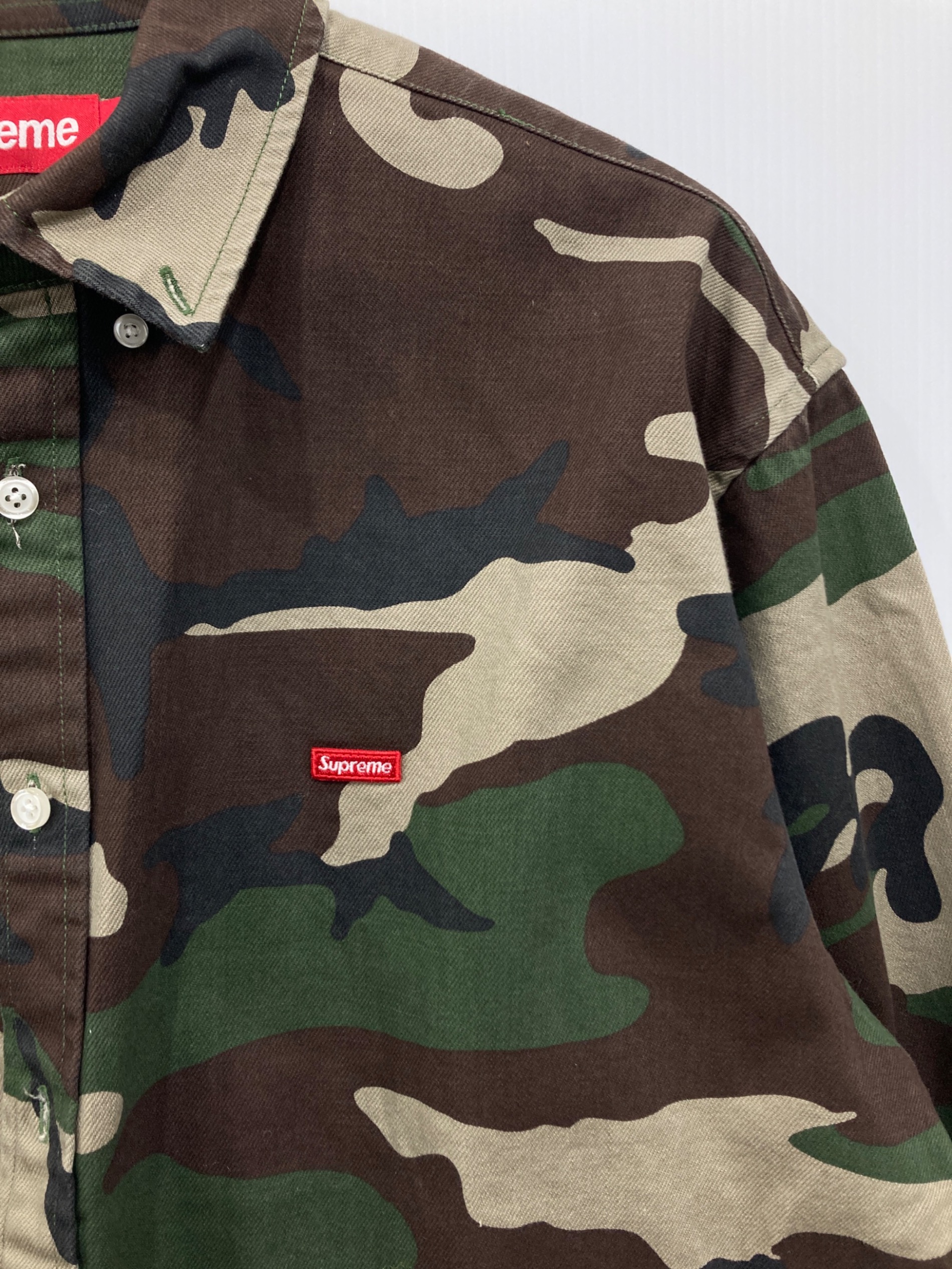 • SUPREME(シュプリーム)SUPREME (シュプリーム) ウッドランドカモデニムシャツ カーキ サイズ:Mの古着・服飾アイテム 襟元スレ
