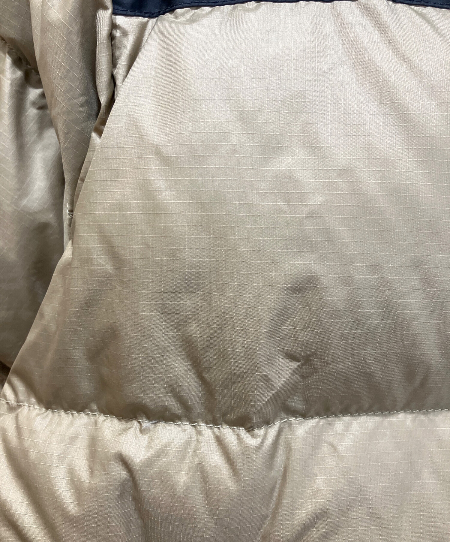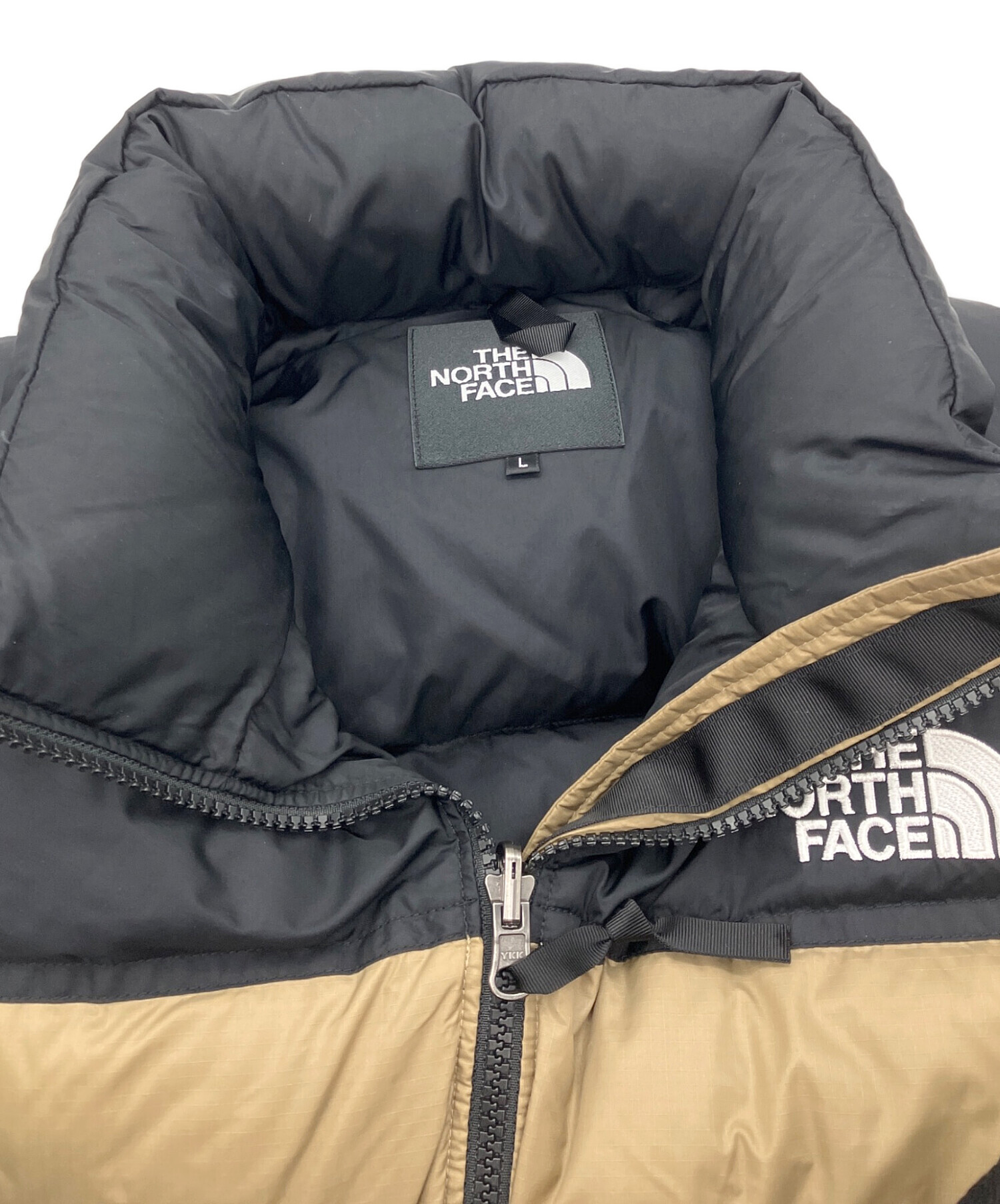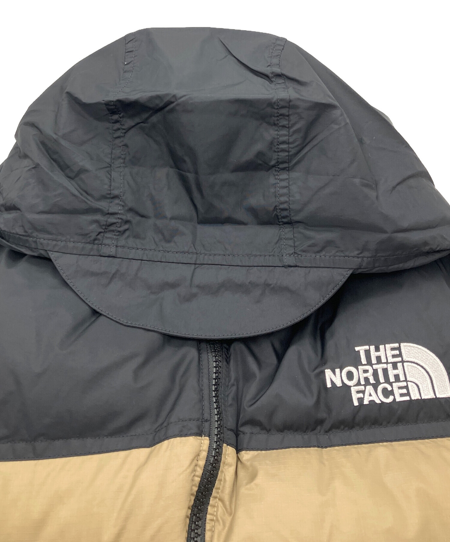 • THE NORTH FACE(ザ ノース フェイス)THE NORTH FACE (ザ ノース フェイス) SHORT NUPTSE JACKET ショートヌプシジャケット ベージュ×ブラック サイズ:Lの古着・服飾アイテム 正面右側シミ有り