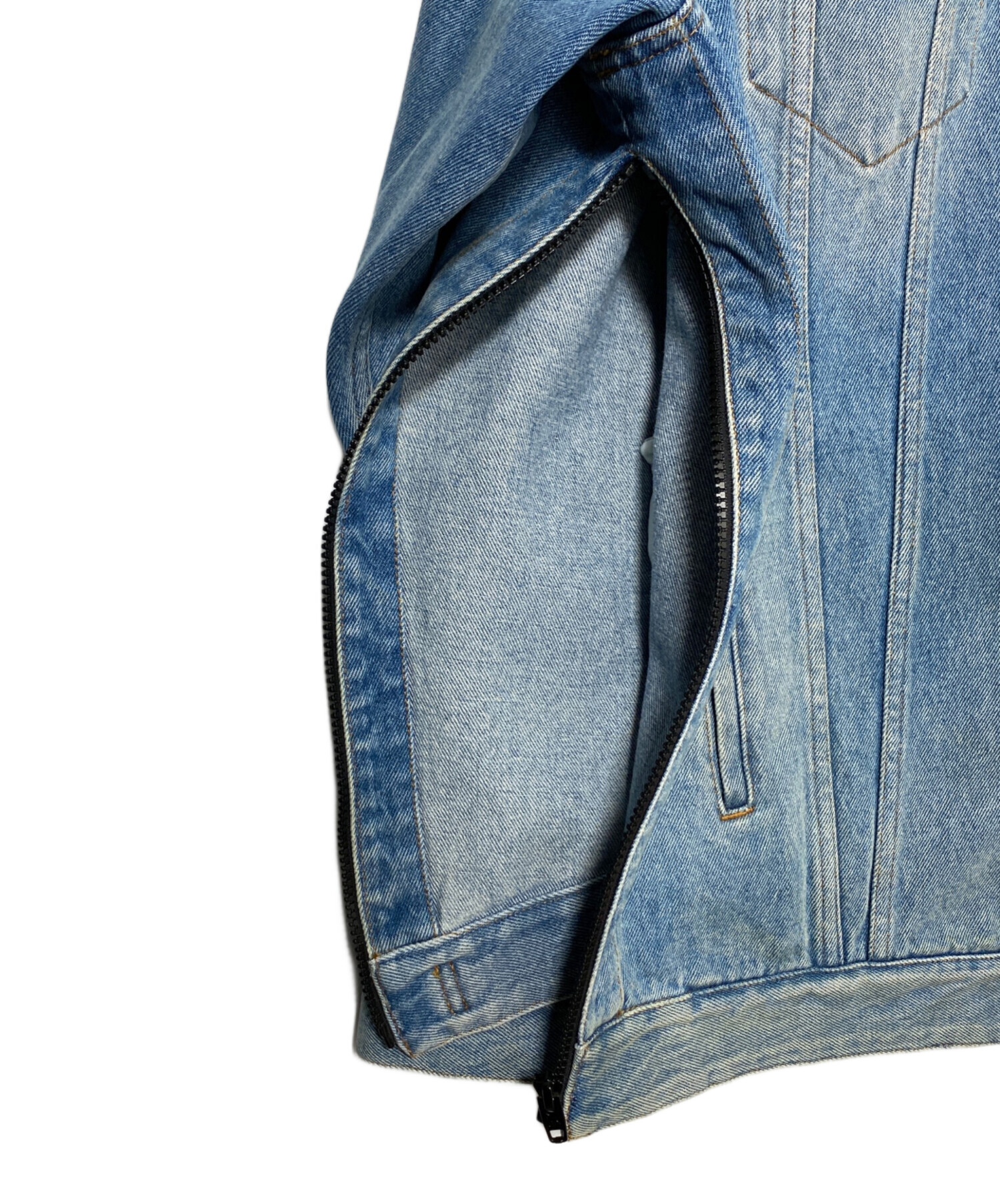 | スタッフコメント | フロントのジップとボタン、さらにサイドジップを備えたディテール豊かなデニムジャケット。シンプルかつ重厚感あるデザインが特徴で、一目で印象に残る存在感を放ちます。サイドジップによりシルエットの変化や着こなしの幅も広がり、機能性とファッション性を高次元で両立しております。 |