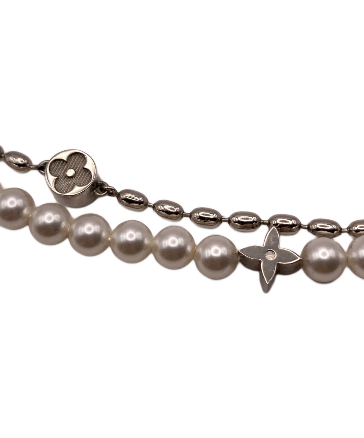 | スタッフコメント | 古典的なパールに現代的なひねりを加えたルイ・ヴィトンならではのデザインが魅力です。メタリックなビーズと艶やかなガラスパールを組み合わせることで、伝統的な上品さとエッジィな雰囲気を両立させています。ダブルチェーンなどの凝った構造に、LVイニシャルやモノグラム・フラワーといったメゾンの象徴的なモチーフがさりげなく散りばめられており、細部にまでこだわりが光ります。 |