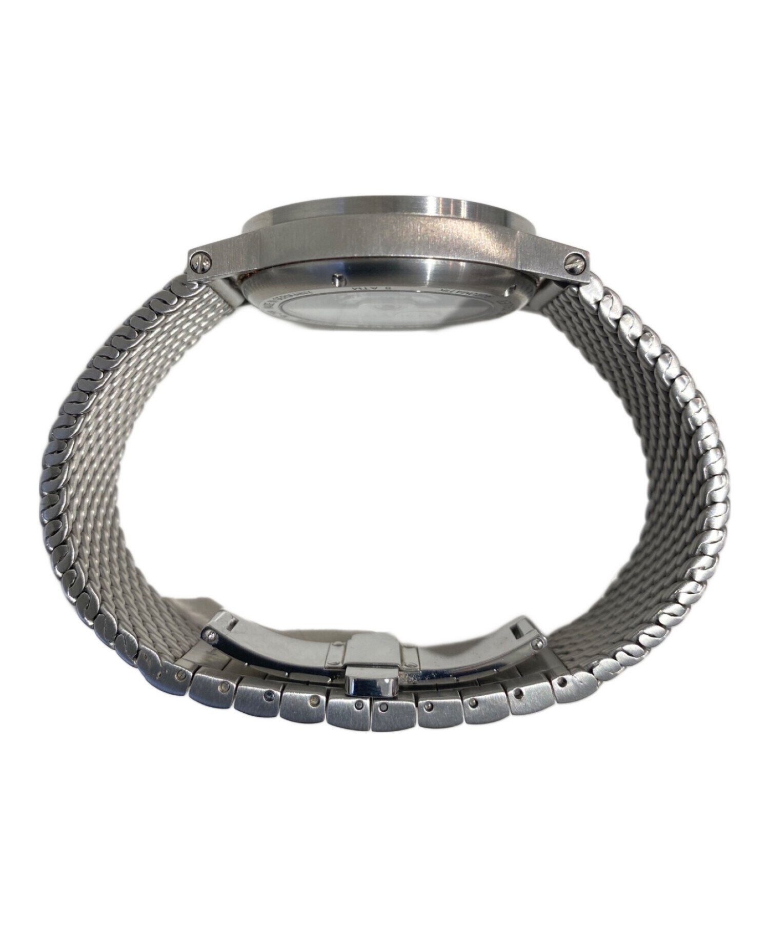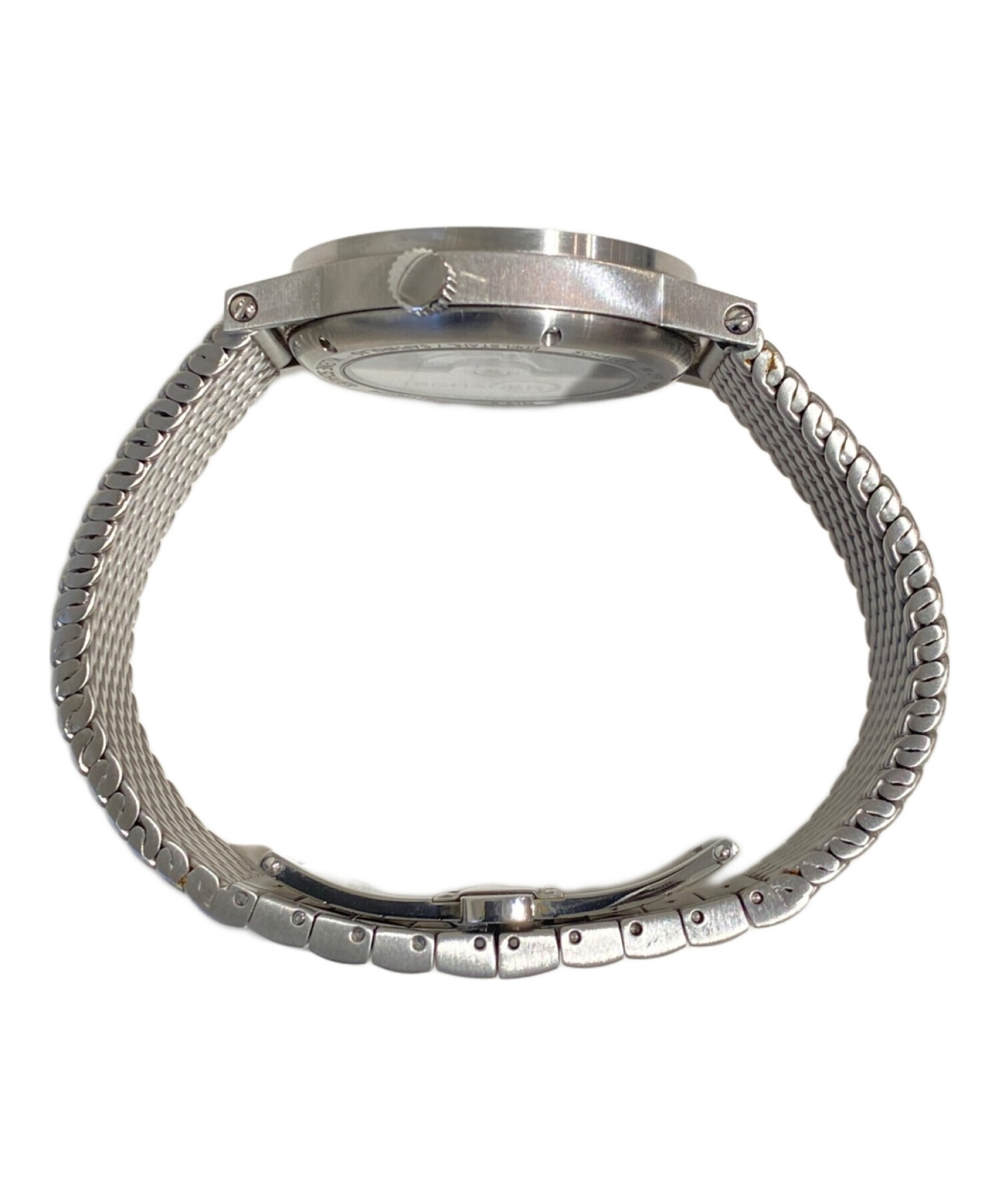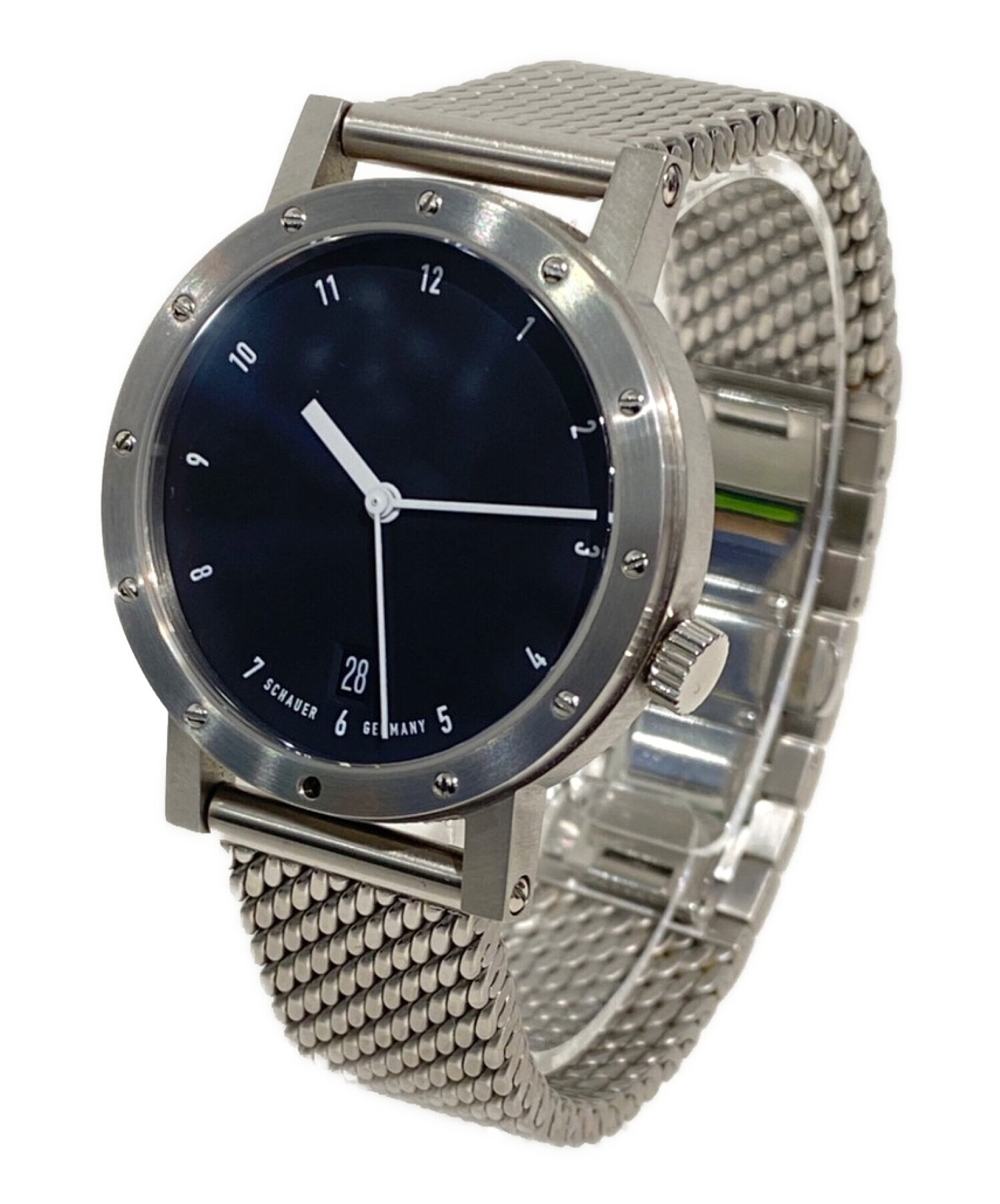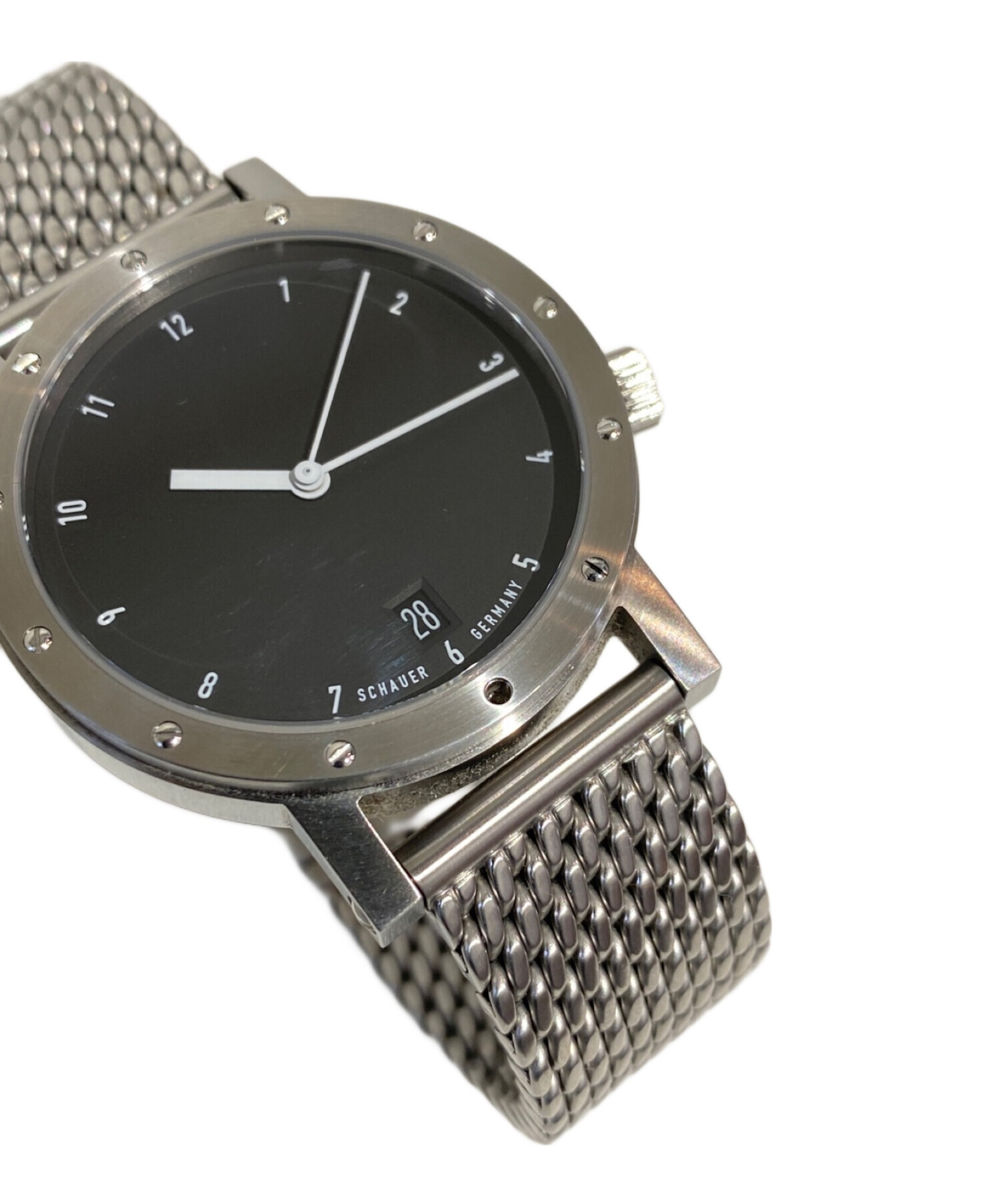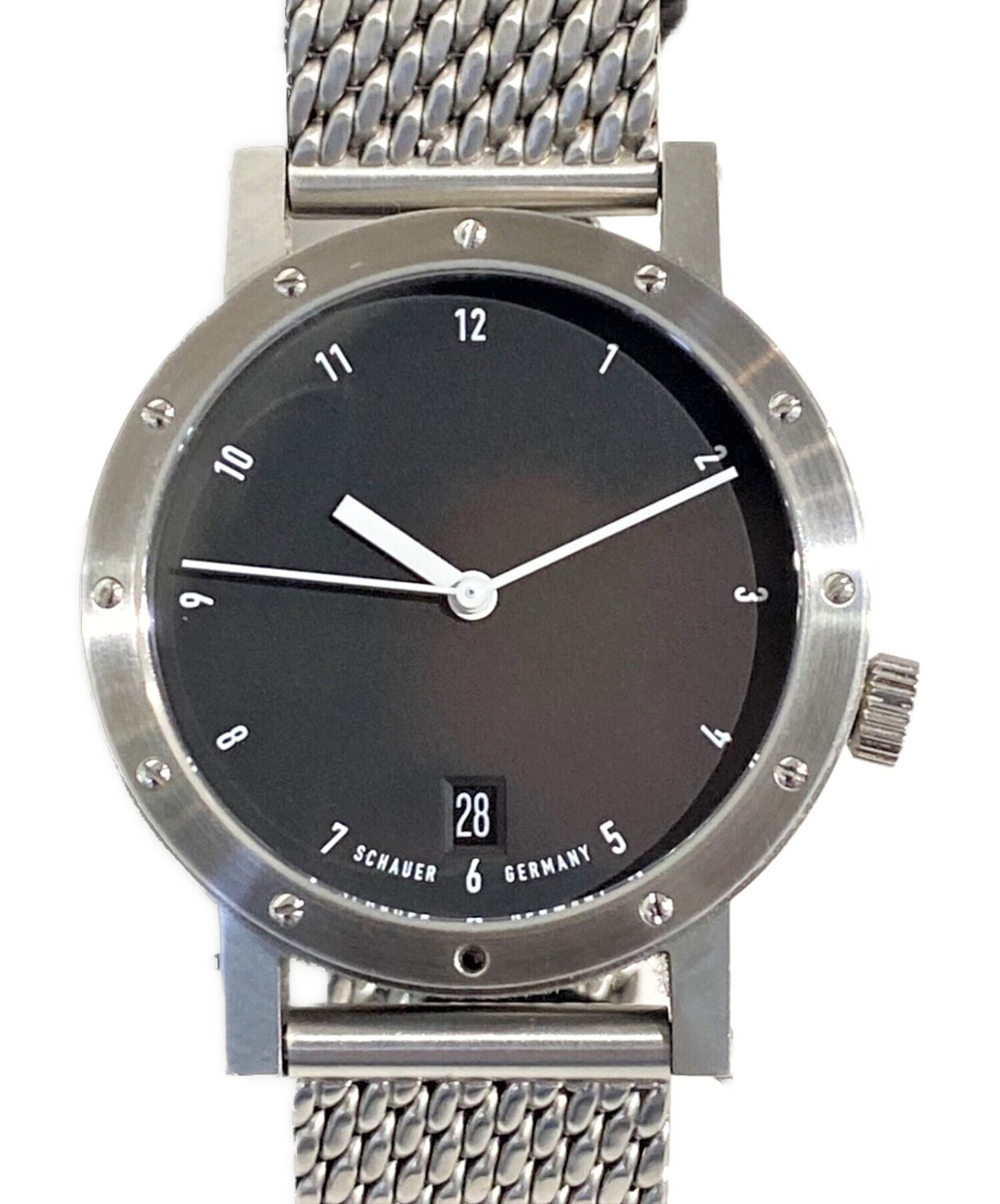 | スタッフコメント | 美しく磨かれたベゼルに12個のビスが打たれたステンレススチールの腕時計でございます。シャウアーの中では小ぶりで薄いモデルとなっており、気軽にご着用いただけます。シンプルなデザインですが、洗練されておりコーデを格上げしてくれるアイテムです。 |