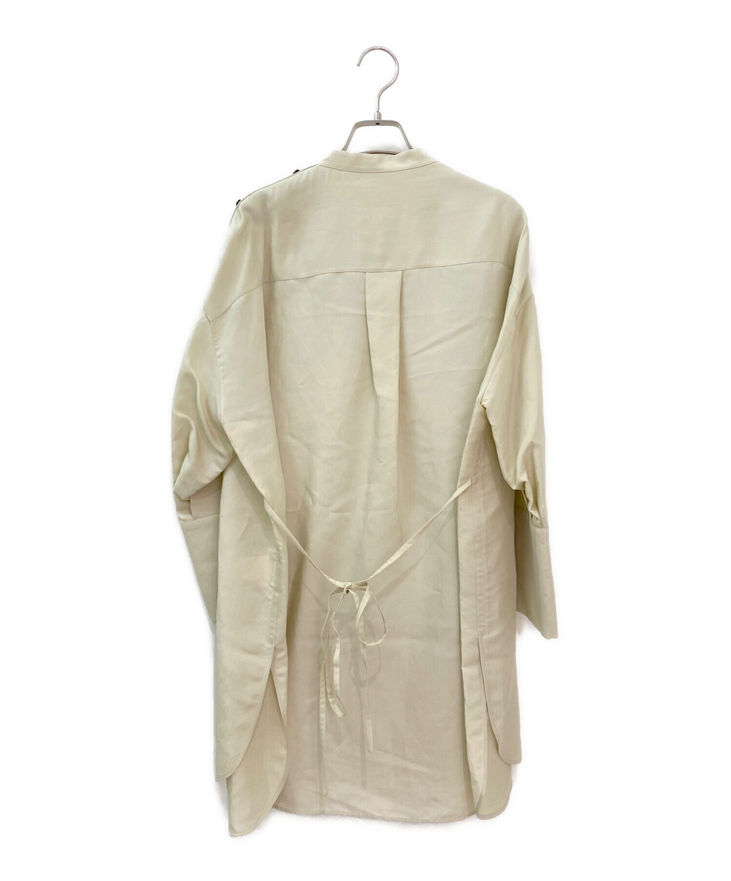 | スタッフコメント | フロントと同じボタンが両袖にもあしらわれたシャツになります。 落ち感のあるつるっとした素材を使用しております。背中のリボンは後ろで結んでシルエットの変化をお楽しみ頂けます。 膝あたりまでくるワンピース丈で、サイドにはスリットが入っている為、ボトムスを合わせたレイヤ―ドスタイルがおすすめです。 |