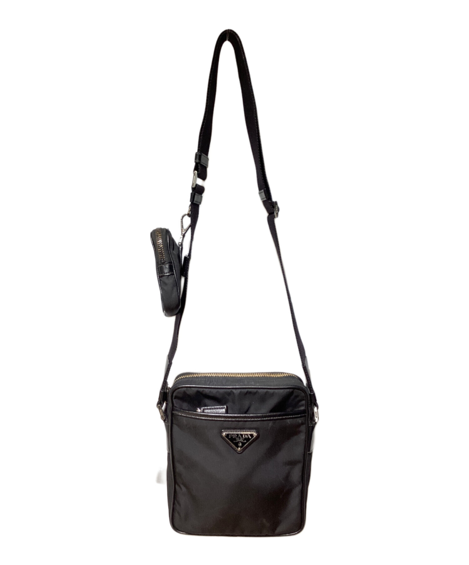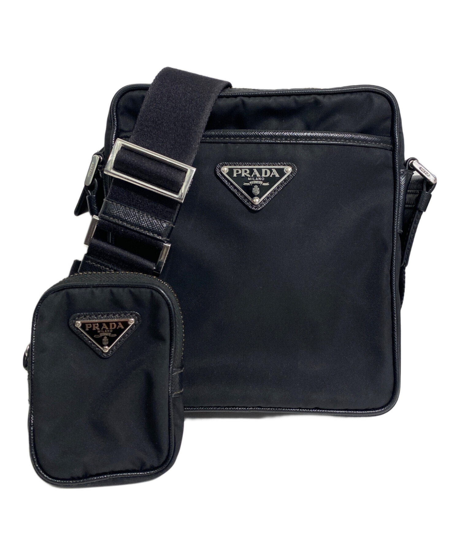 スタッフコメント PRADA定番のRe-Nylonシリーズのスクエアショルダーバッグでございます。フロントにあしらわれたアイコニックなメタルトライアングルロゴが特徴的です。小物入れに便利な外ポケット、ショルダーストラップに取り外し可能なミニポーチ付きでコンパクトなサイズながら収納力に優れています。