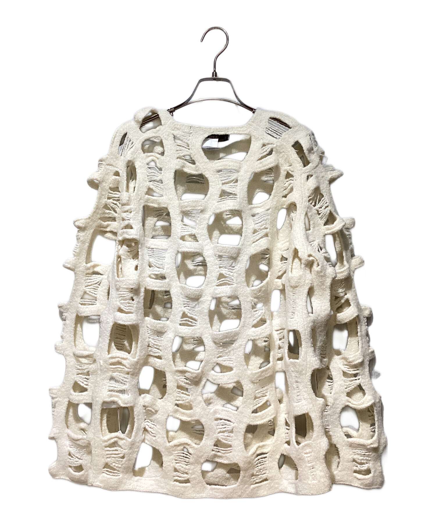 | スタッフコメント | 骨組みのような網目状のデザインにクラッシュ加工が施されたウールニットでございます。ややゆったりとしたサイズ感で、シャツやジャケットなど様々なトップスの上からレイヤードするだけでコーディネートにアクセントを与えてくれます。パンクやグランジ系のファッションにもオススメな一点です。 |