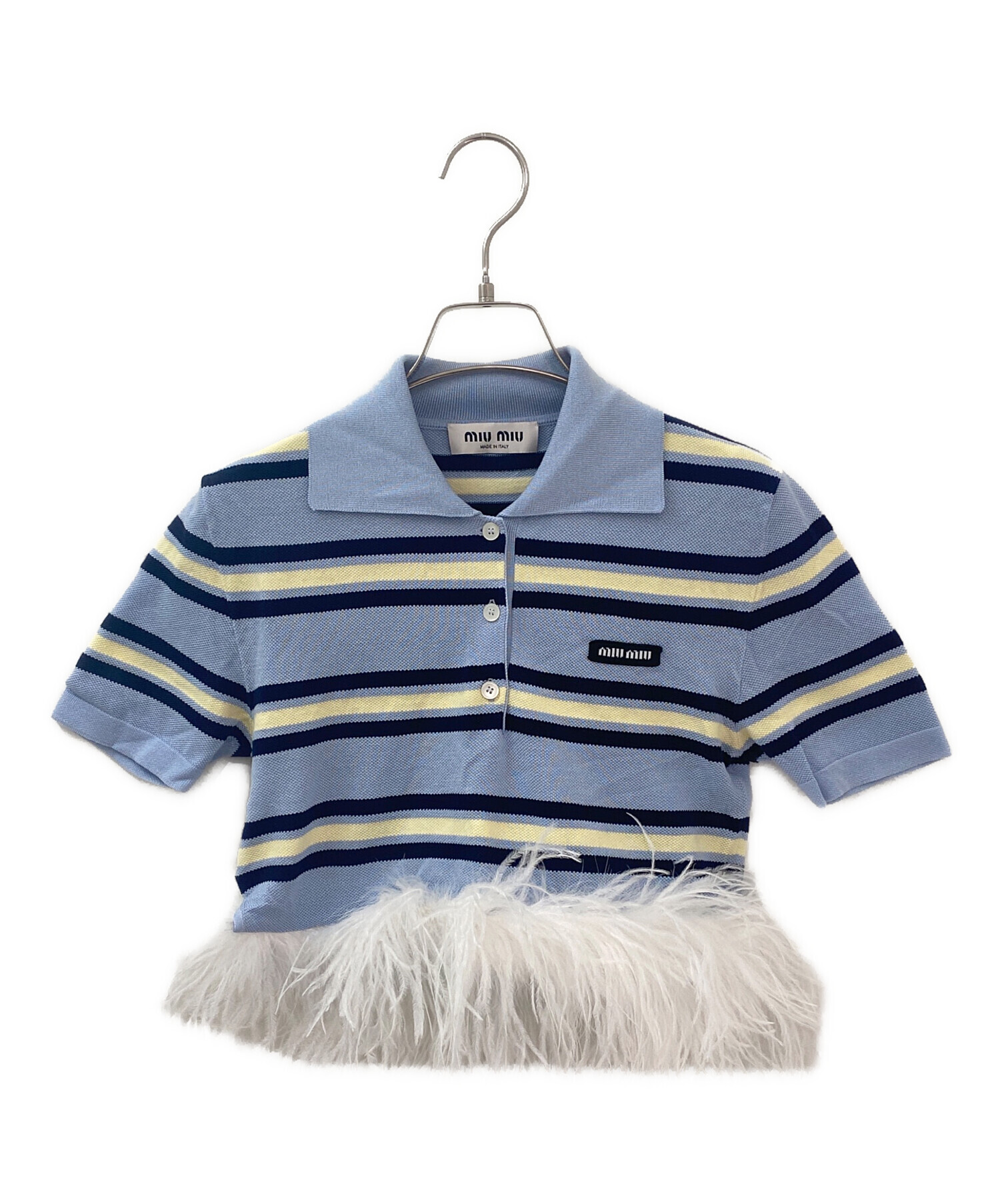 | スタッフコメント | ミュウミュウのポロシャツです。シルクとコットンを使用したニット素材で、肌触りが良く、通気性にも優れています。裾のフェザー装飾が特徴的で、遊び心と上品さを兼ね備えています。カジュアルにもフェミニンスタイルにも合わせやすいです。 |