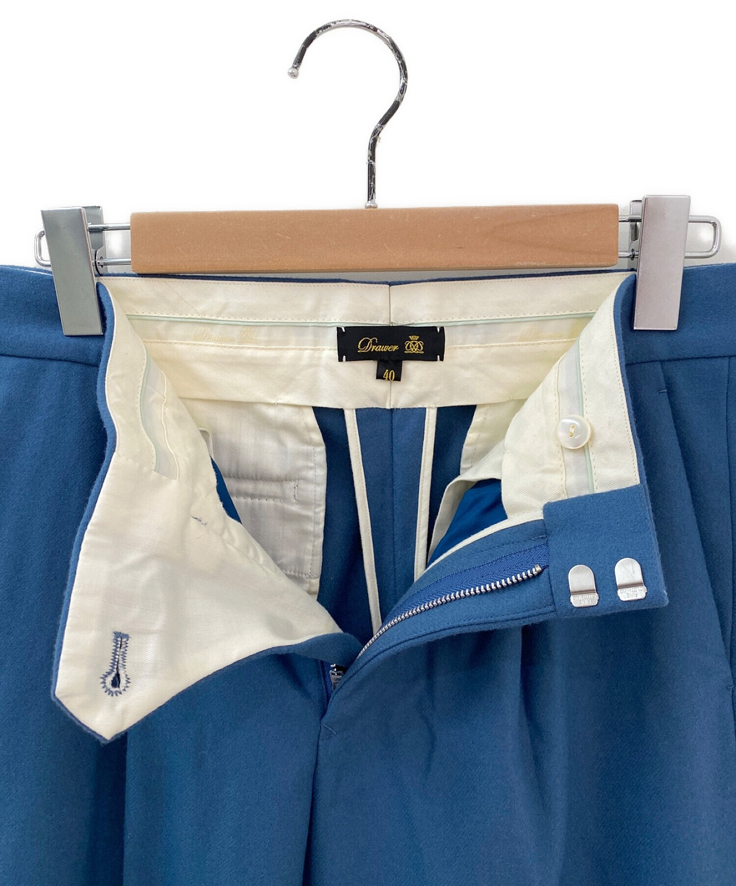 スタッフコメント ウール100%のブルーのフラノタックパンツでございます。くすみブルーのような落ち着いた色合いで絶妙なカラーのため、あらゆるトップスと合わせることができます。裏地がシルクでできているので、サラッとした着心地となっております。