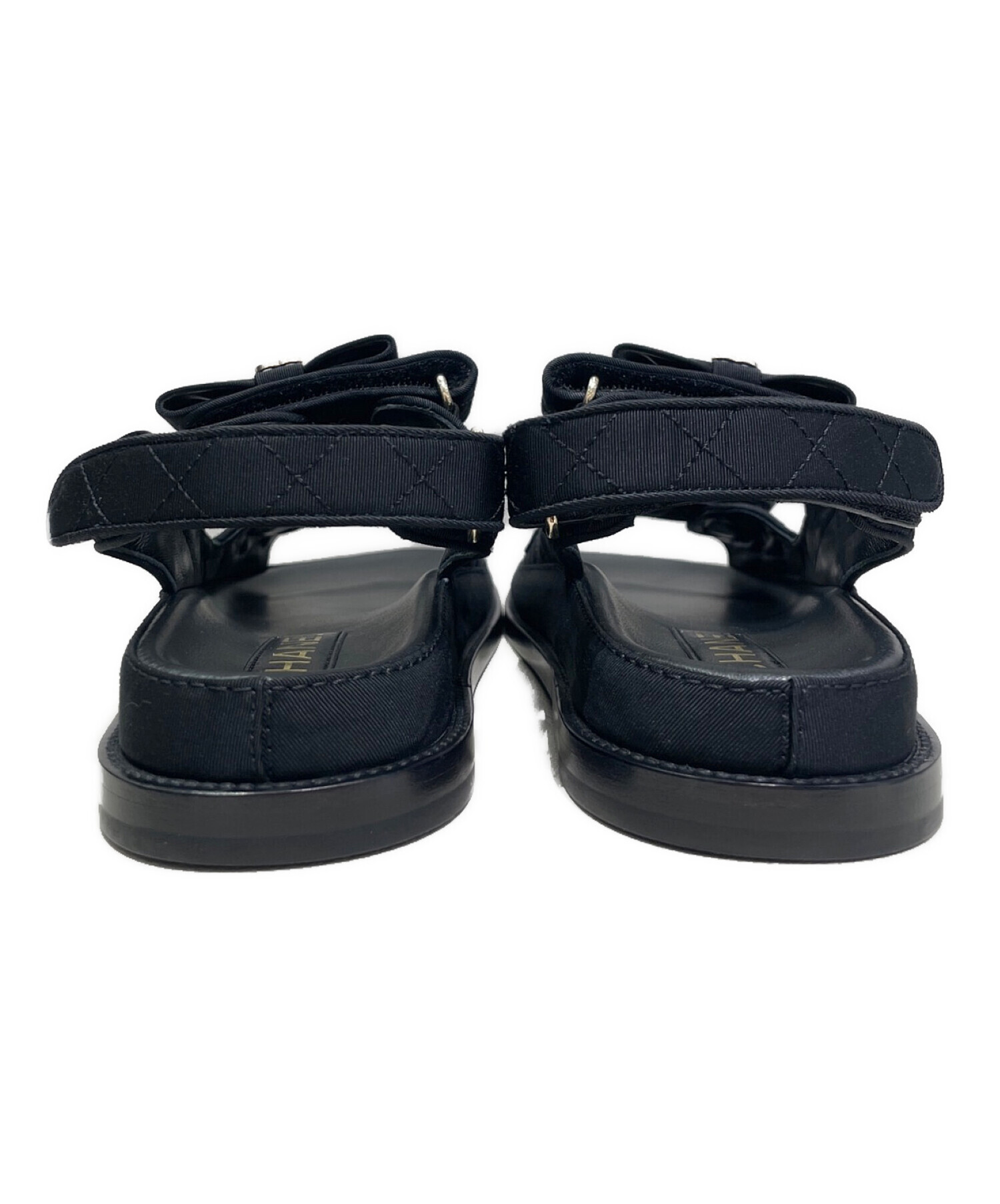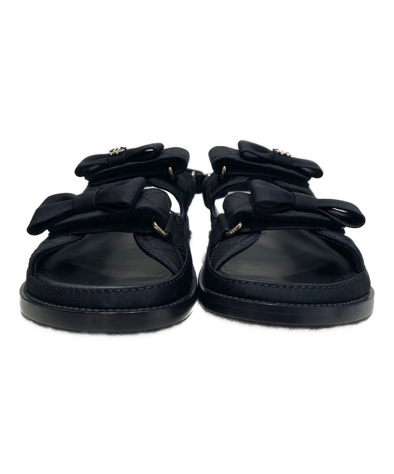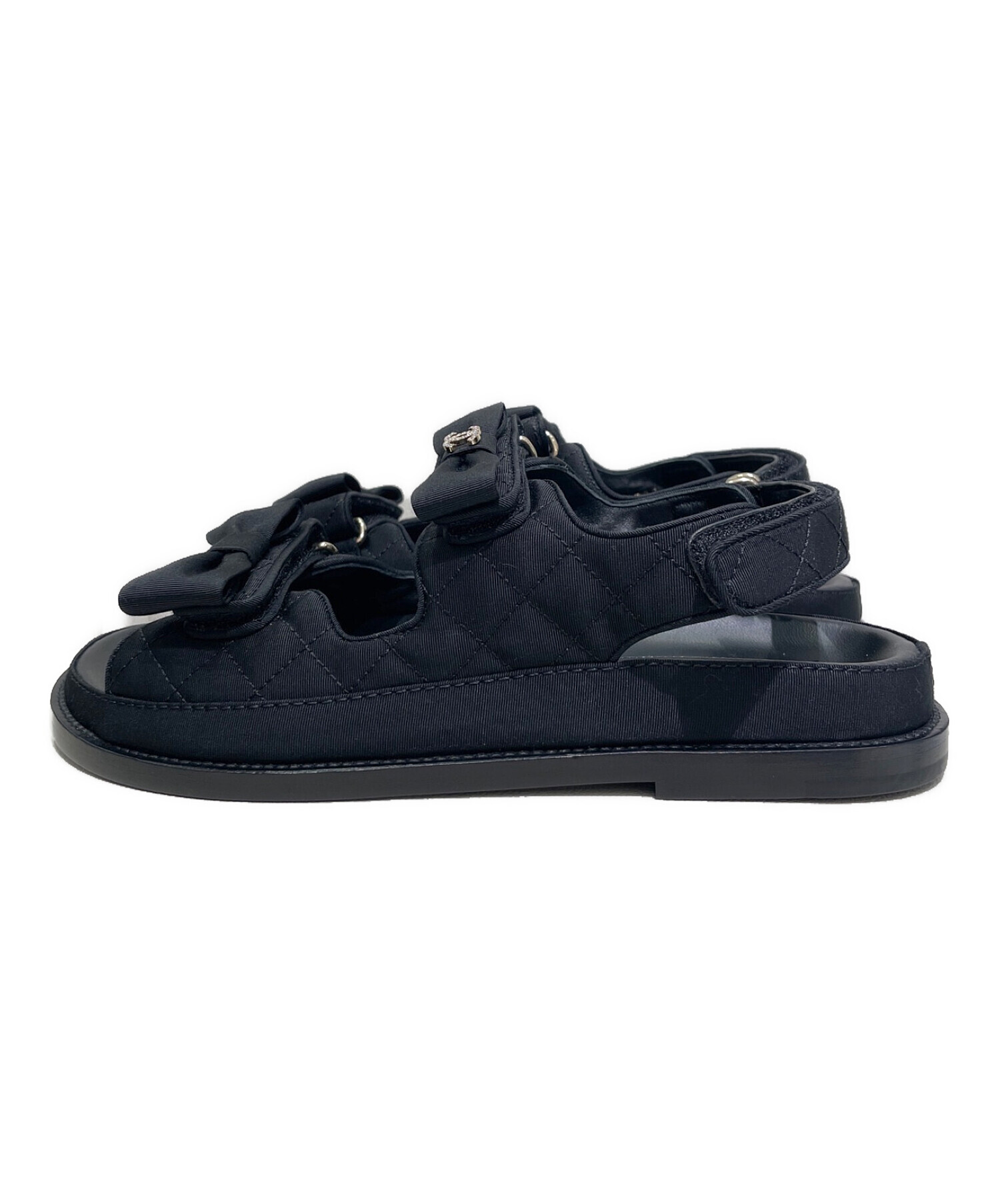 | スタッフコメント | フロントのリボンデザインやラインストーンの付いたココマークがキュートなシャネルのスポーツサンダルでございます。フロントと足首のベルクロテープで足をしっかりホールドしてくれるため、歩きやすく履き心地が良いアイテムです。ソックスと合わせてオールシーズンお使いいただけます。 |