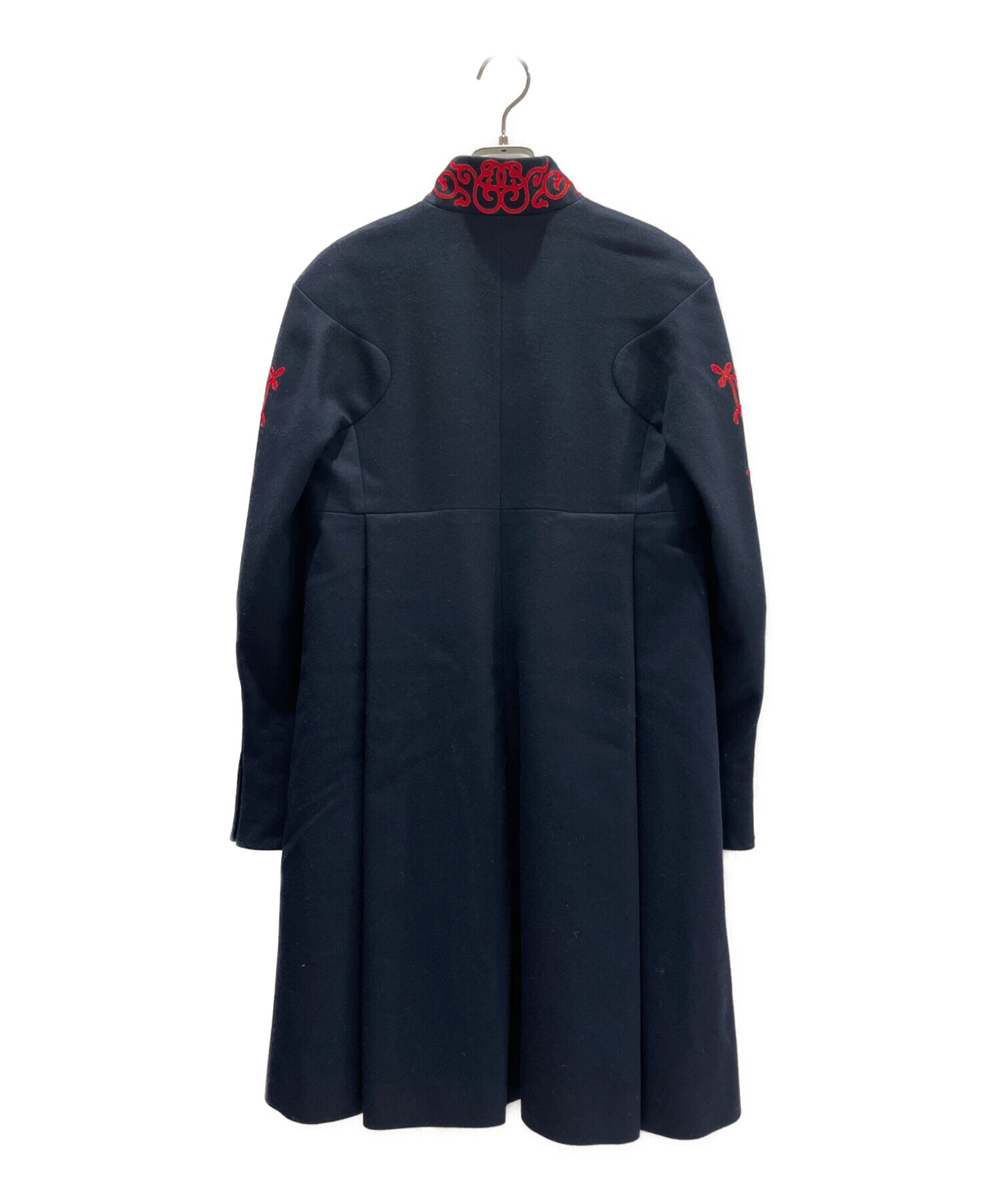 | スタッフコメント | ネイビーのウール地に赤い刺繍が印象的なマオカラーのチャイナ服がベースになっているコートです。前後に入った大きいタック使いが美しいシルエットを造り出しています。ボトムと靴の組み合わせ次第でマニッシュにもフェミニンにもコーディネートを仕上げることができます。 |
