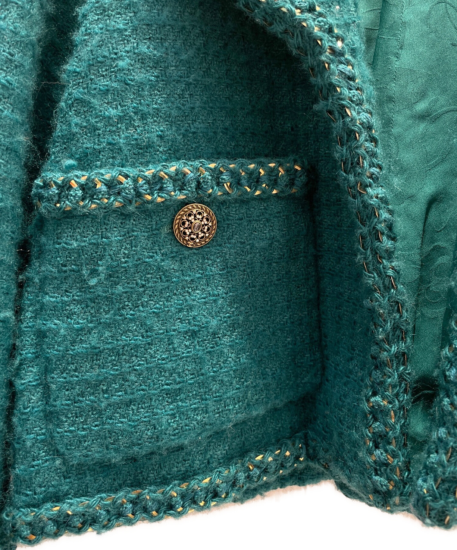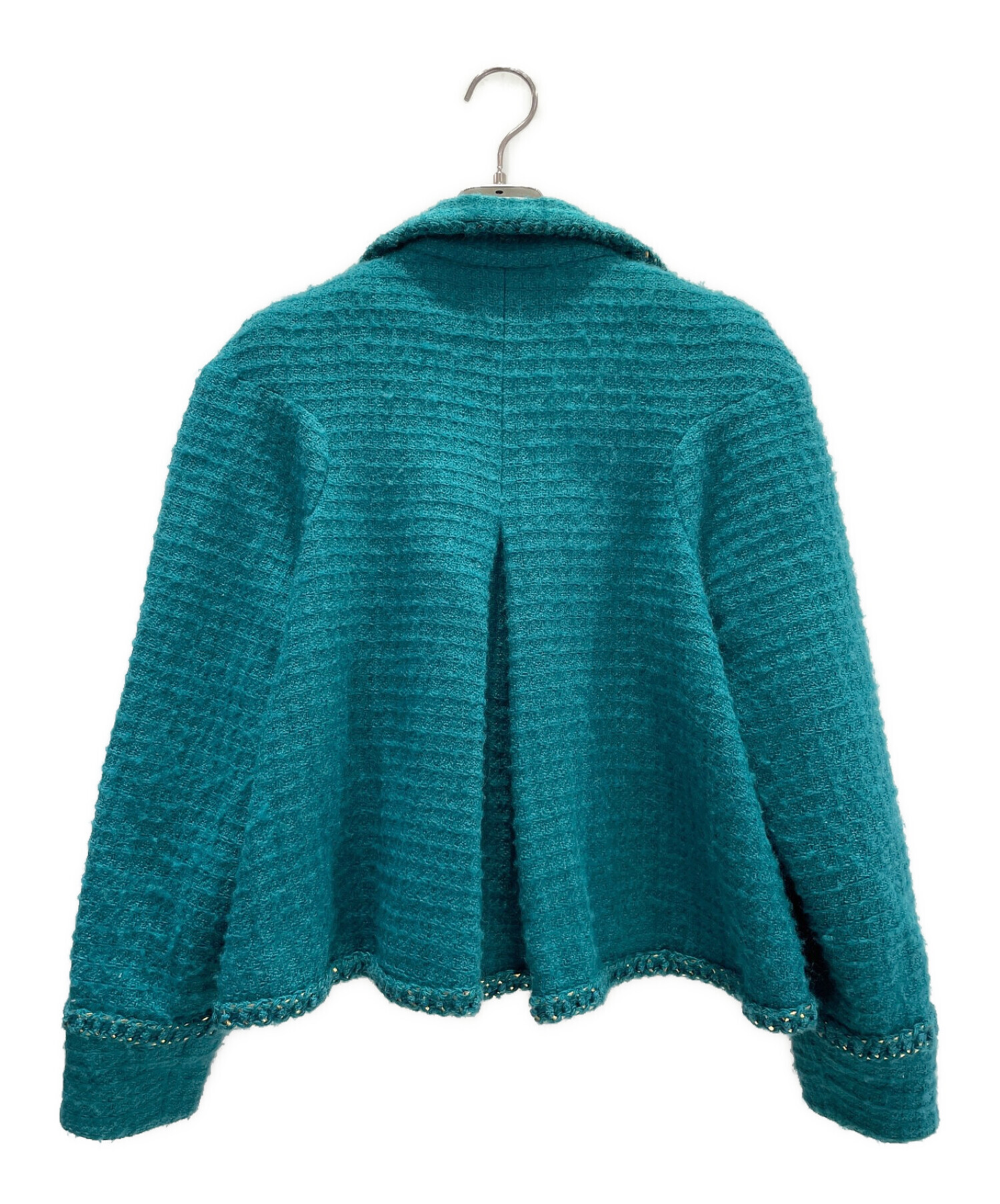 | スタッフコメント | CHANELらしいツイードを使用したテーラードジャケットでございます。ポケットにあしらったストーン付きのボタンや、チェーンで縁取ったデザインは他と被らないインパクトのあるアイテムです。コーディネートの主役になる一品、いかがでしょうか。 |