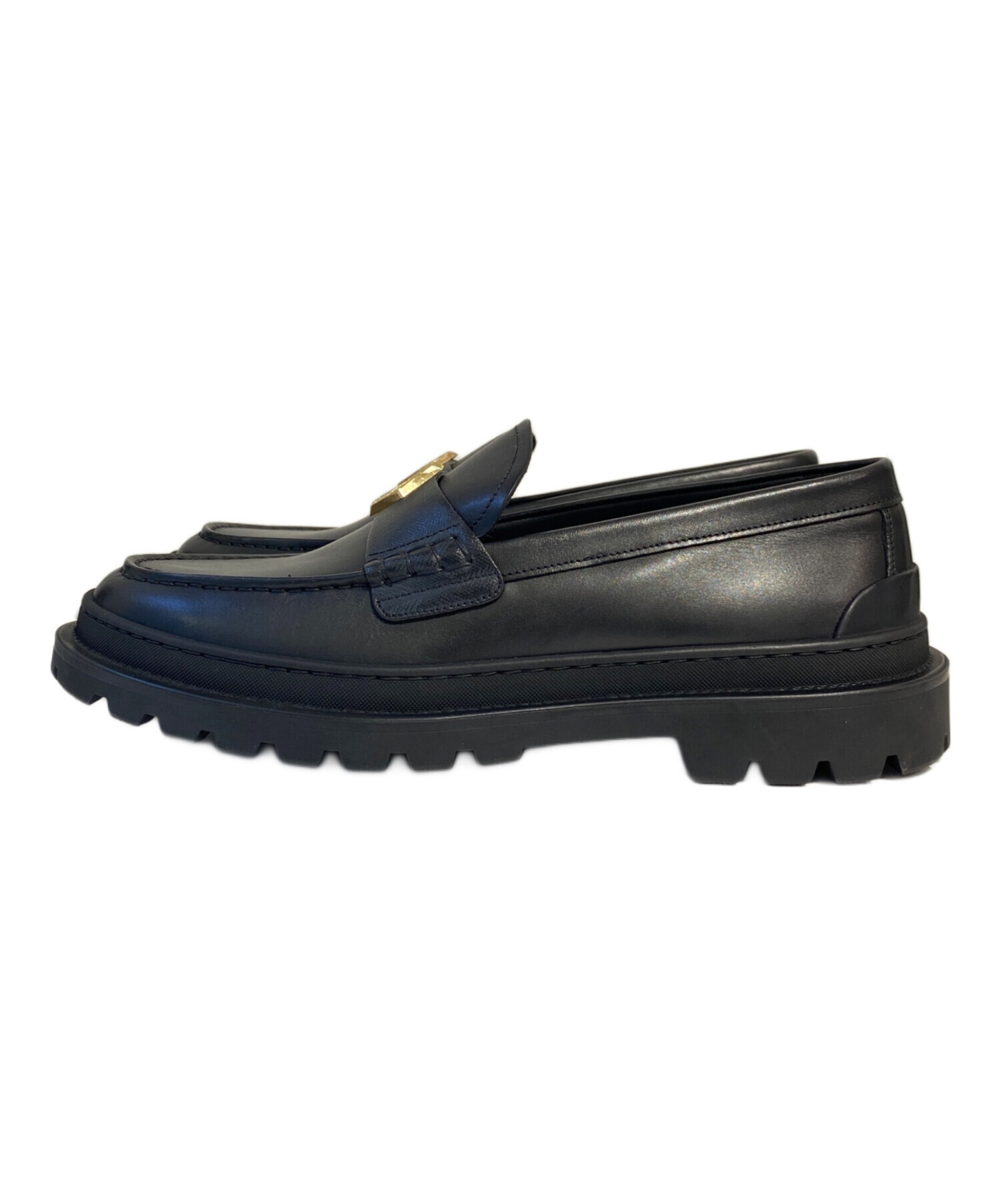 | スタッフコメント | ゴールドのロゴがエレガントな印象のレザーローファーです。上質な素材を使い、高級感がございます。シンプルなデザインで、コーディネートに合わせやすいアイテムです。 |