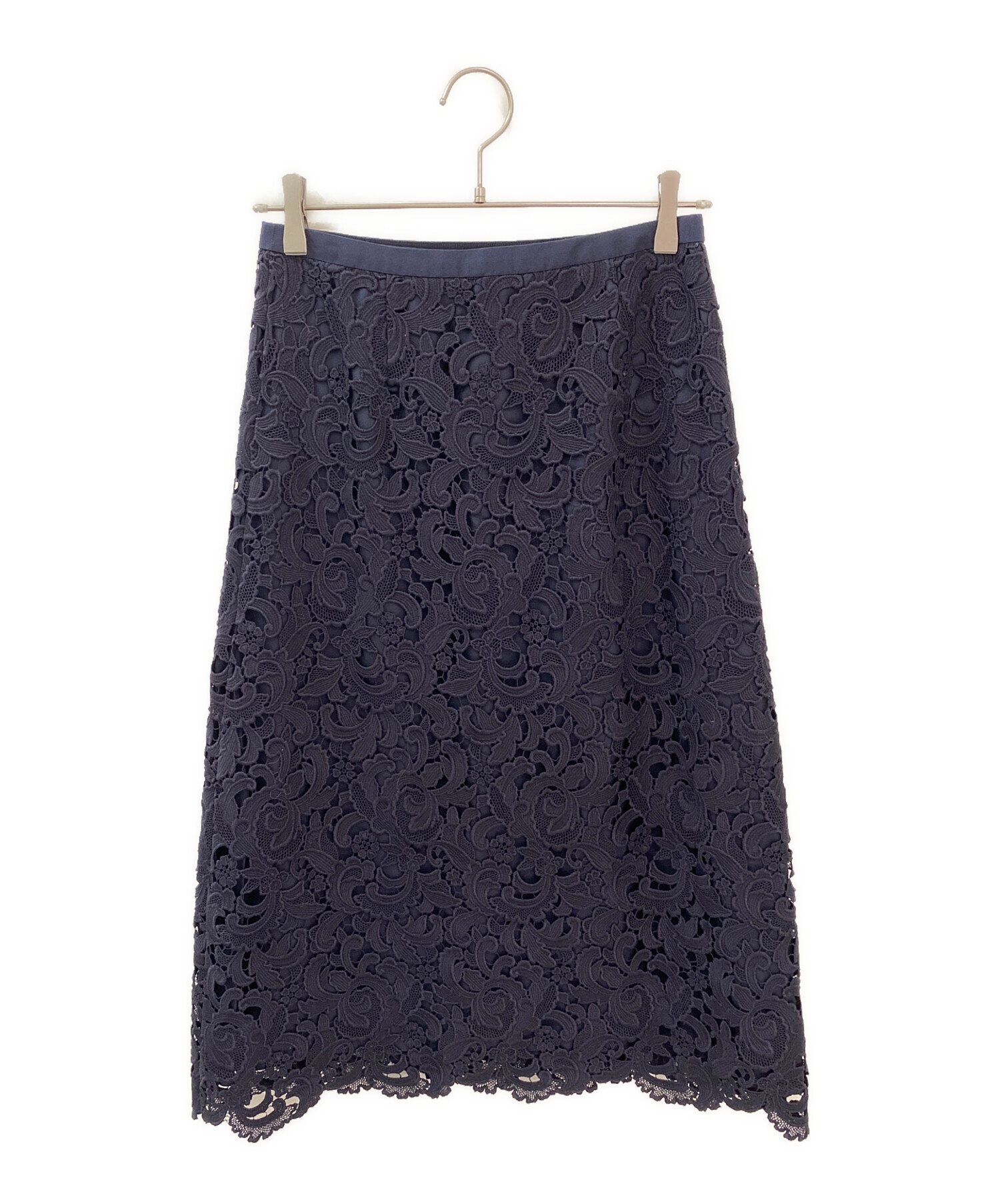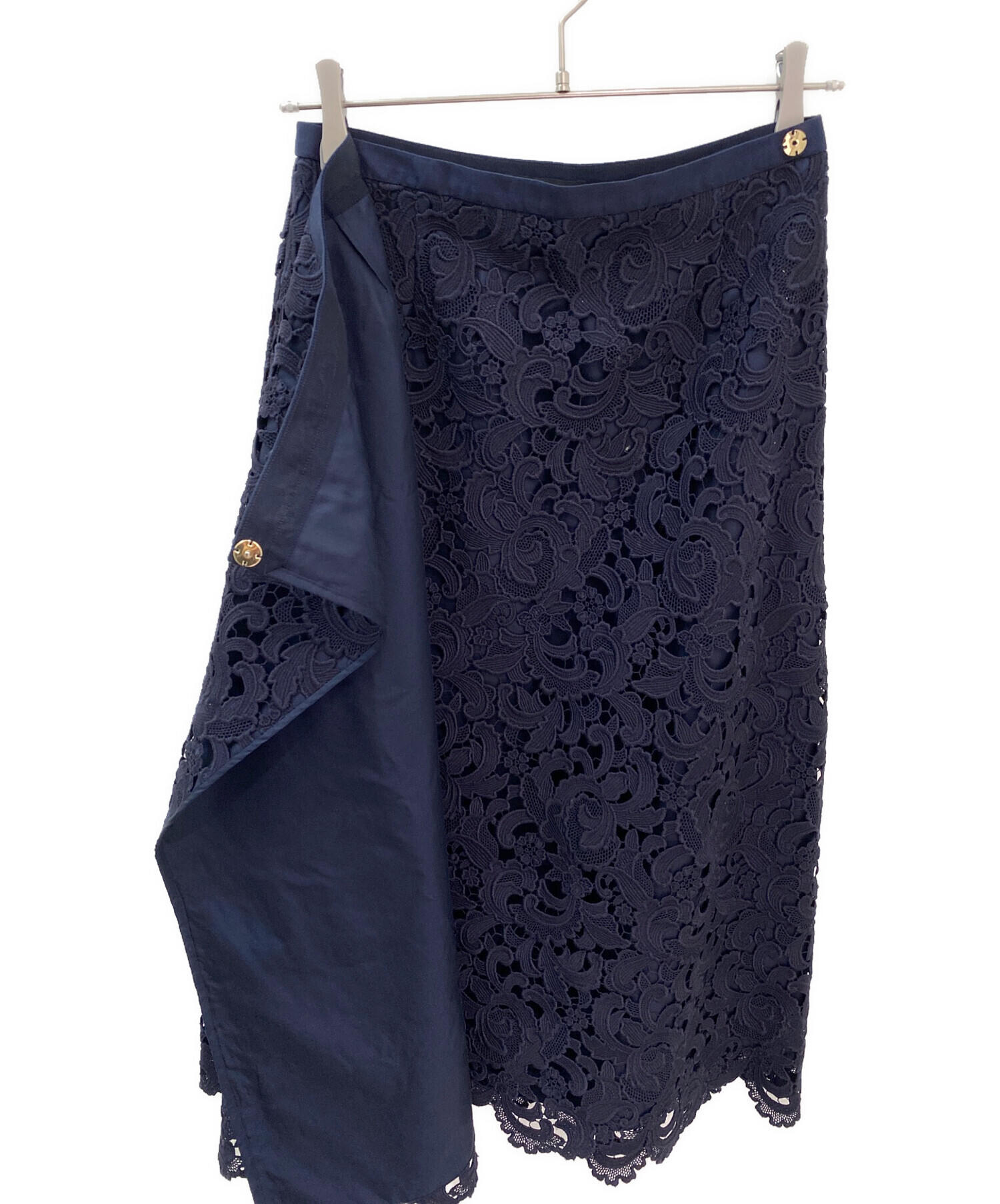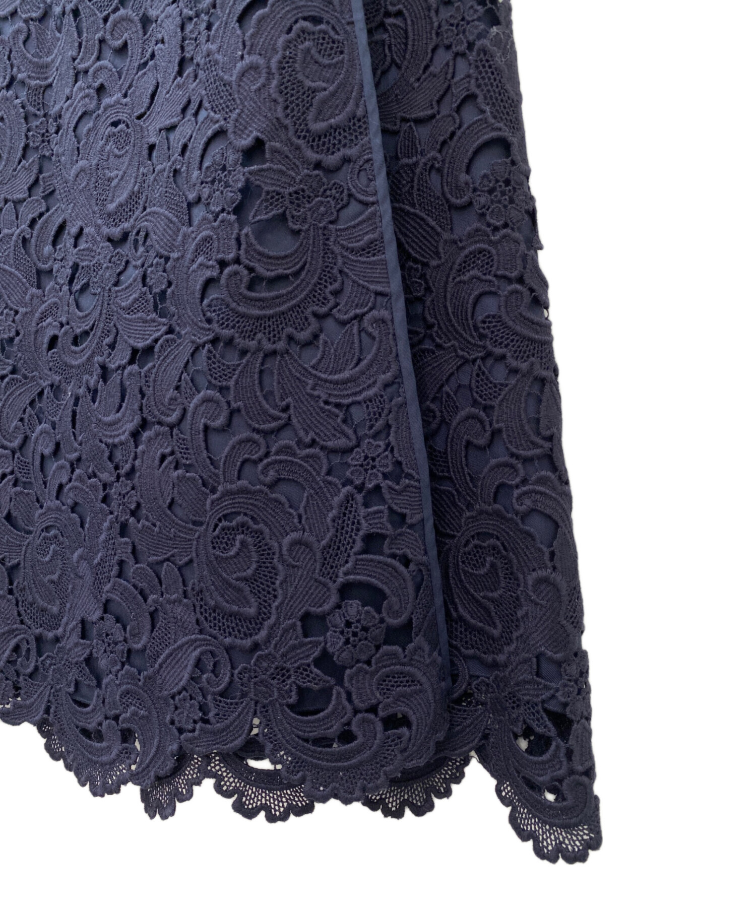 スタッフコメント 総レースのラップスカートは女性らしい華やかさがありながら、上品なネイビーで落ち着いた雰囲気にまとまります。オフィスなどのフォーマルな場面にもなじみ、オンオフ両方でお使い頂けます。