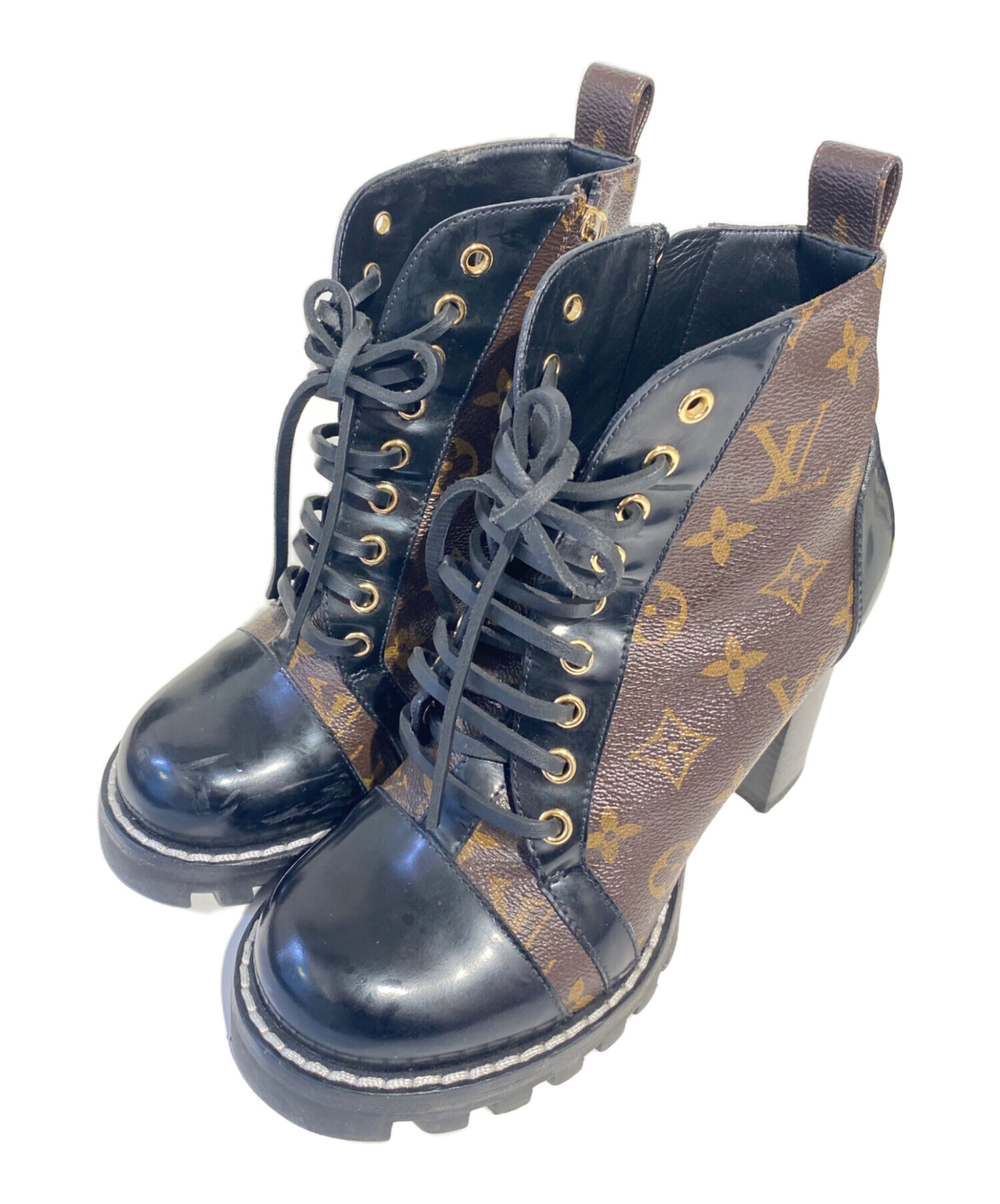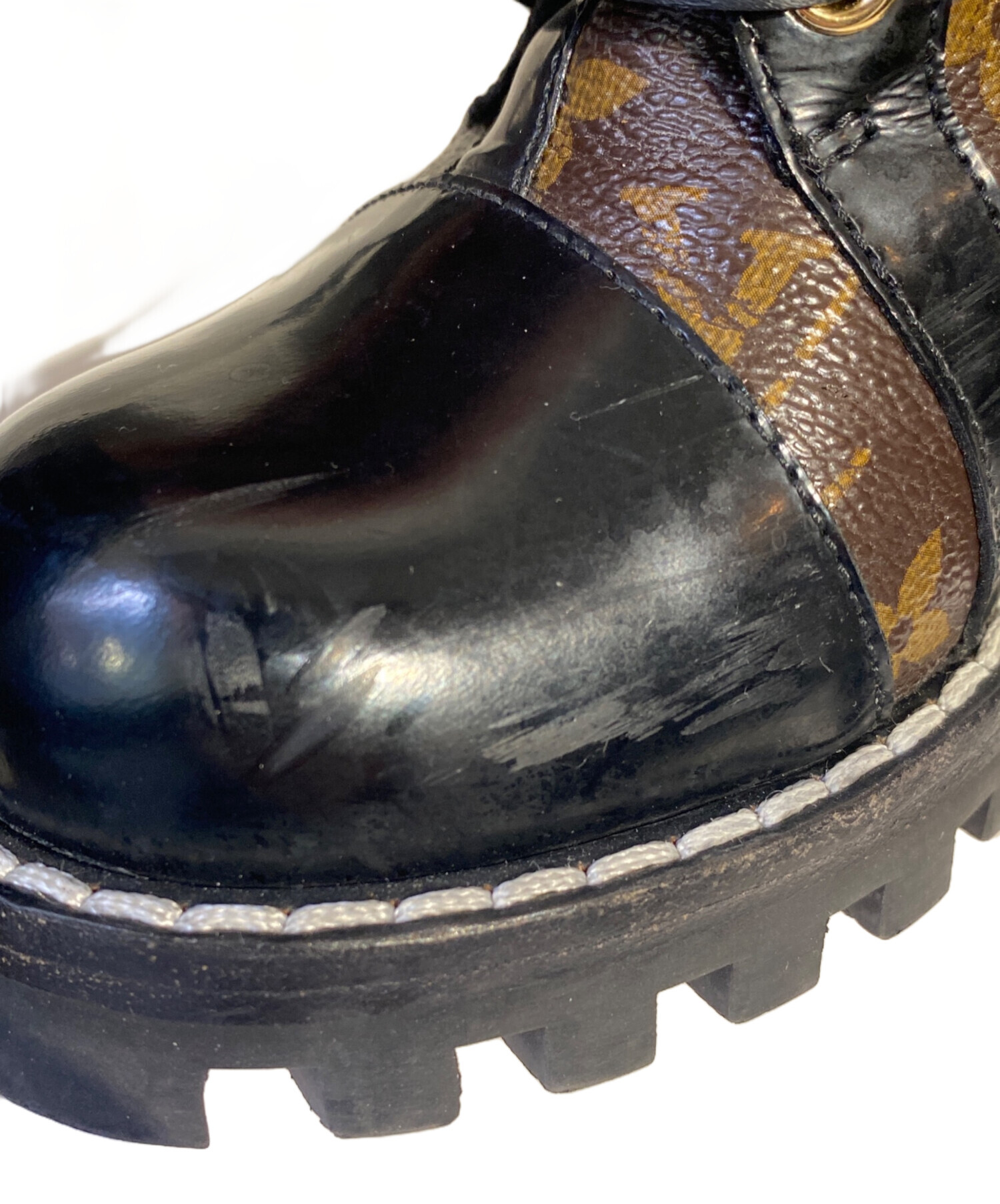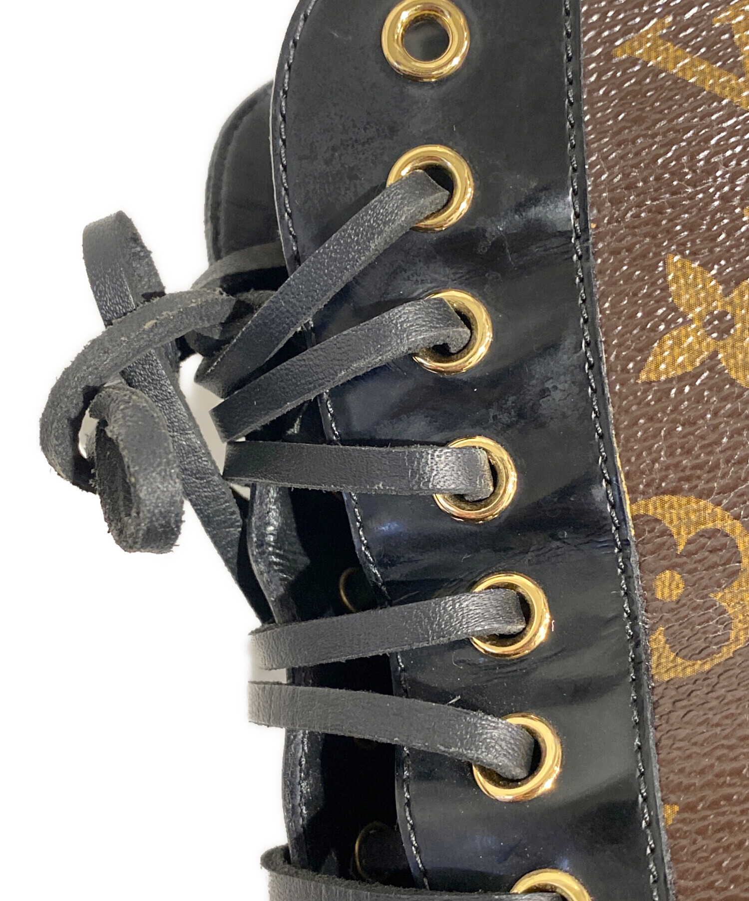 | スタッフコメント | ブランドを象徴するモノグラム・キャンバスとPVCレザーのコンビーションが魅力のラグジュアリーなレースアップブーツでございます。洗練されたブラック×ブラウンの配色に、タフで存在感のあるトレッドラバーソールを採用し、見た目の美しさだけでなく、滑りにくく快適な履き心地を実現した一足です。 |
