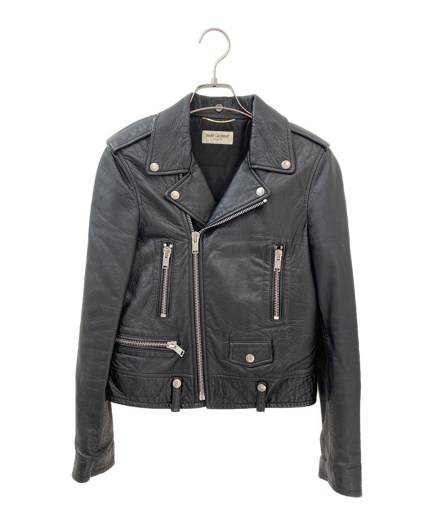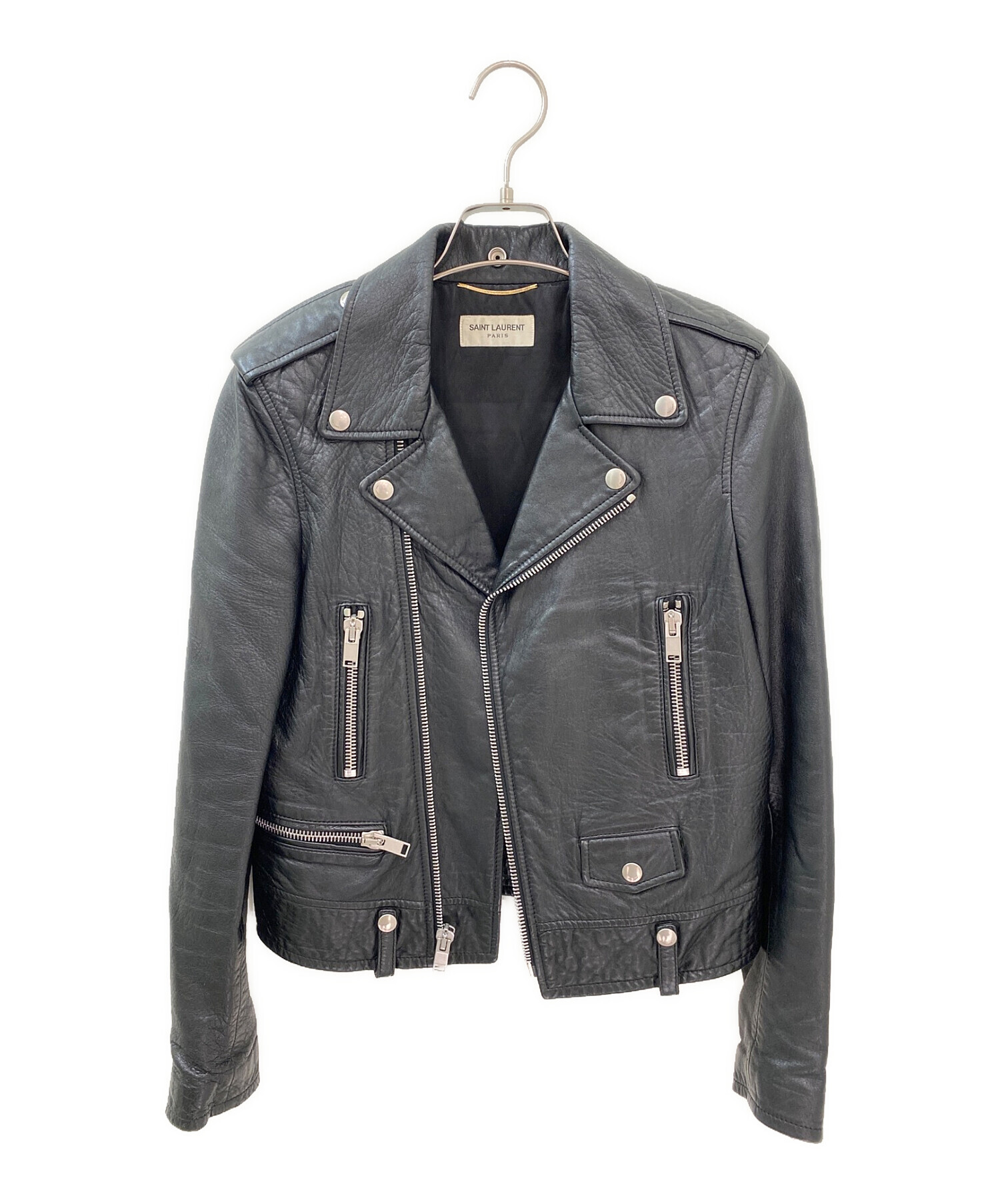 | スタッフコメント | 羊革が柔らかく体にフィットするサンローラン定番人気のレザーライダースジャケットです。ワンピースに合わせてもタイトなトップスとデニムと合わせても様になるアイテムです。シルバー金具がアクセントになります。 |