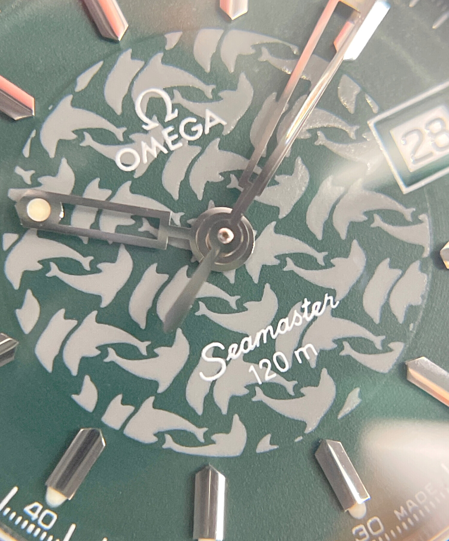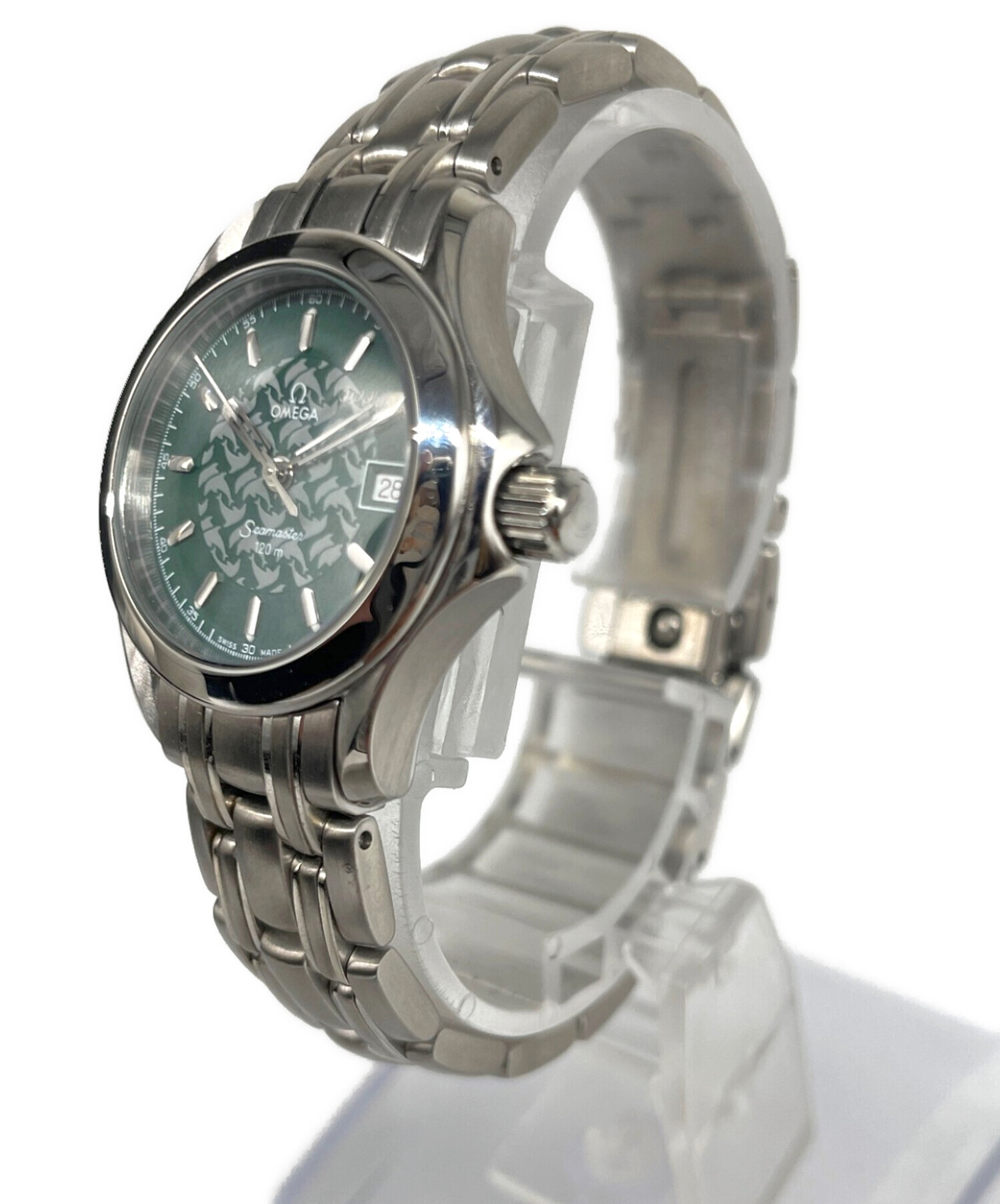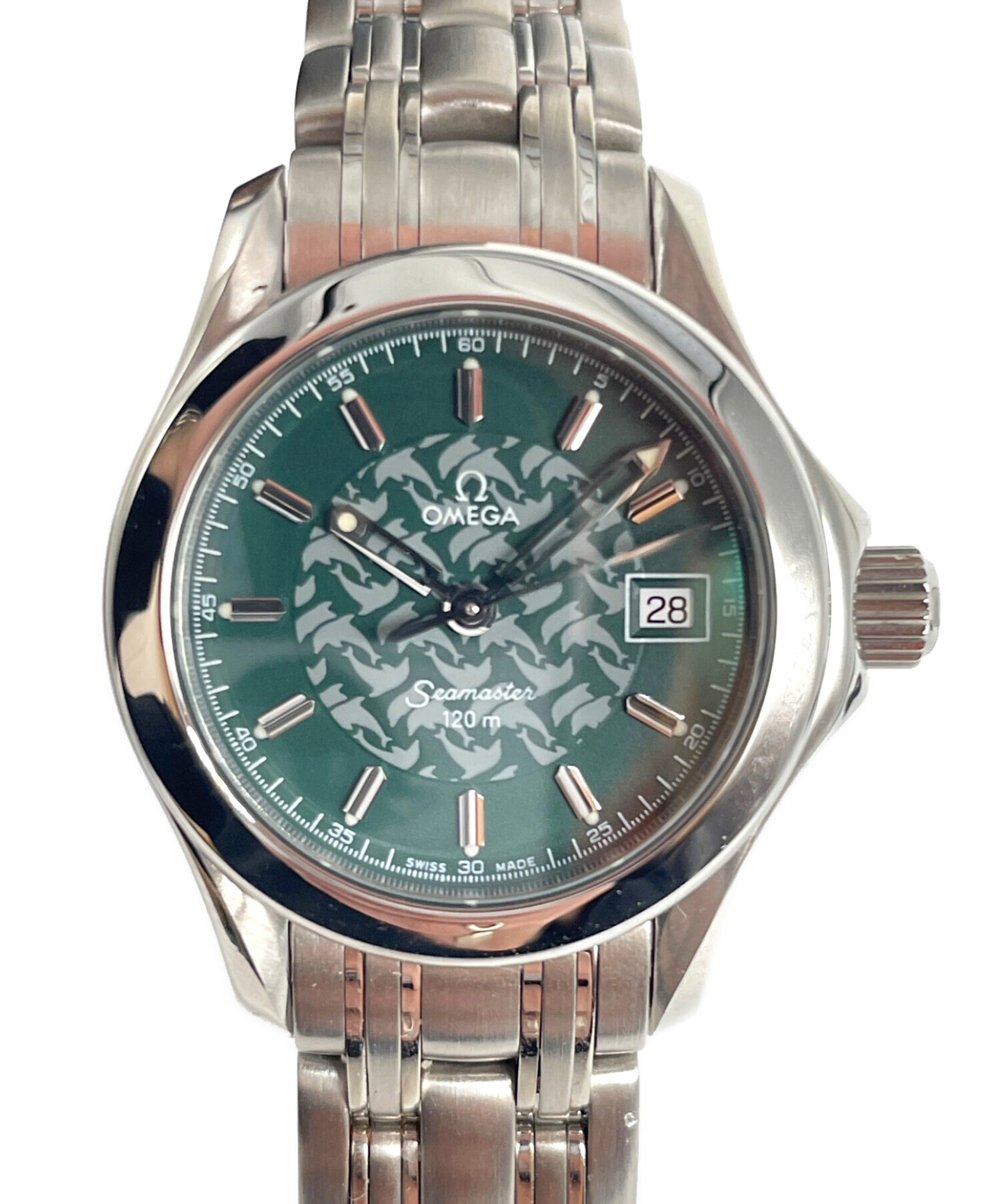 | スタッフコメント | レディースのシーマスターのジャックマイヨールでございます。アイテム名にもなっている、オメガを語る上では欠かせないフリーダイバーのジャック・マイヨール氏の限定モデルで、文字盤にはイルカのシルエットが描かれ、裏蓋には限定シリアルナンバーが刻印されております。深みのあるグリーンカラーから落ち着きを感じられます。 |