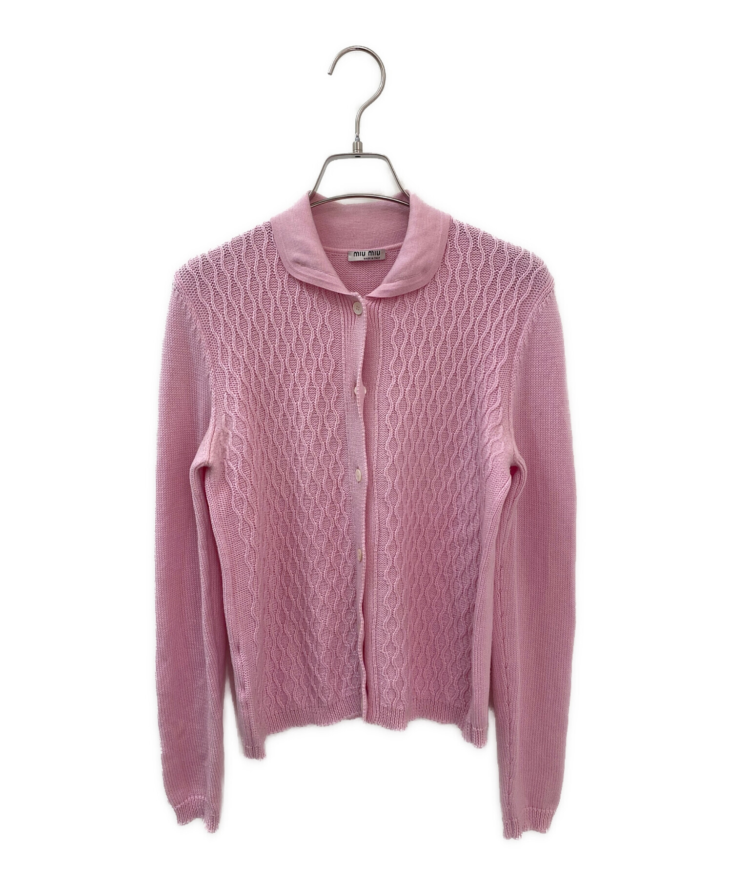 | スタッフコメント | 優しいピンクカラーと丸襟が特徴的なMIU MIUのカーディガンでございます。薄いニットでサラッとしているため、シャツ感覚で一枚目にも着られます。寒い時期や春先にも使える万能なカーディガンでございます。 |