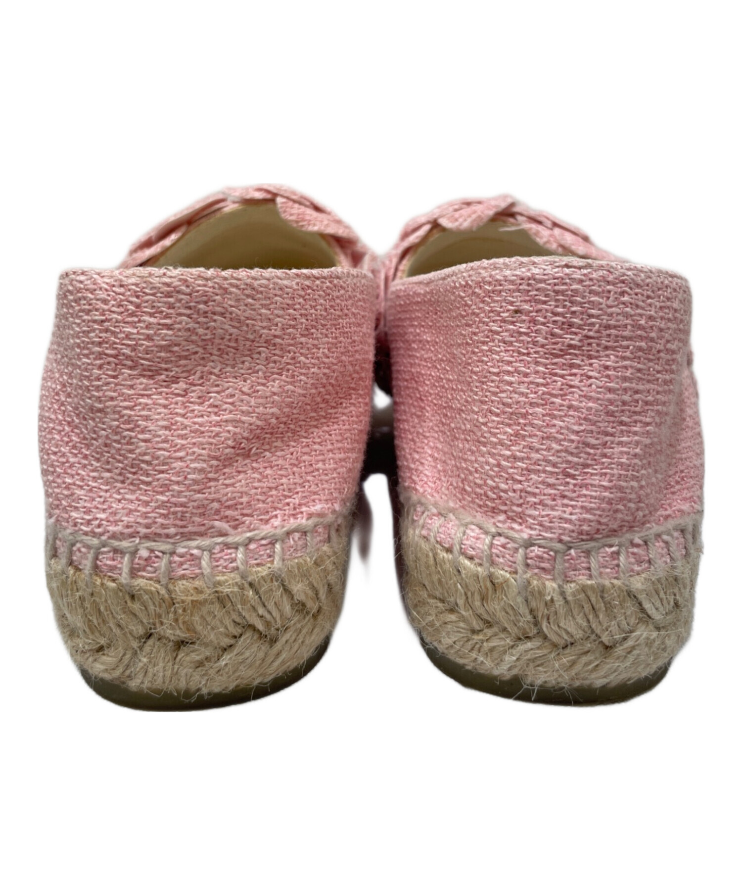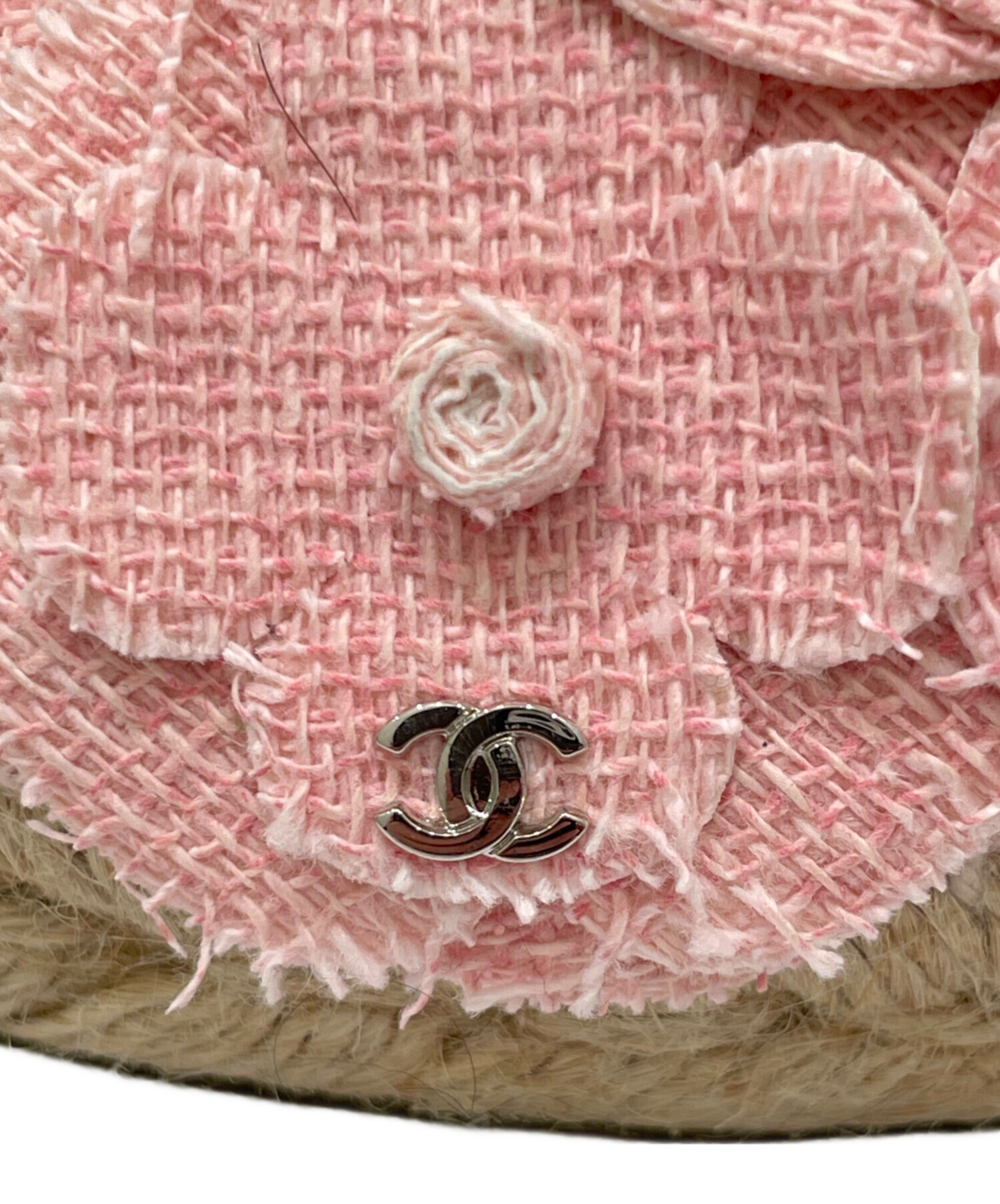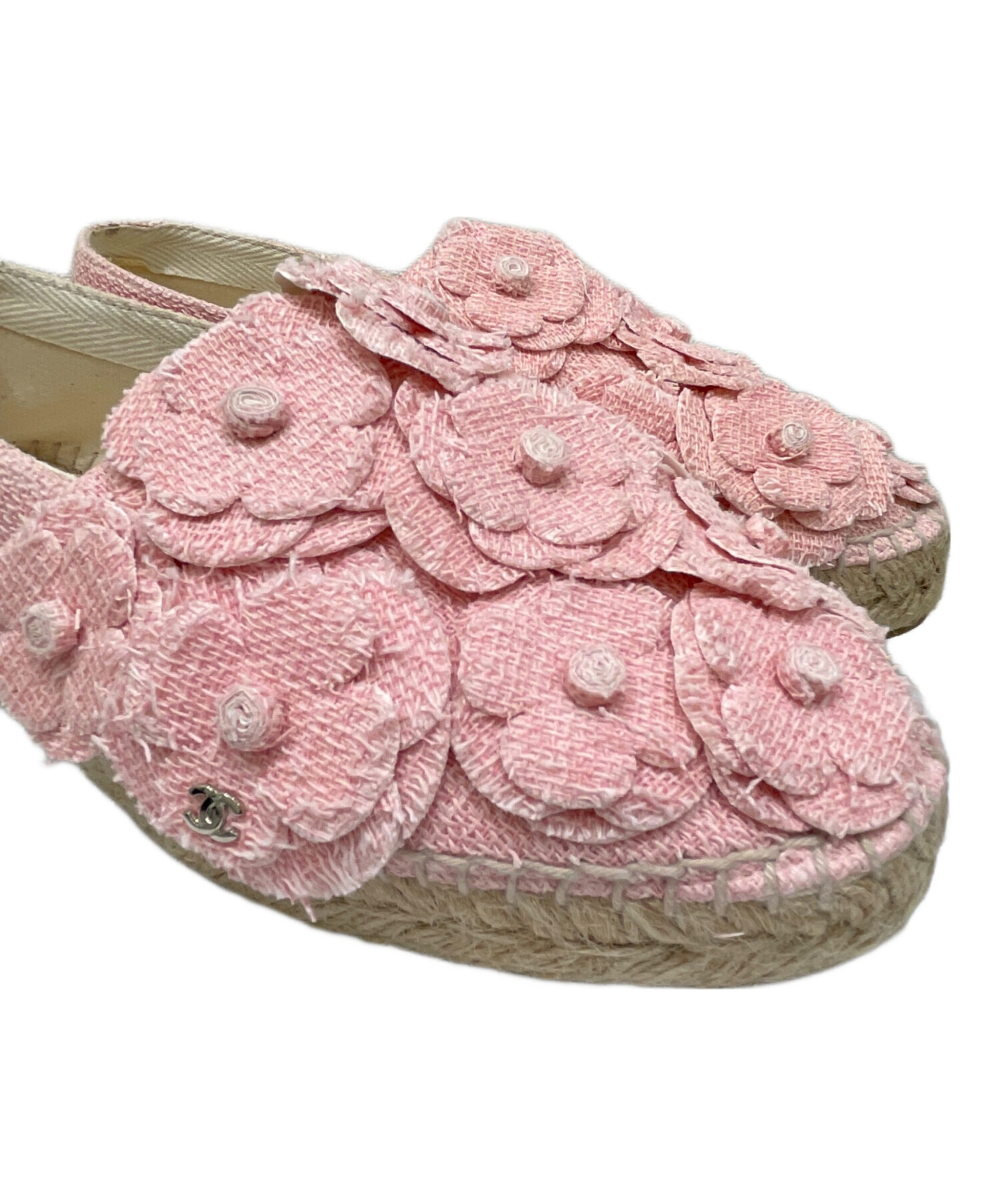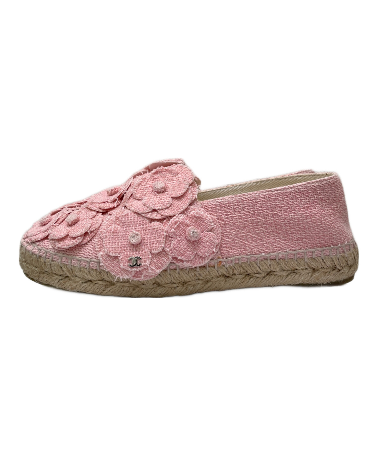 | スタッフコメント | シャネルのカメリアデザインのエスパドリーユフラットシューズです。ツイード素材で、ピンクのカメリア飾りとココマークが華やかな印象になります。デニムやワンピースとの相性も良いです。 |