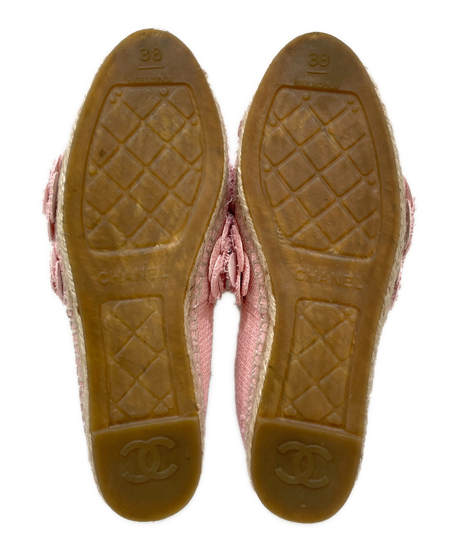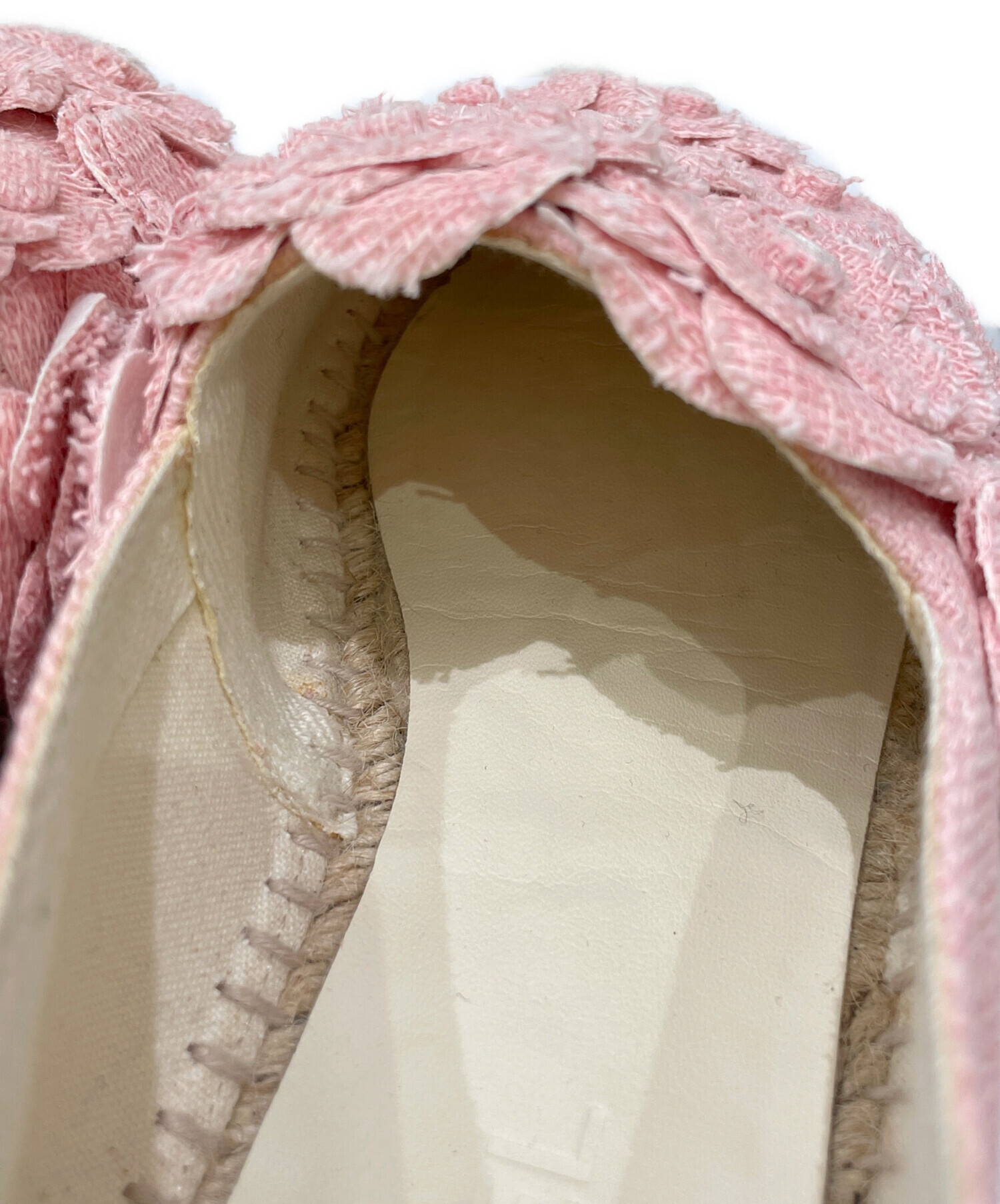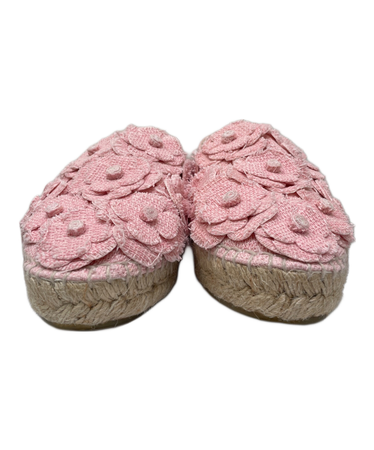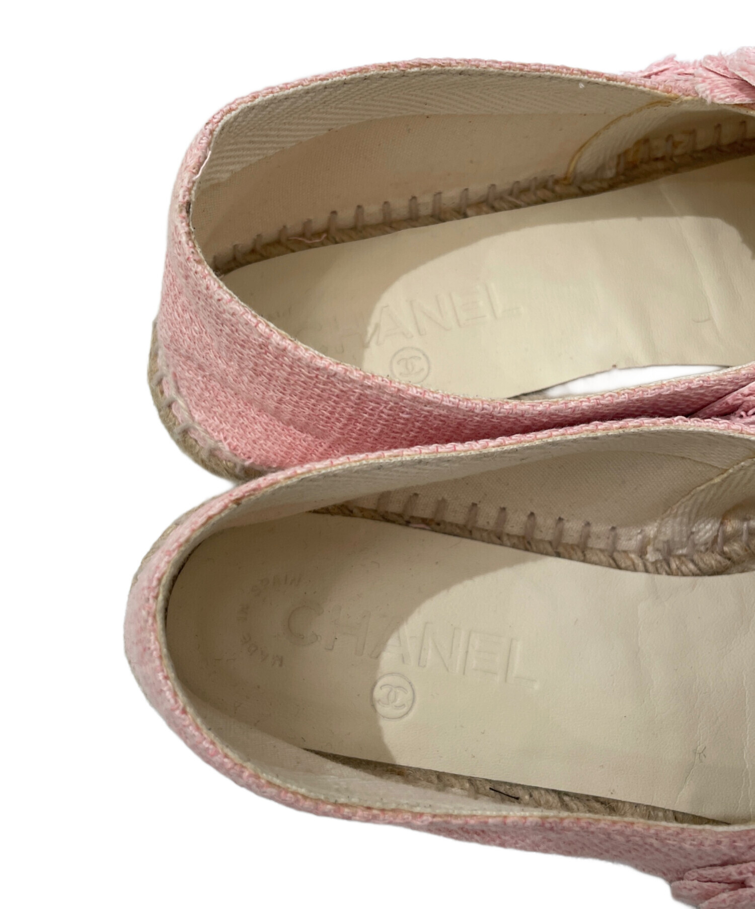 | スタッフコメント | シャネルのカメリアデザインのエスパドリーユフラットシューズです。ツイード素材で、ピンクのカメリア飾りとココマークが華やかな印象になります。デニムやワンピースとの相性も良いです。 |