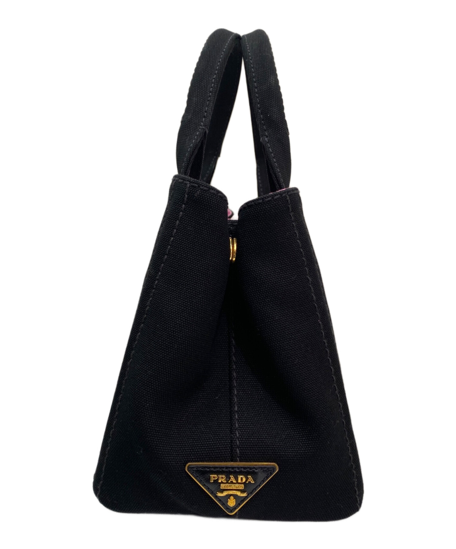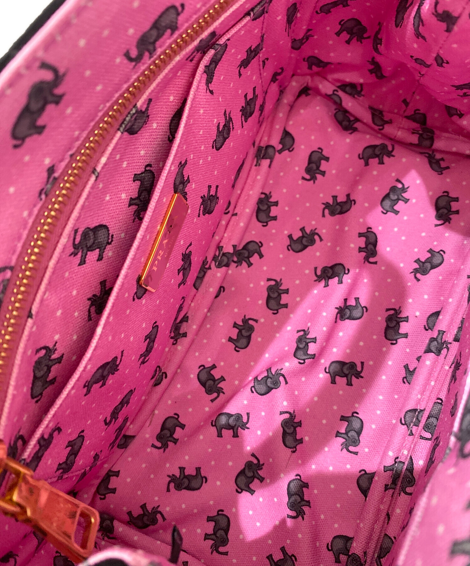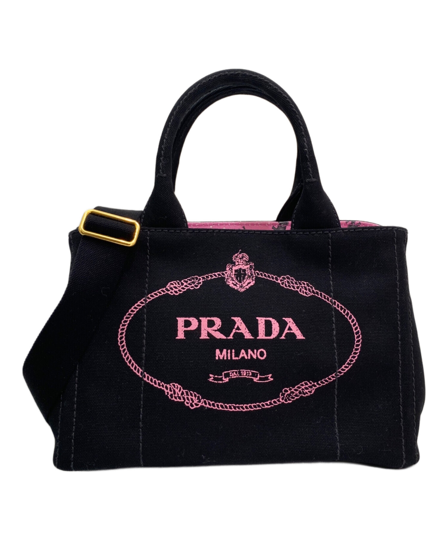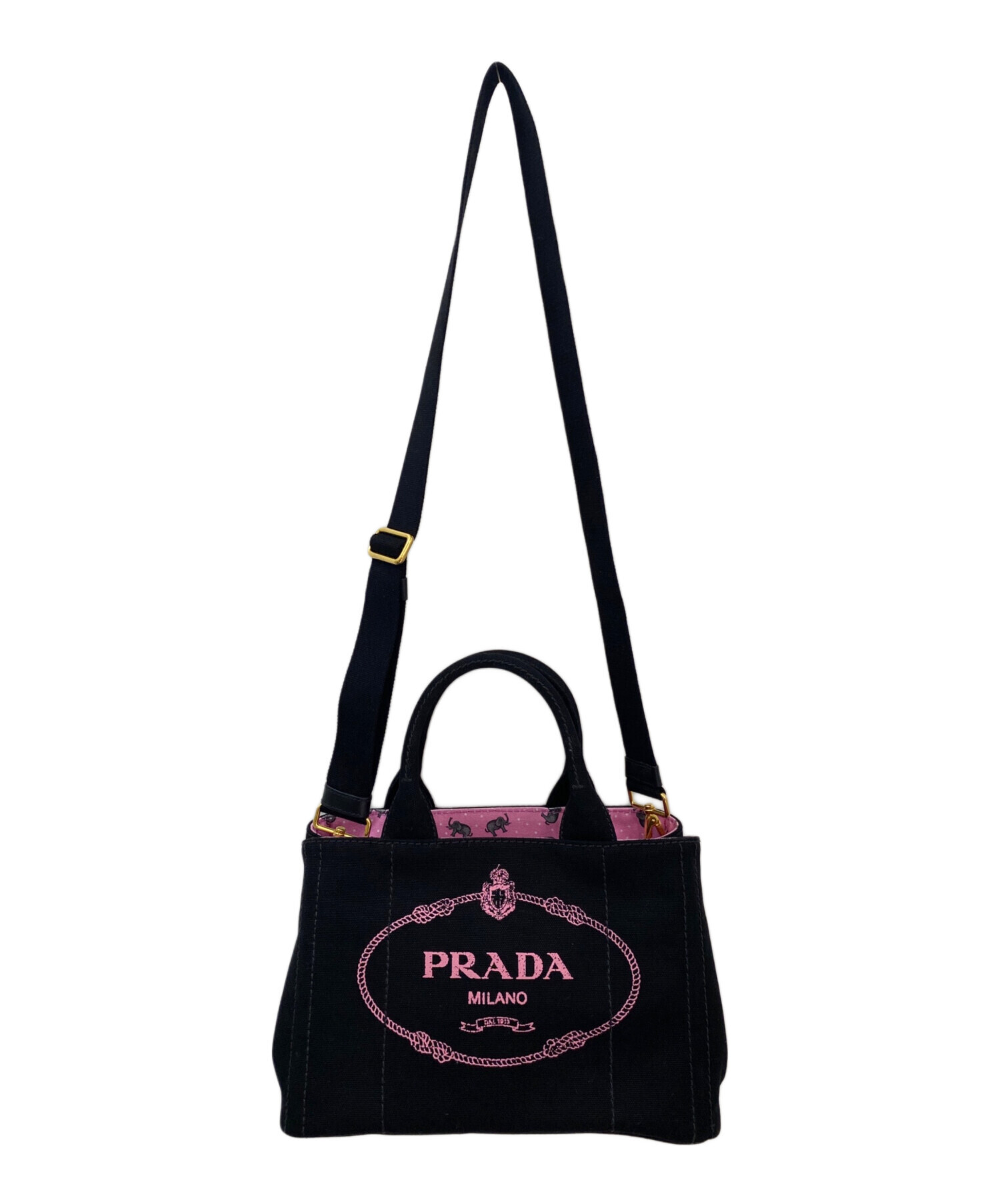 | スタッフコメント | PRADAのアイコンバッグ「カナパ」でございます。ブラックの丈夫なキャンバス地に、ピンクのブランドロゴがプリントされた、シックでキュートな2WAYトートバッグでございます。裏地にはエレファント柄の生地が使用され、高級感の中にユニークな遊び心が感じられます。 |