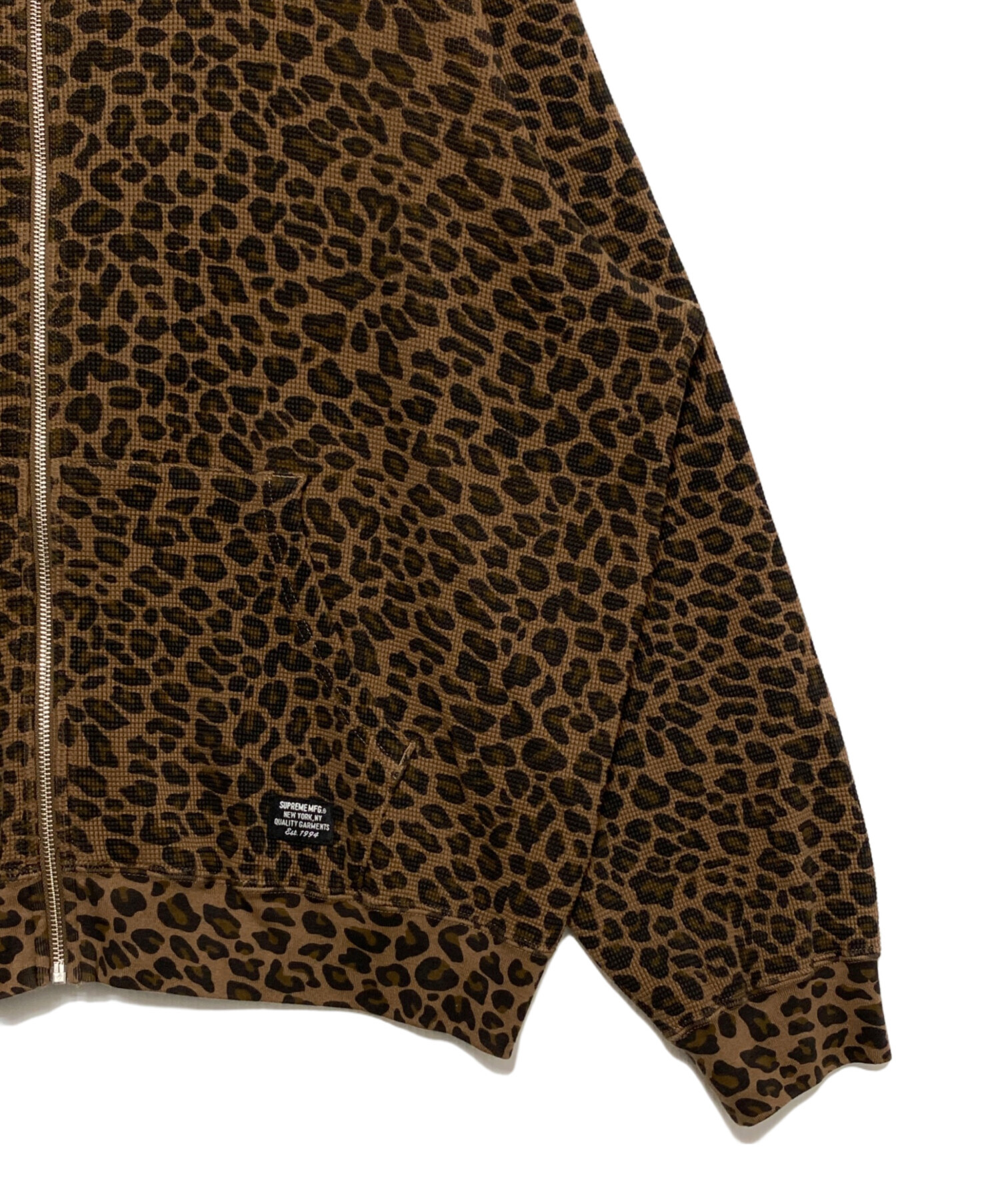 | スタッフコメント | レオパード柄を全面にあしらった、存在感抜群のジップアップフーディー。裏地にはサーマル素材を採用し、保温性と快適な着心地を両立。ブラウンベースの落ち着いたトーンながら、Supremeらしいストリートのエッセンスがしっかりと詰まった一着です。タフなスタイルにアクセントを加えるアイテムとしておすすめ。 |