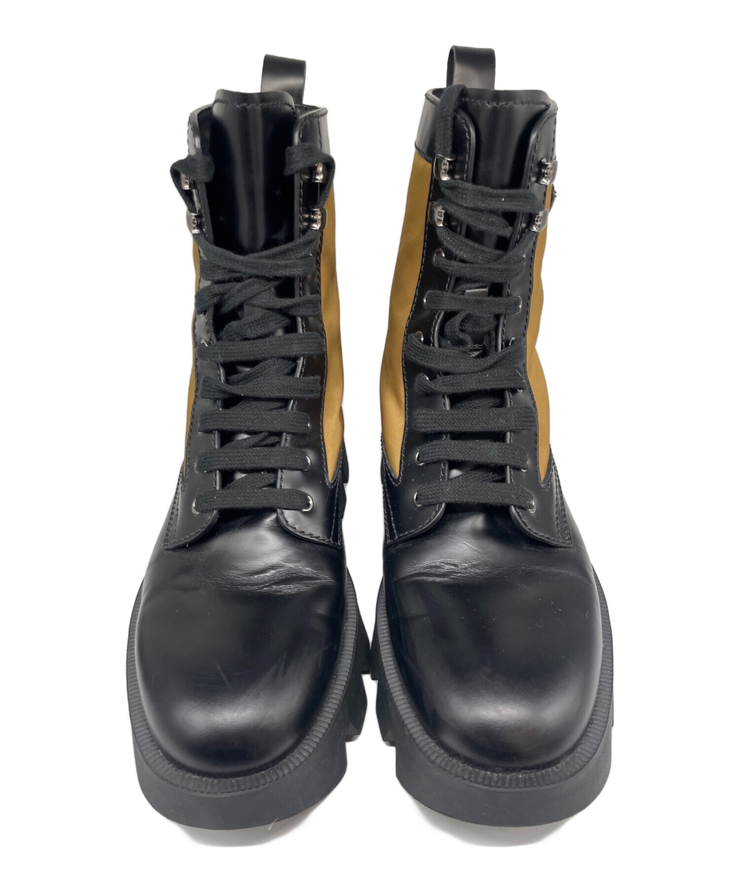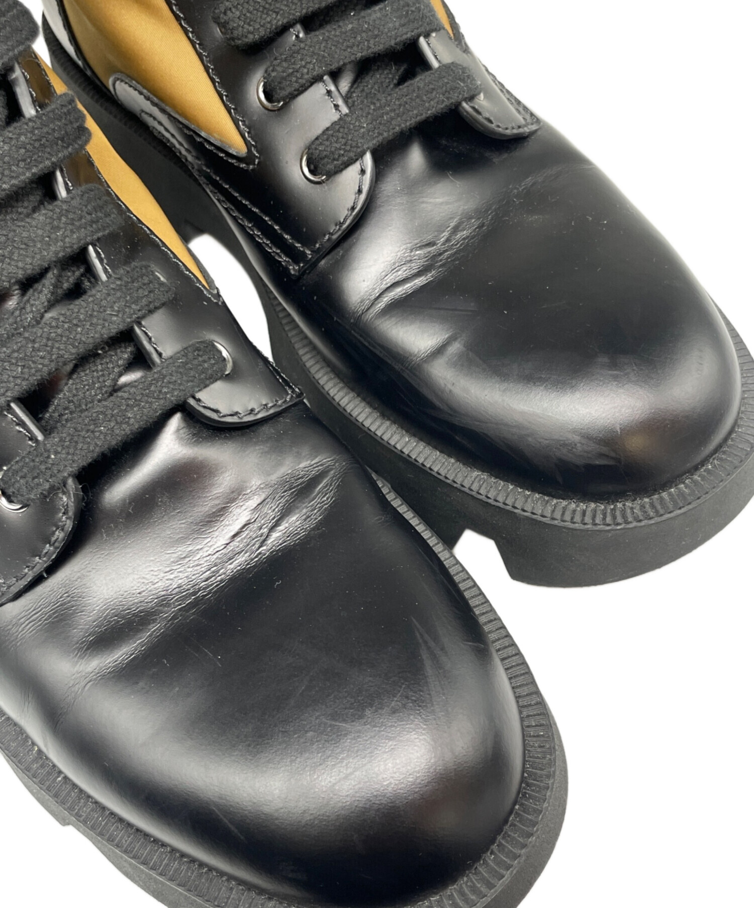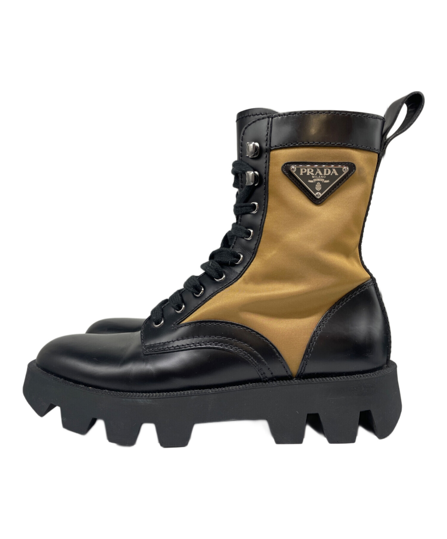| スタッフコメント | PRADAらしい洗練されたデザインが魅力のレースアップブーツです。上品なツヤを放つレザーにアイコニックなロゴプレートが映える一足です。重厚感のあるソールながら、すっきりとしたシルエットで幅広いスタイリングにマッチします。 |