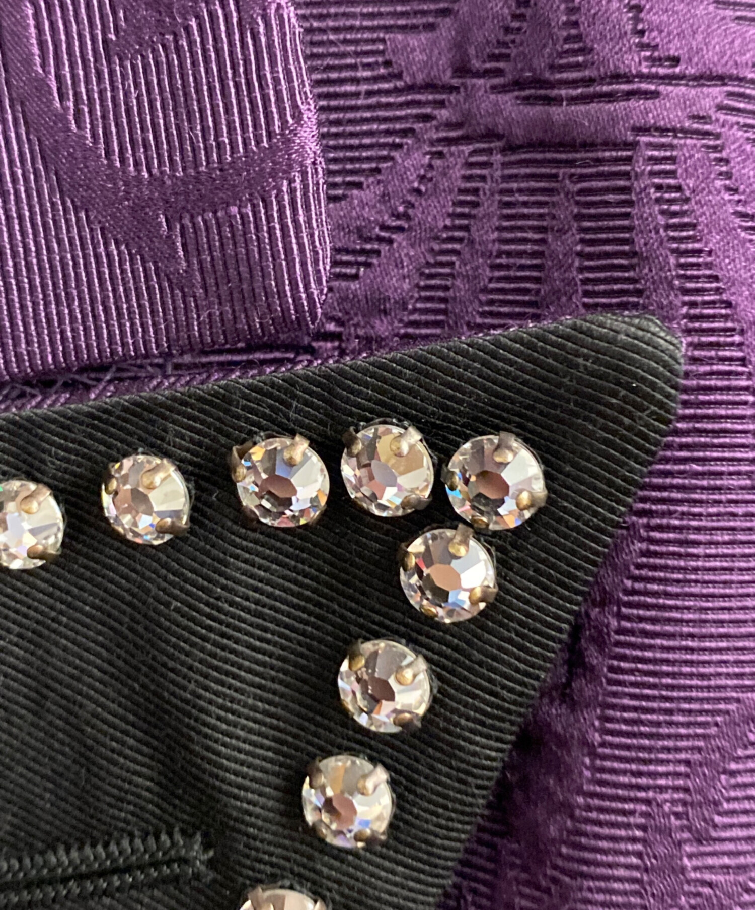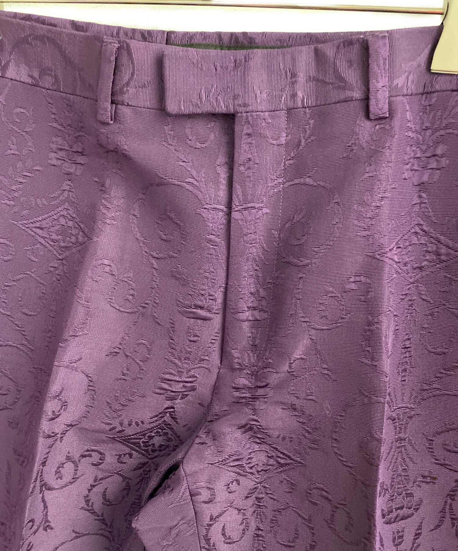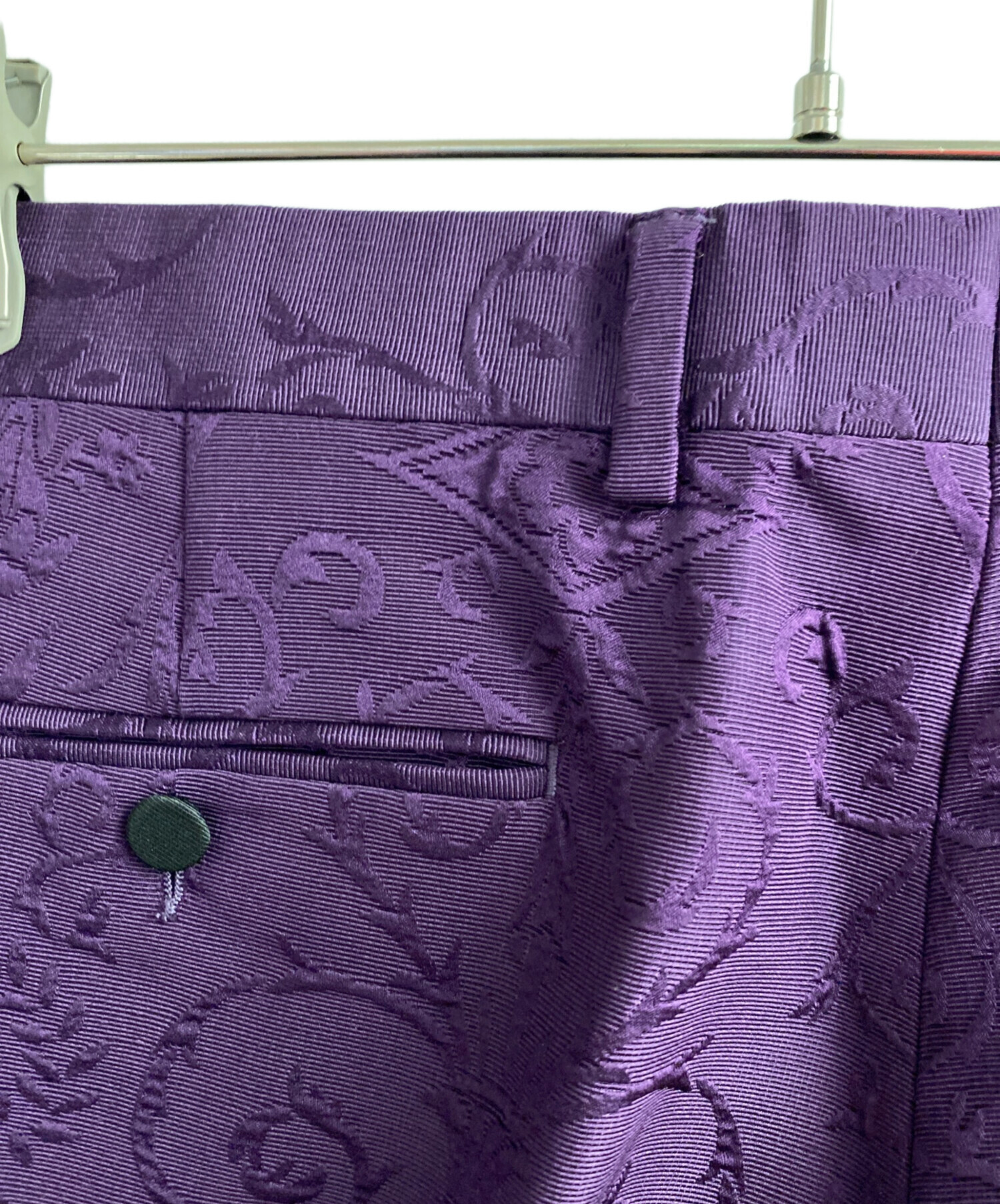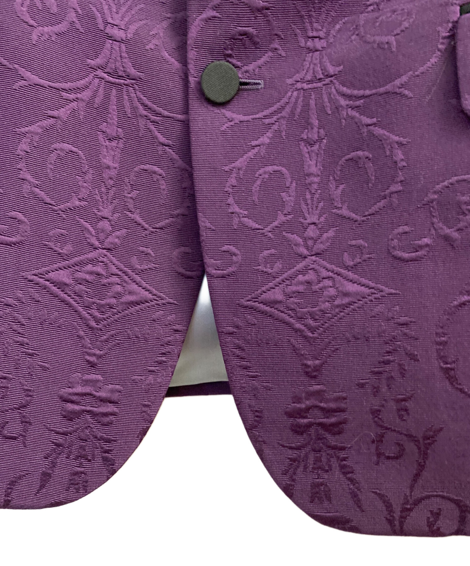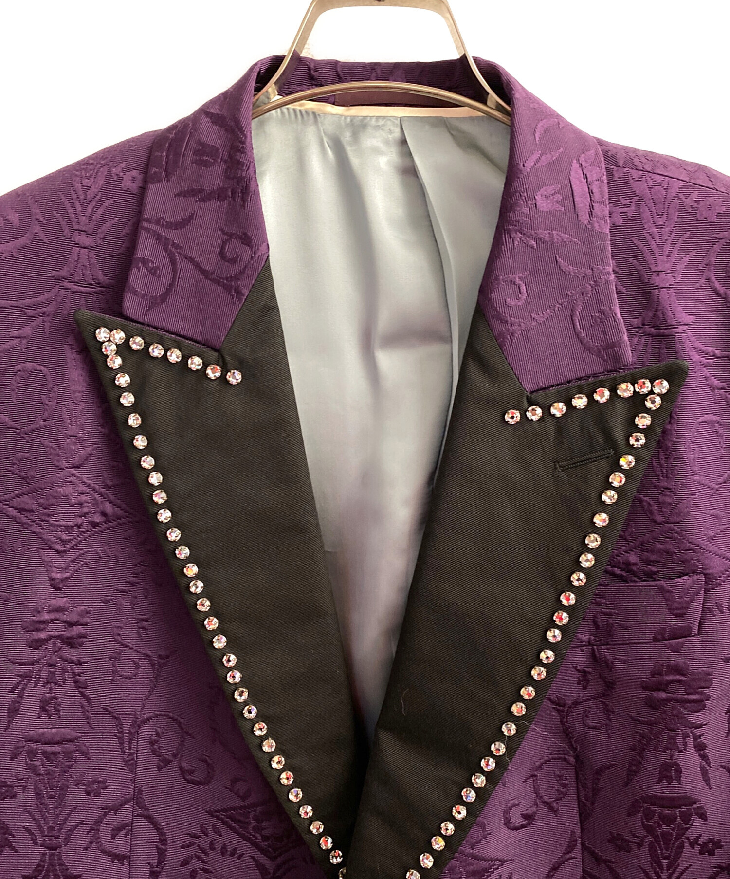 | 素材 | ジャケット 表地:ウール79%・シルク29% 一部:シルク100% 刺繍部分:ガラス繊維 100% メタルパーツ 裏地:レーヨン68%・シルク22% パンツ 表地:毛71%・シルク29% 裏地:レーヨン100% ポケット裏地:ポリエステル65%・コットン35% |
