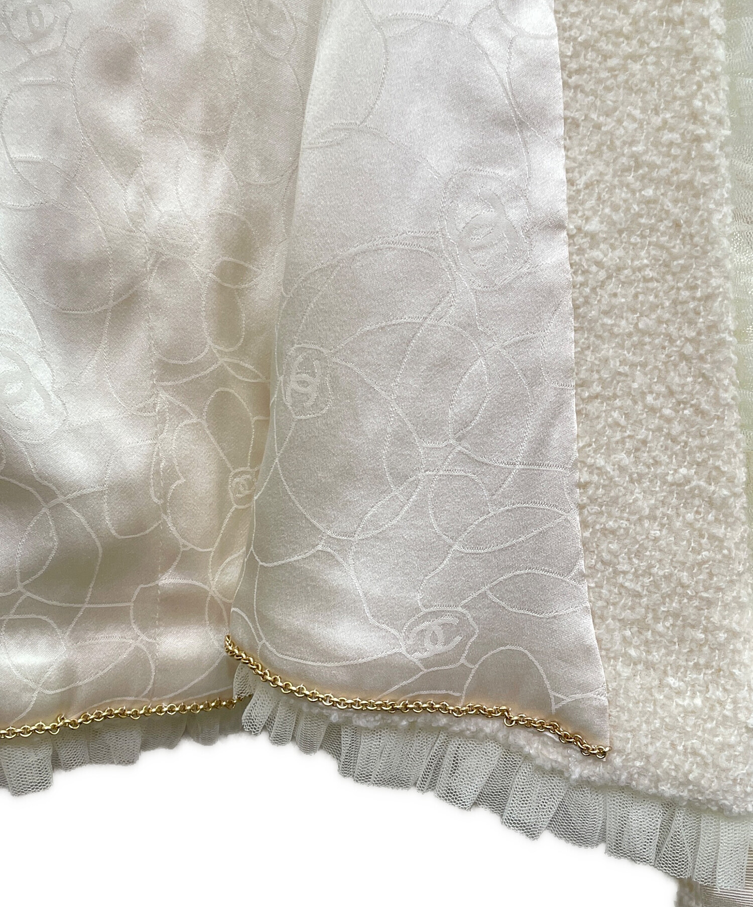 | スタッフコメント | CHANELのノーカラージャケットでございます。スナップボタンが数か所ついており、着用しやすいデザインとなっております。フリルが背面まで施されており、シンプルながらも洗礼されたアイテムでございます。デニムを合わせてカジュアルに着たり、ワンピースの上から羽織ってラグジュアリーに着たり様々な合わせ方をお楽しみいただけます。 |
