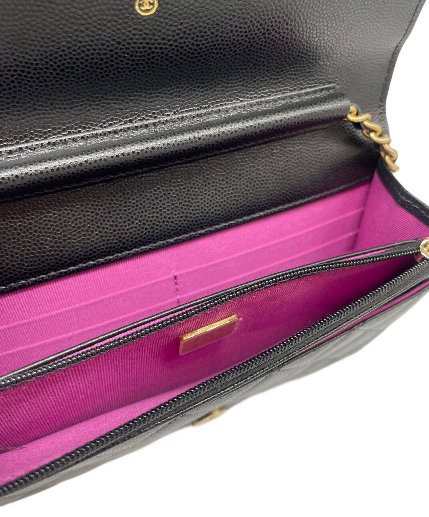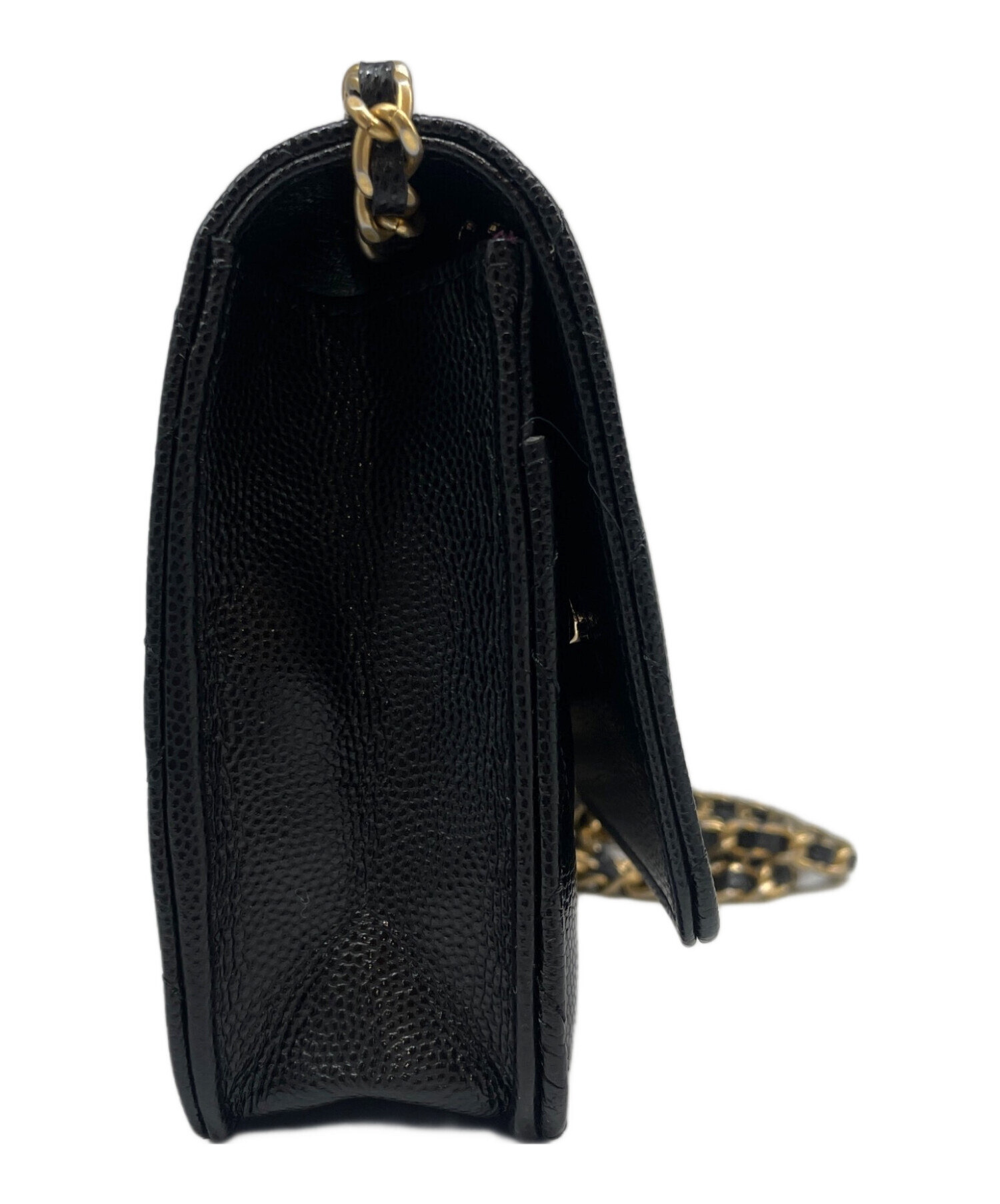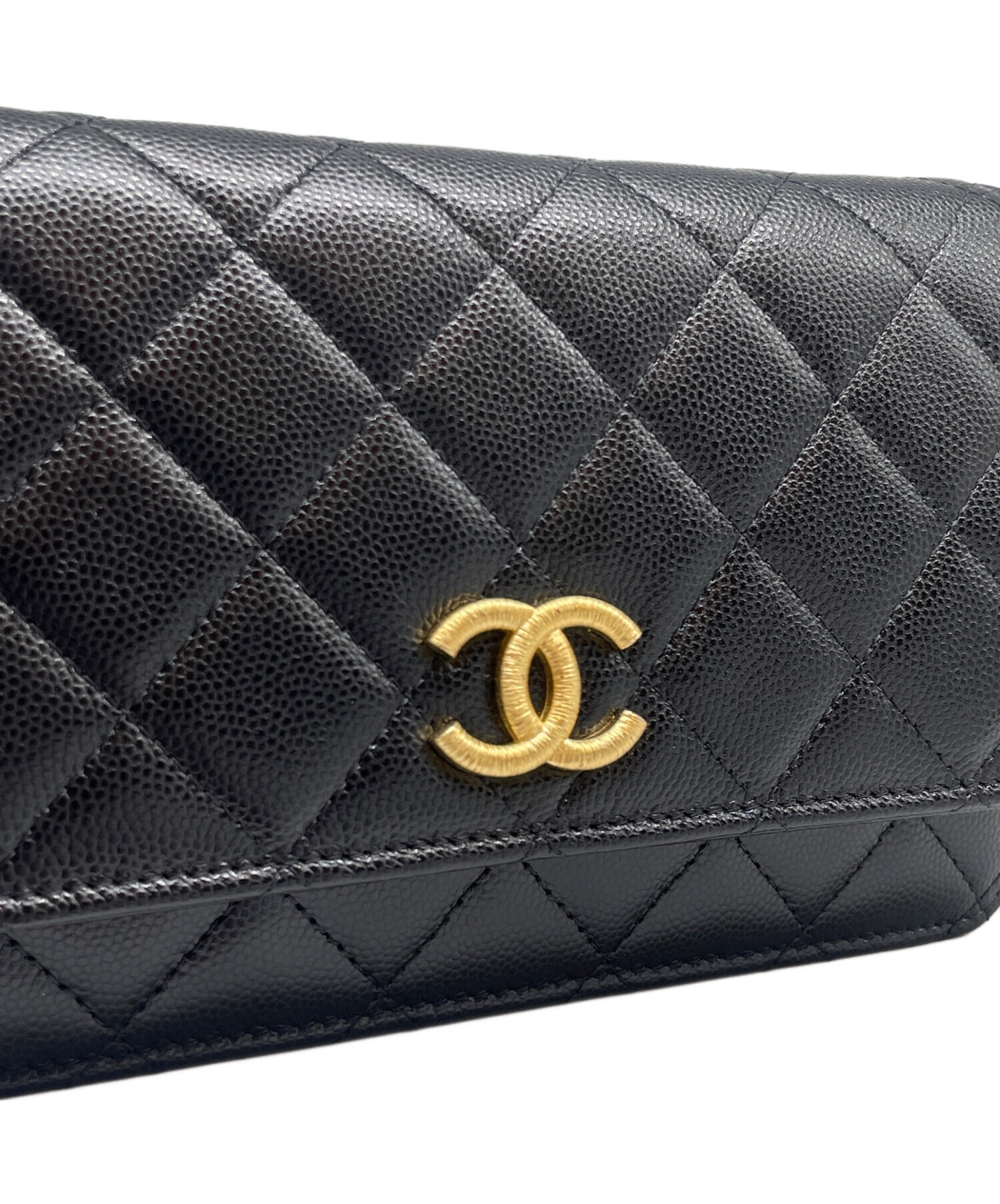 スタッフコメント アイコニックなマトラッセパターンを施した、CHANELのチェーンウォレットでございます。素材には上質なキャビアスキンを使用しており、特有のシボ点によりダメージが目立ちにくい点も魅力的です。財布とミニバッグの両アイテムの良いとこ取りをしたコンパクトなサイズ感で、ちょっとしたお出かけやコーデのアクセントにぴったりでございます。