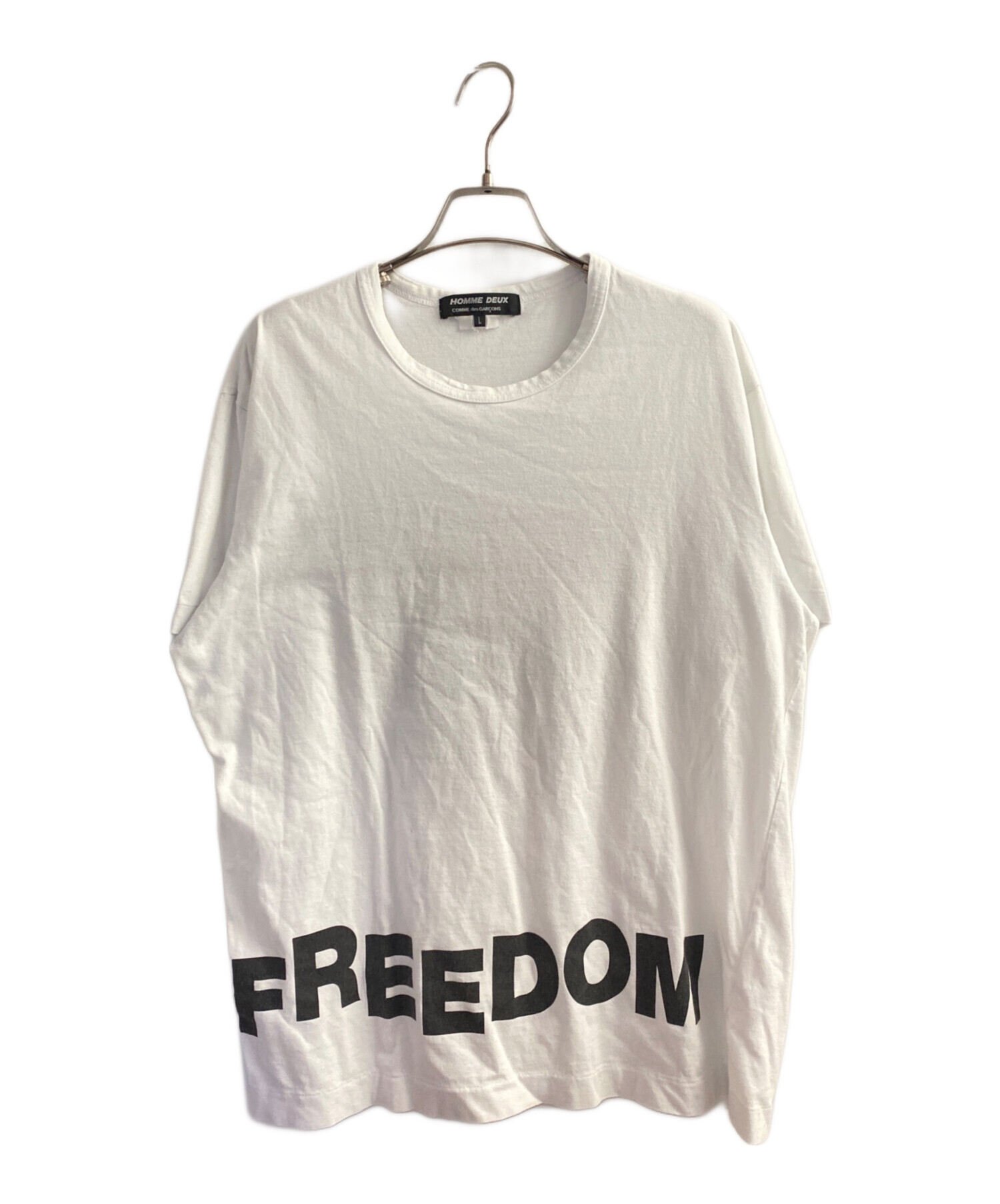 | スタッフコメント | フロントに大胆に配された“FREEDOM”のロゴが印象的なカットソー。ホワイトボディにブラックプリントが映え、シンプルながらも強いメッセージ性を感じさせるデザインです。ゆとりのあるシルエットでリラックス感があり、一枚でスタイリングの主役として活躍。カジュアルからモードまで幅広く取り入れやすい一着です。 |