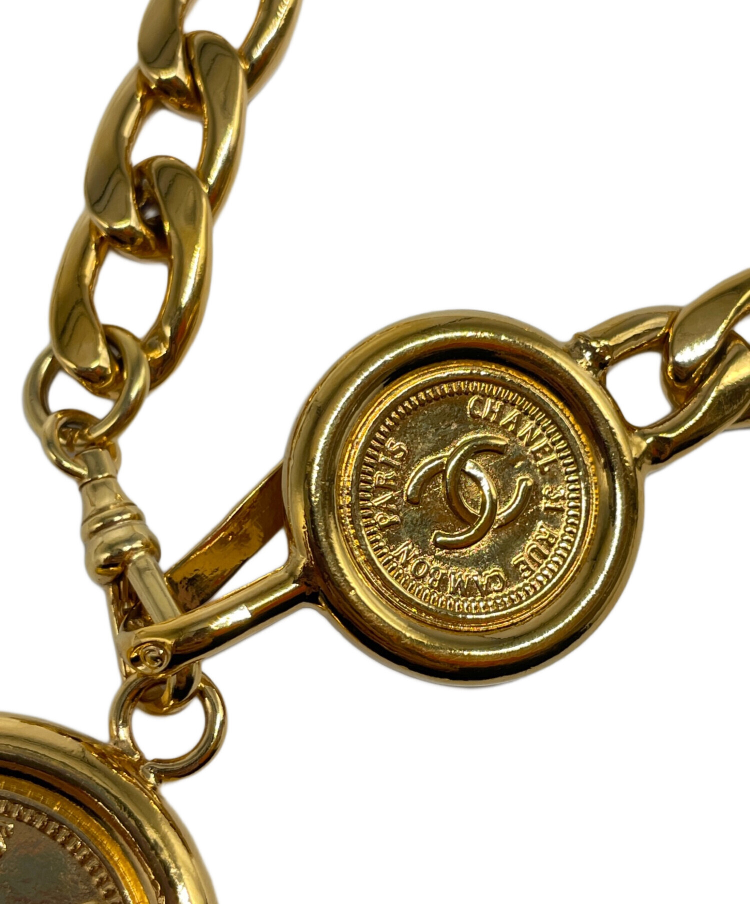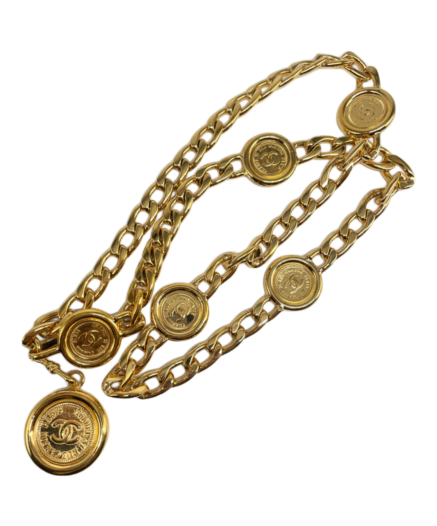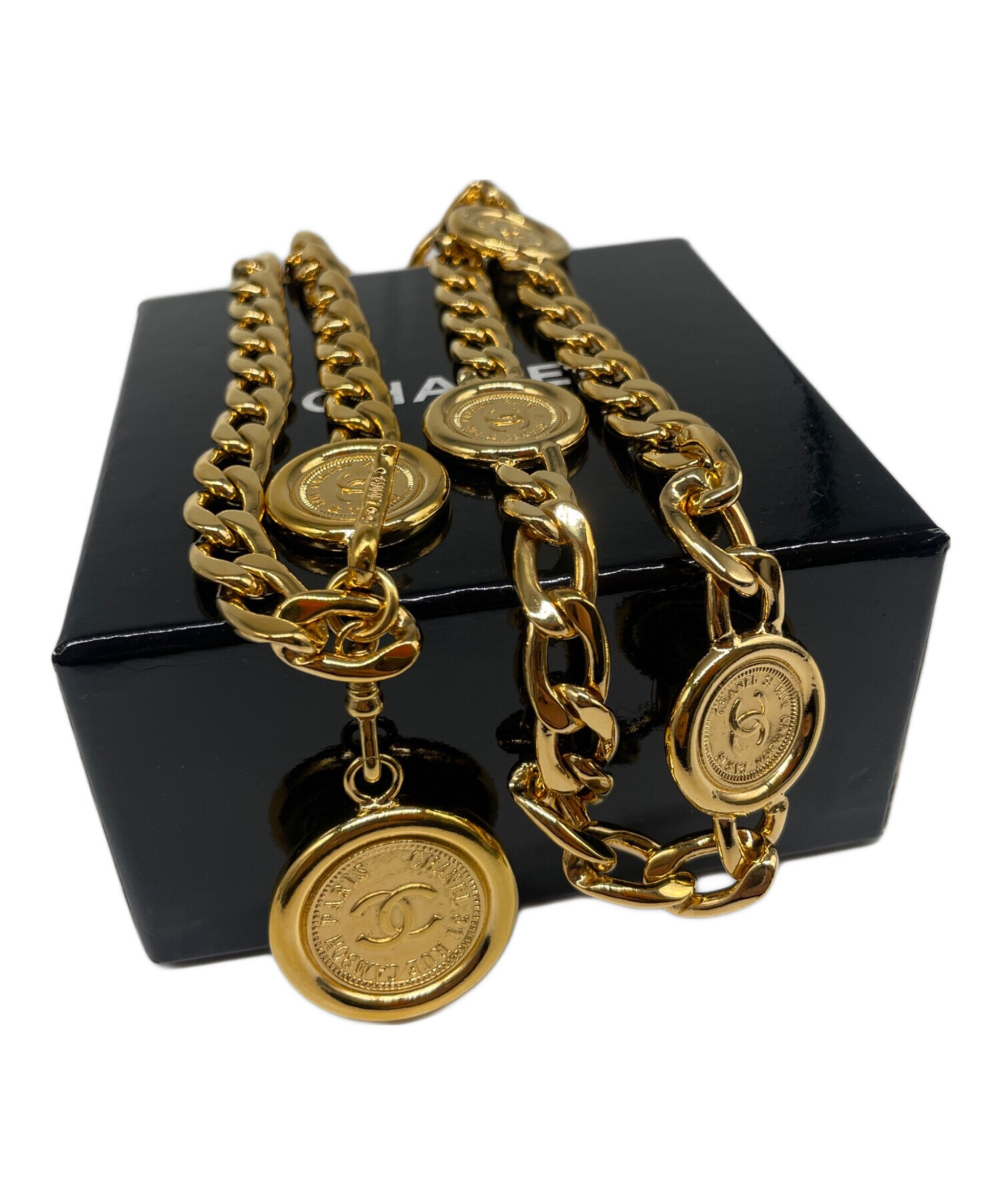 | スタッフコメント | 光沢のあるゴールドの輝きが圧倒的な存在感を放つ、シャネルのチェーンベルトです。レザーを編み込まない潔いメタルのみのデザインが、モードで洗練されたタイムレスな美しさを演出します。ウエストマークはもちろん、腰に落としたりネックレスとして使ったりと、装いを一瞬でクラスアップさせる至高のアクセサリーです。 |