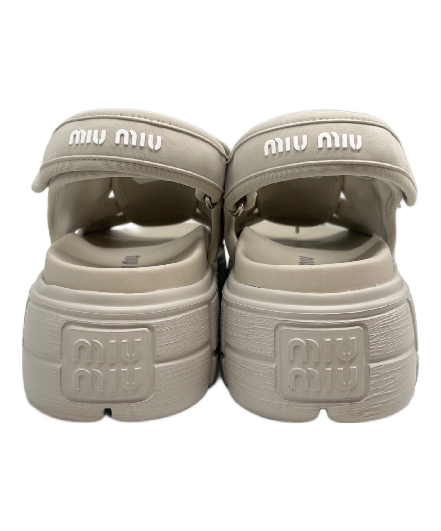 スタッフコメント こちら、 MIU MIUのサンダルでございます。ライトグレーサンダルは、ブランドの持つ上品な可愛らしさと現代的なカジュアルさが融合したアイテムです。淡いグレーは、デニムなどのカジュアルスタイルから、きれいめのワンピースまで、足元を明るく軽やかに見せてくれます。