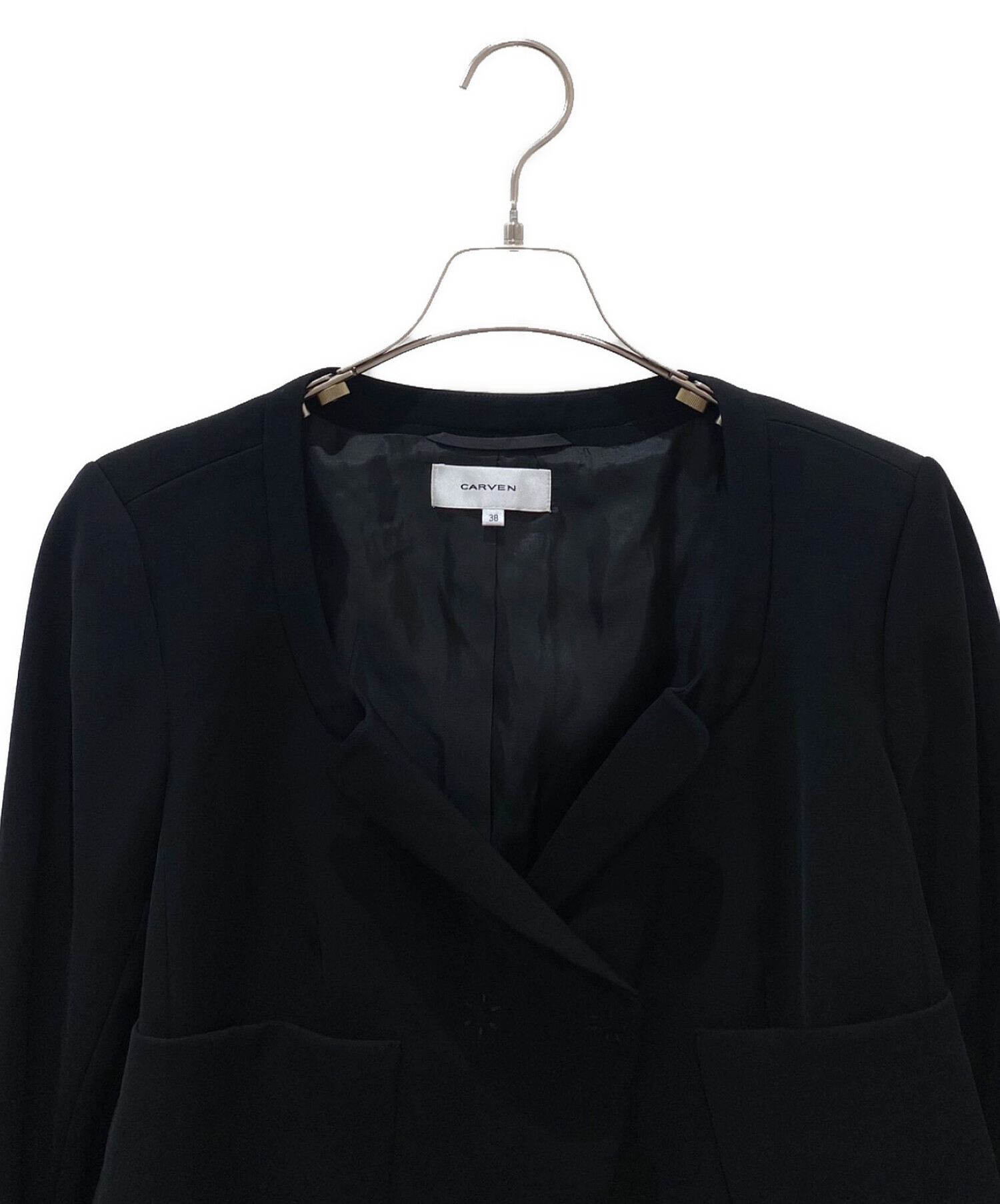 | スタッフコメント | カルヴェンのクロップド丈のジャケットでございます。襟やボタン部分のデザインが特徴的で、ワントーンでも地味になり過ぎず、存在感あるアイテムです。フォーマルな着こなしにぴったりの一枚ですが、カジュアルなスタイルにもクロップド丈が良い味を出します。 |