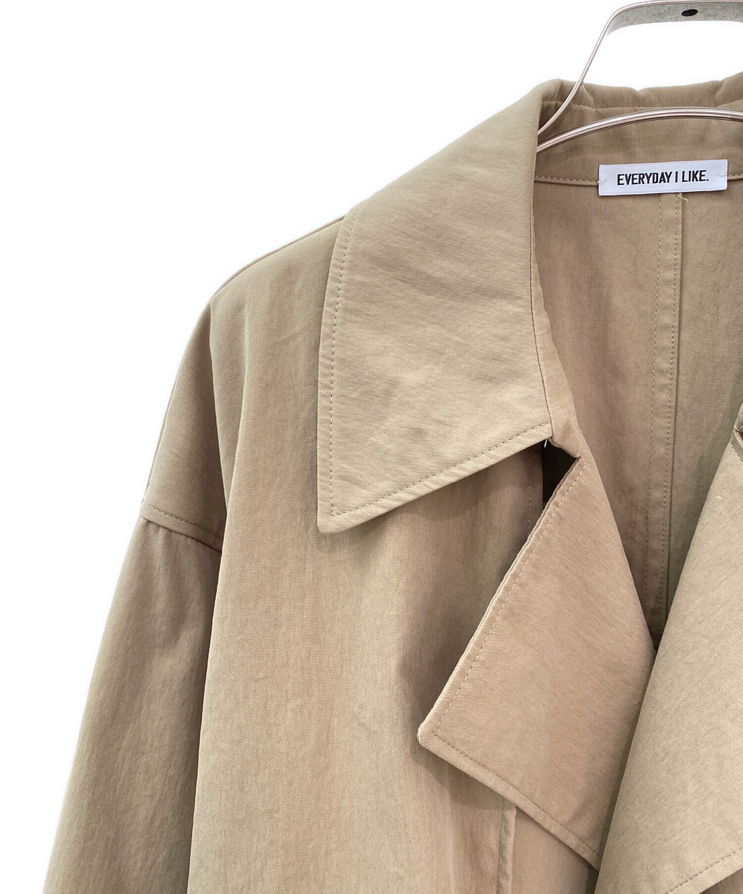 スタッフコメント EVERYDAY I LIKE.のトレンチコートでございます。ボタンが付いていないデザインで、付属のベルトを前で締めていただいたり、後ろで結んで前開きで着ていただくこともできます。シーンに合わせて着こなせるアイテムでございます。
