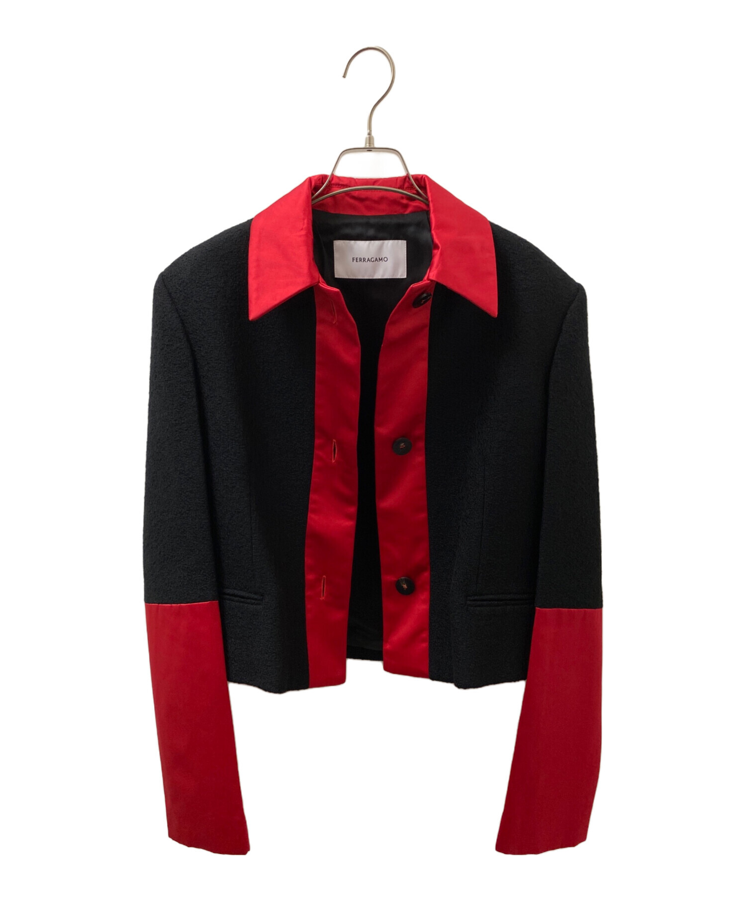 | スタッフコメント | エレガンスとモダンさを兼ね備えた、Ferragamoらしい洗練されたデザインのジャケット。ブラックをベースに、レッドの切り替えが映える上品な配色で、スタイリングの主役になる一着です。構築的なシルエットが美しく、羽織るだけでクラス感のある印象に。フォーマルシーンから特別な日の装いまで、幅広く活躍するアイテムです。 |