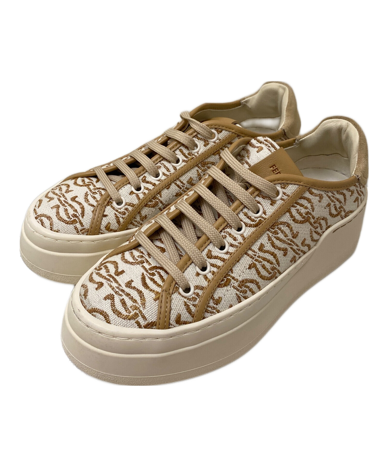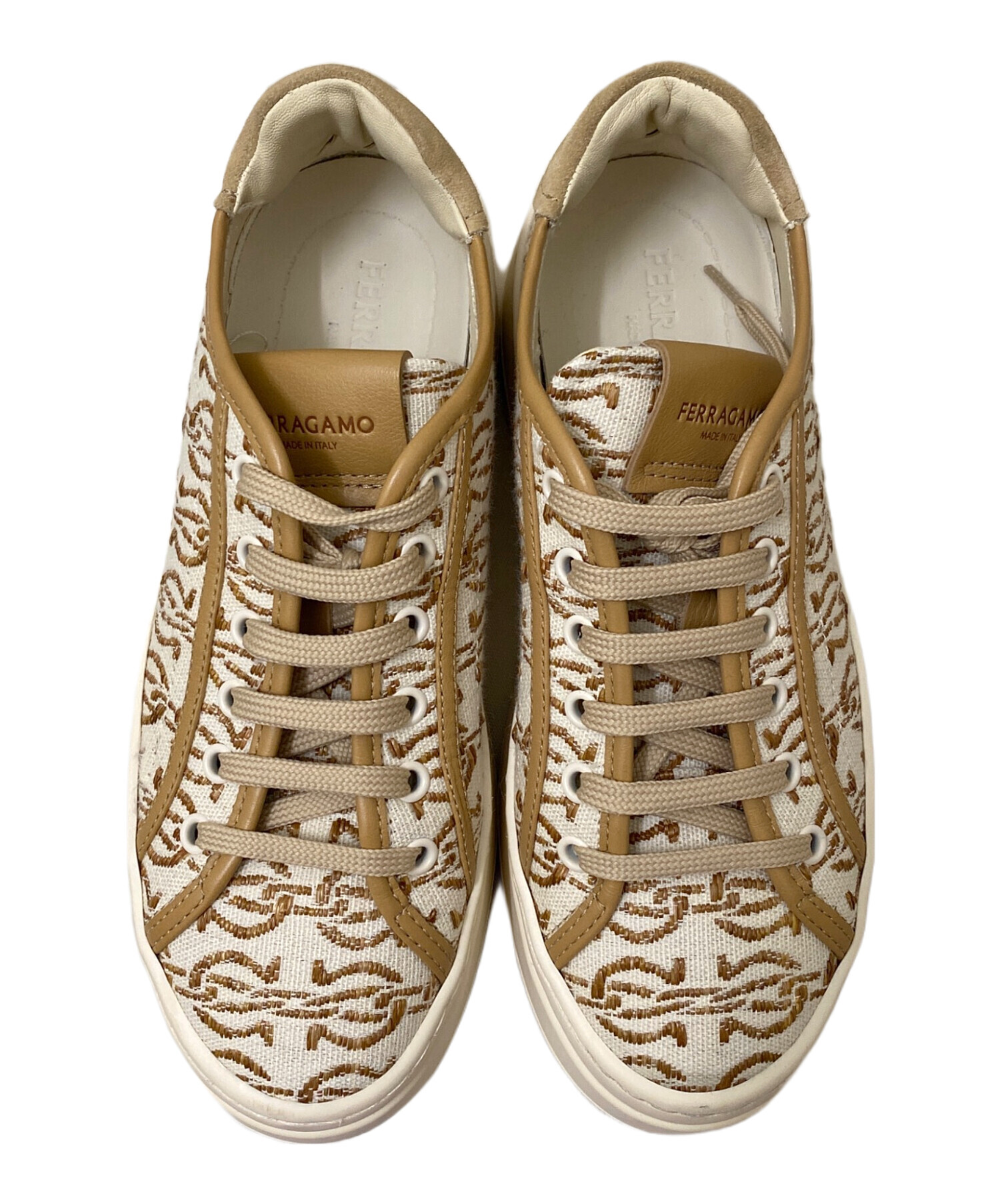 | スタッフコメント | アイボリー×ベージュのジャガードと厚底のソールが印象的なスニーカーでございます。カジュアルな中にディティールがこだわられ、FERRAGAMOらしい高級感のある一足になっております。 |