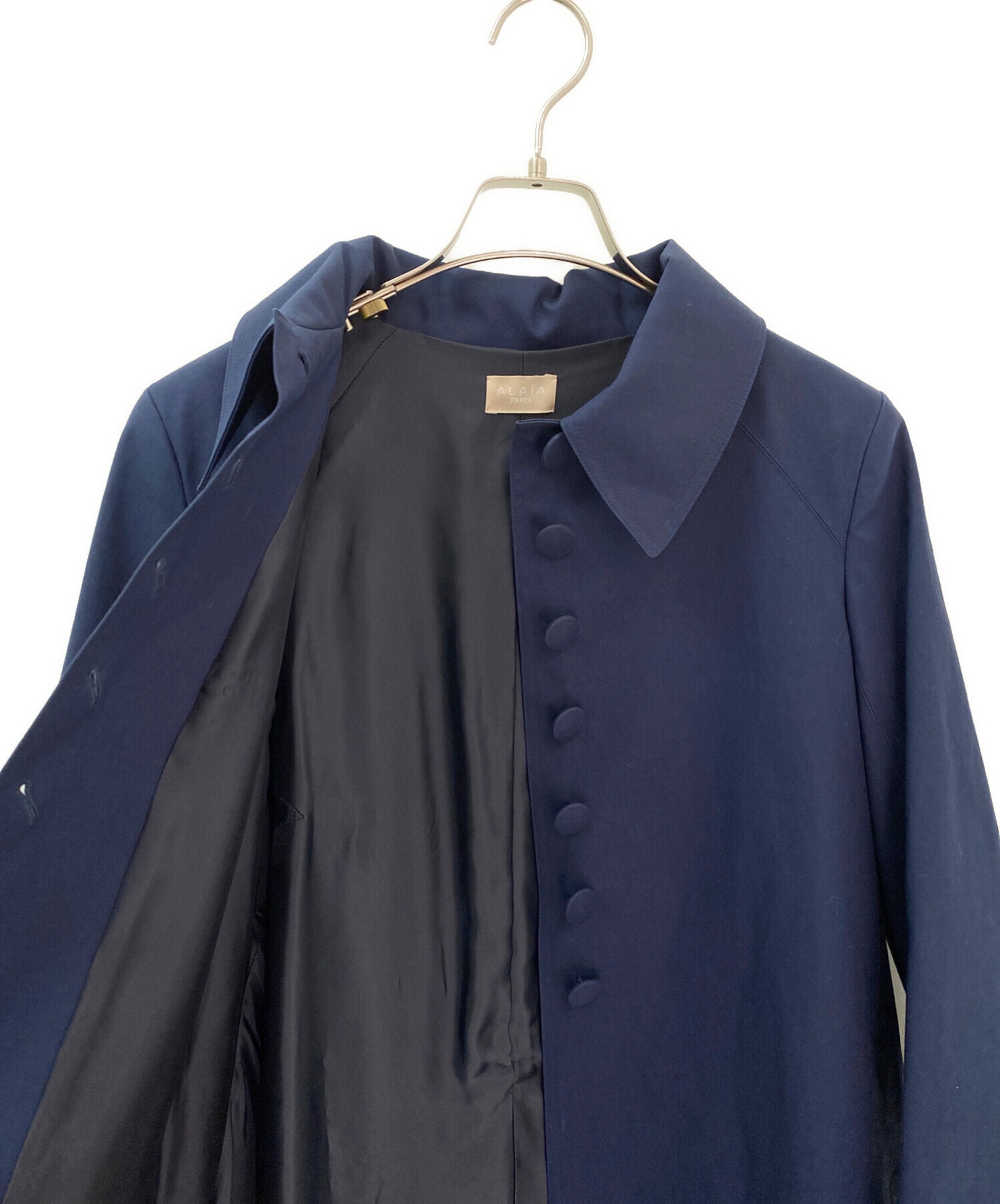 スタッフコメント ALAIAならではの構築的な美しさが際立つ、洗練されたステンカラーコート。深みのあるネイビーカラーが上品で落ち着いた印象を与え、ミニマルながらも存在感のある佇まいに仕上げられています。計算されたカッティングと立体的なシルエットが、羽織るだけで美しいラインを演出。程よい丈感で幅広いスタイリングに合わせやすく、オンオフ問わず活躍します。