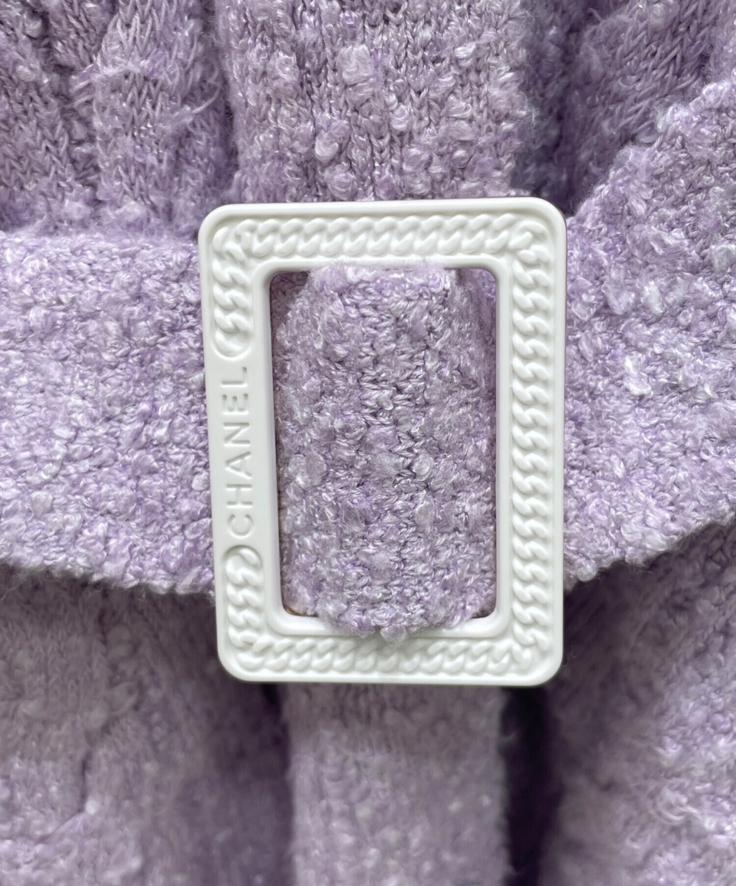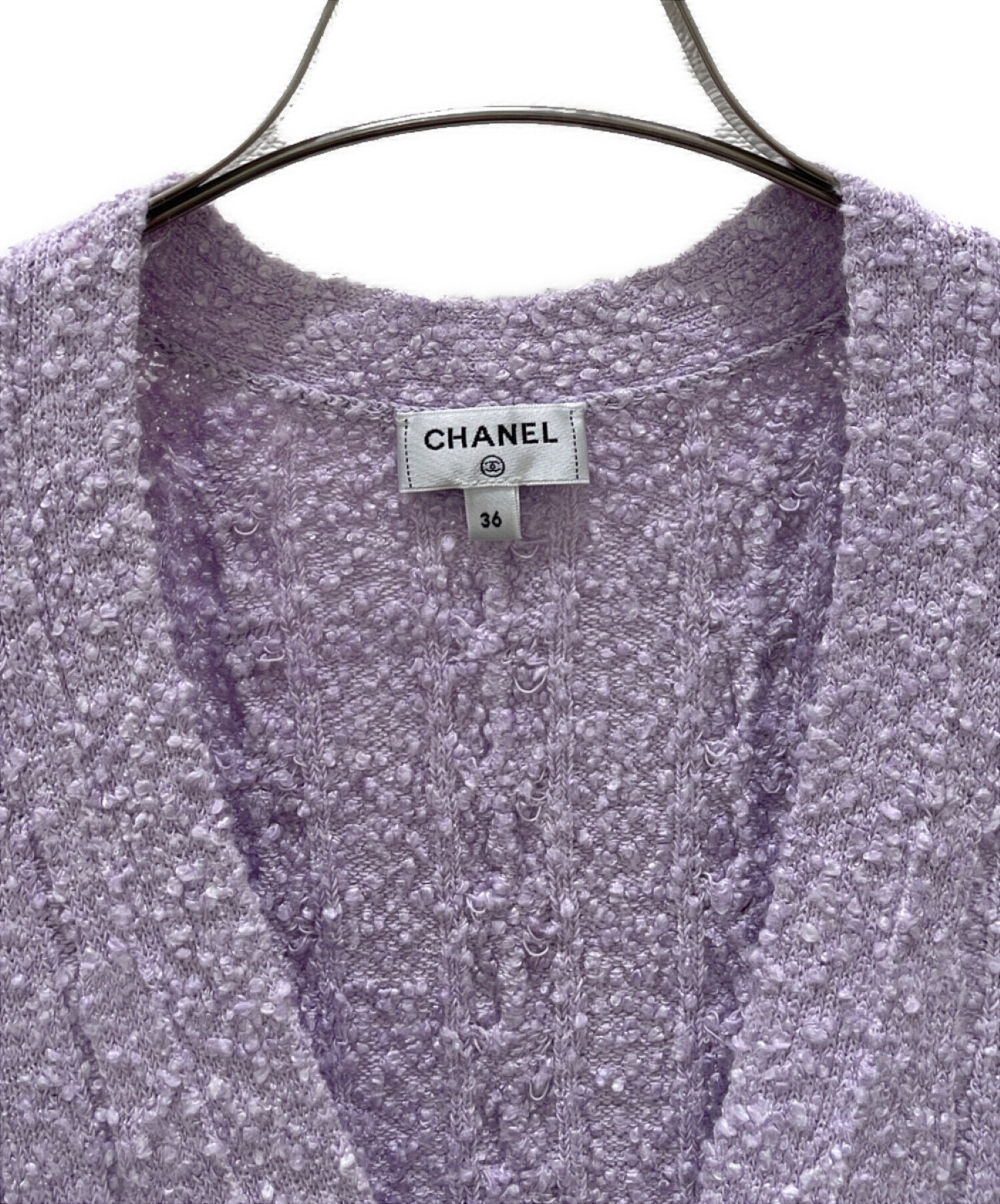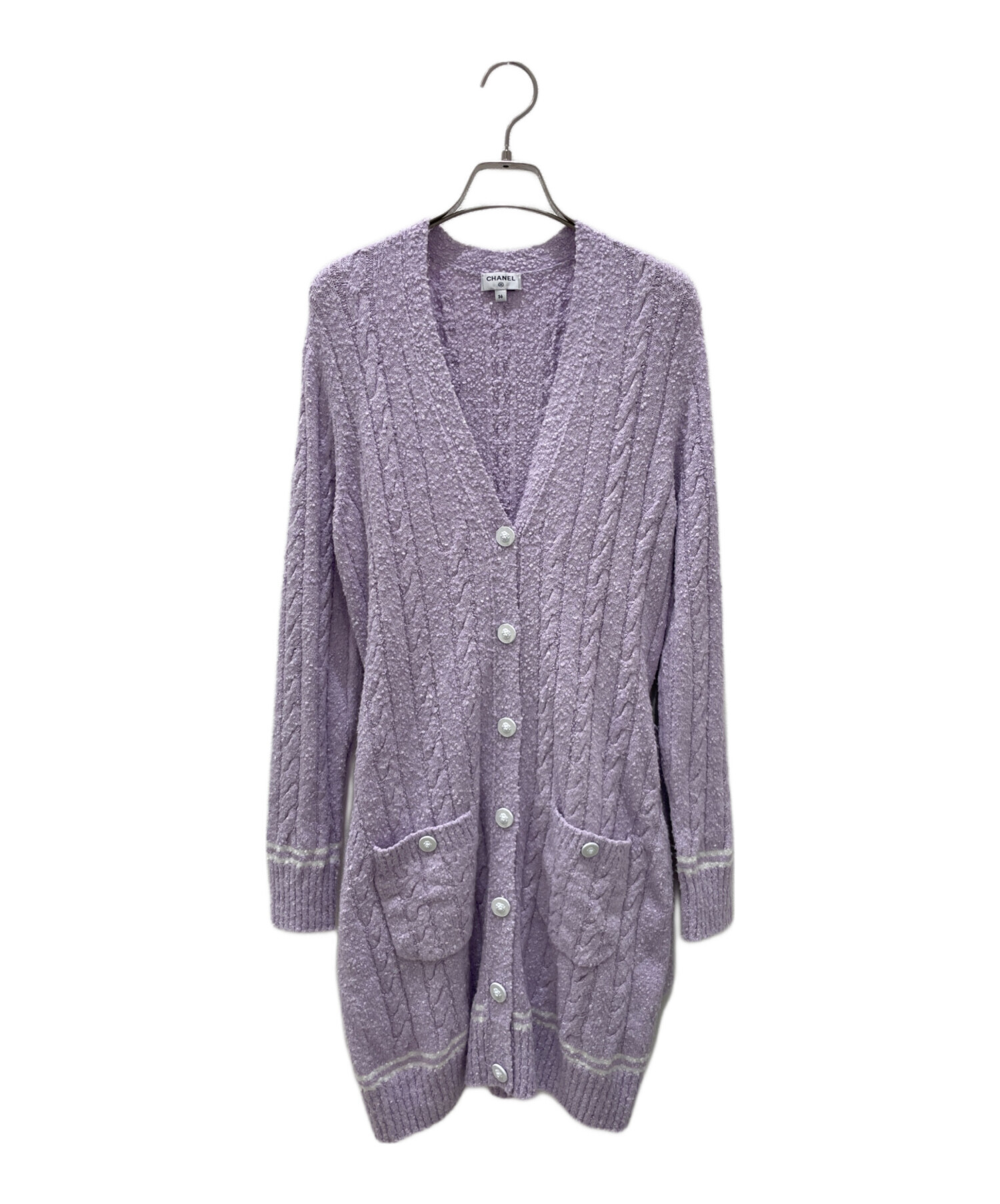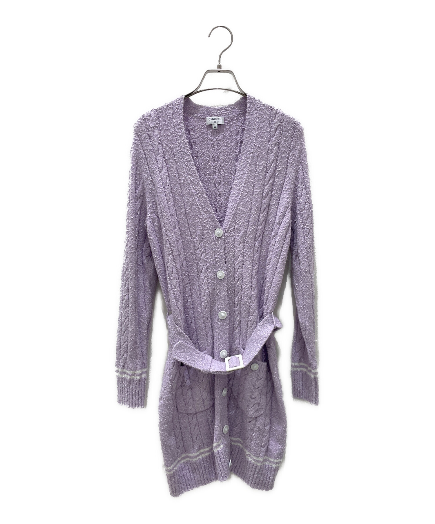 スタッフコメント バイオレットカラーが可愛らしい、CHANELのカーディガンでございます。長めの丈感で、柔らかく羽織ものとしてお使いいただけるアイテムです。また、ベルト部分にはブランドロゴがデザインされております。